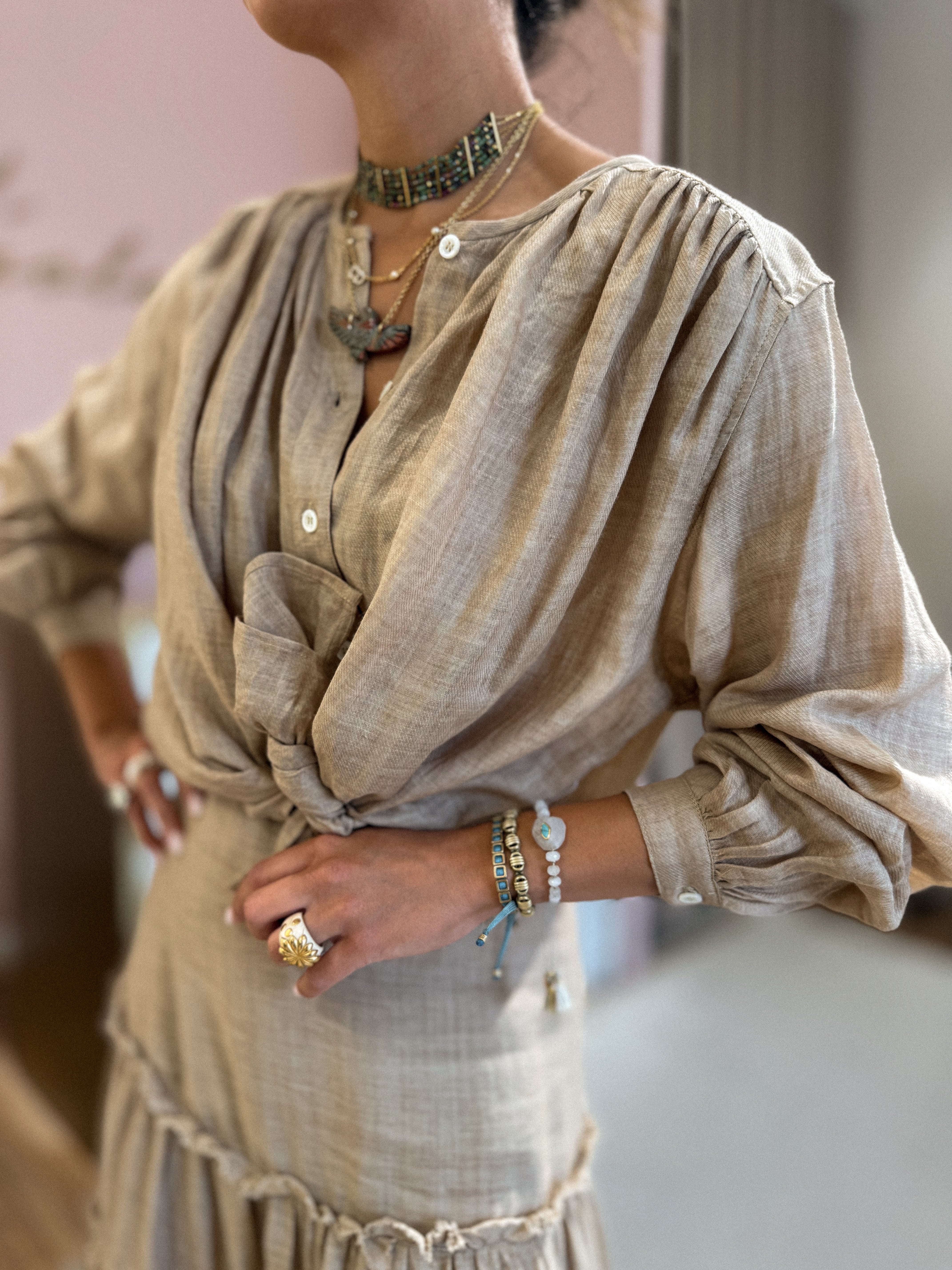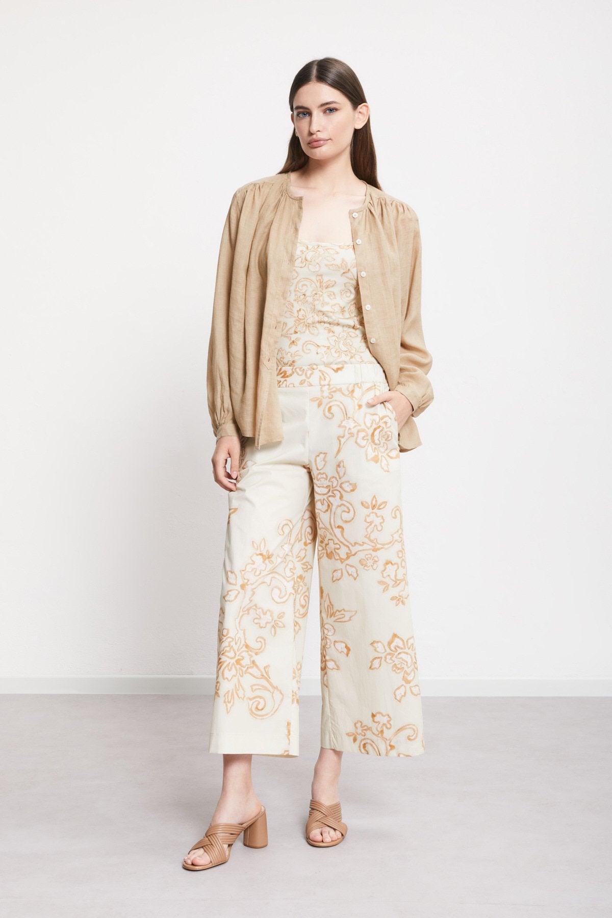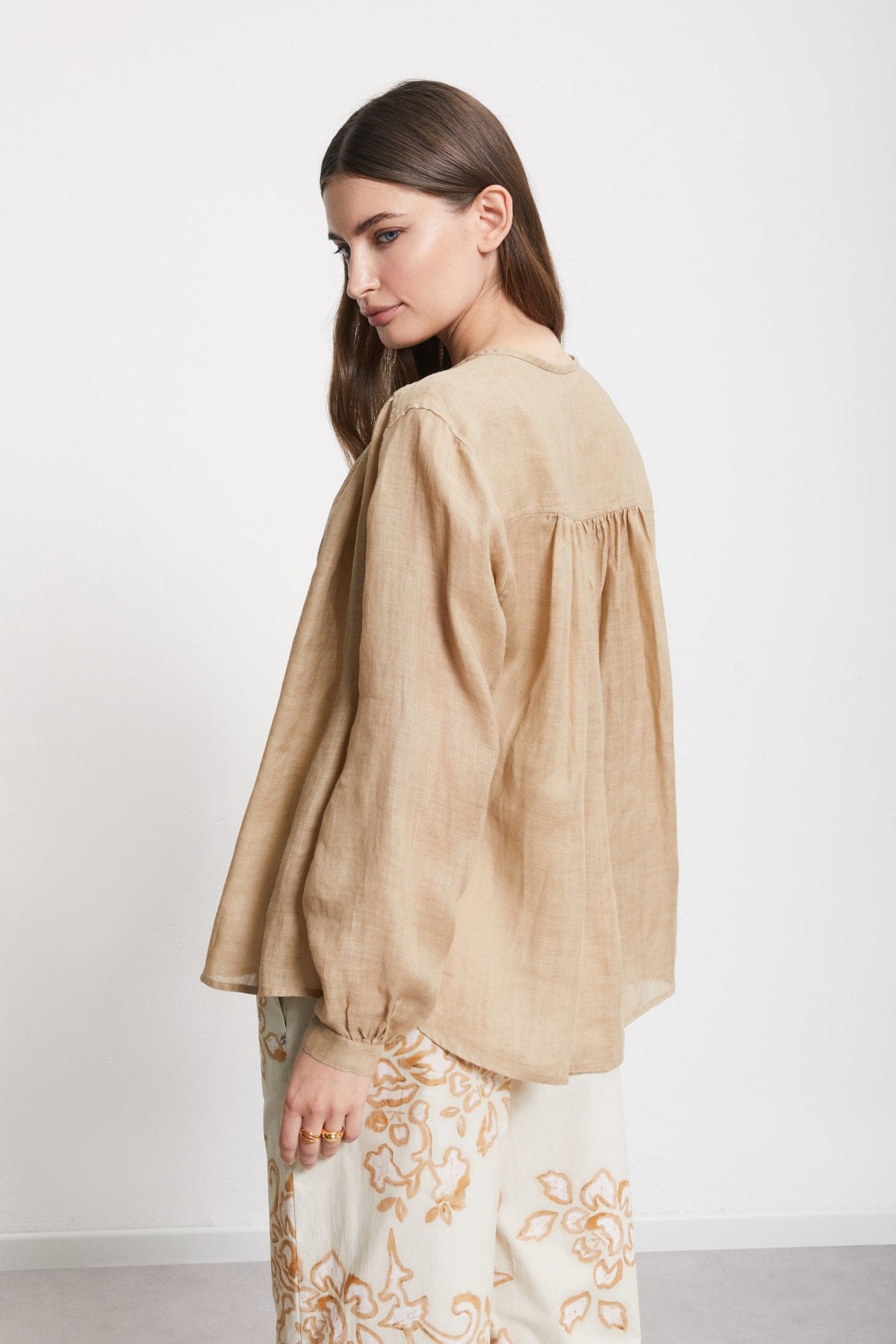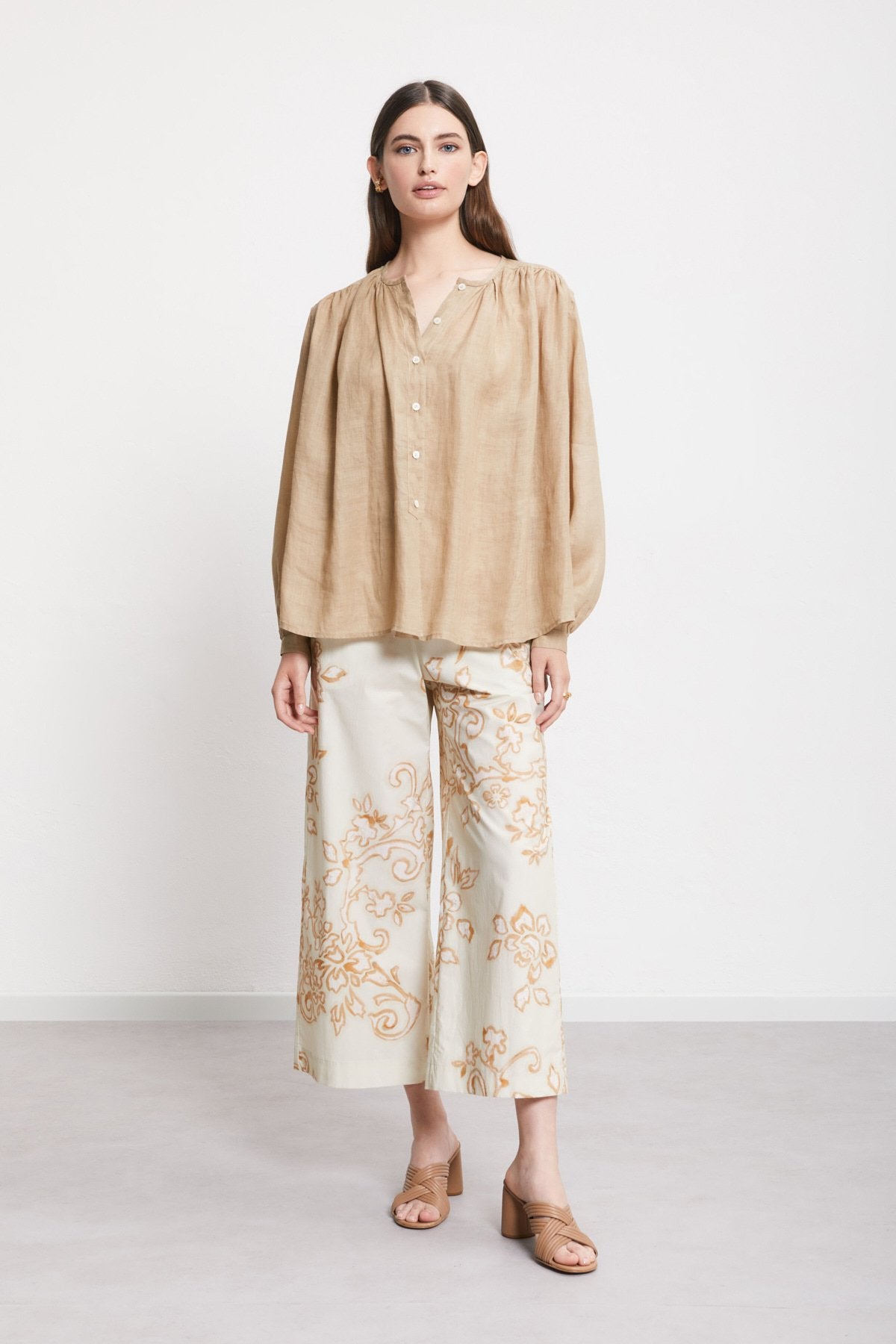 Camisa bege Ottod'ame em linho com pregas nas mangas e costas, manga comprida, gola subida.