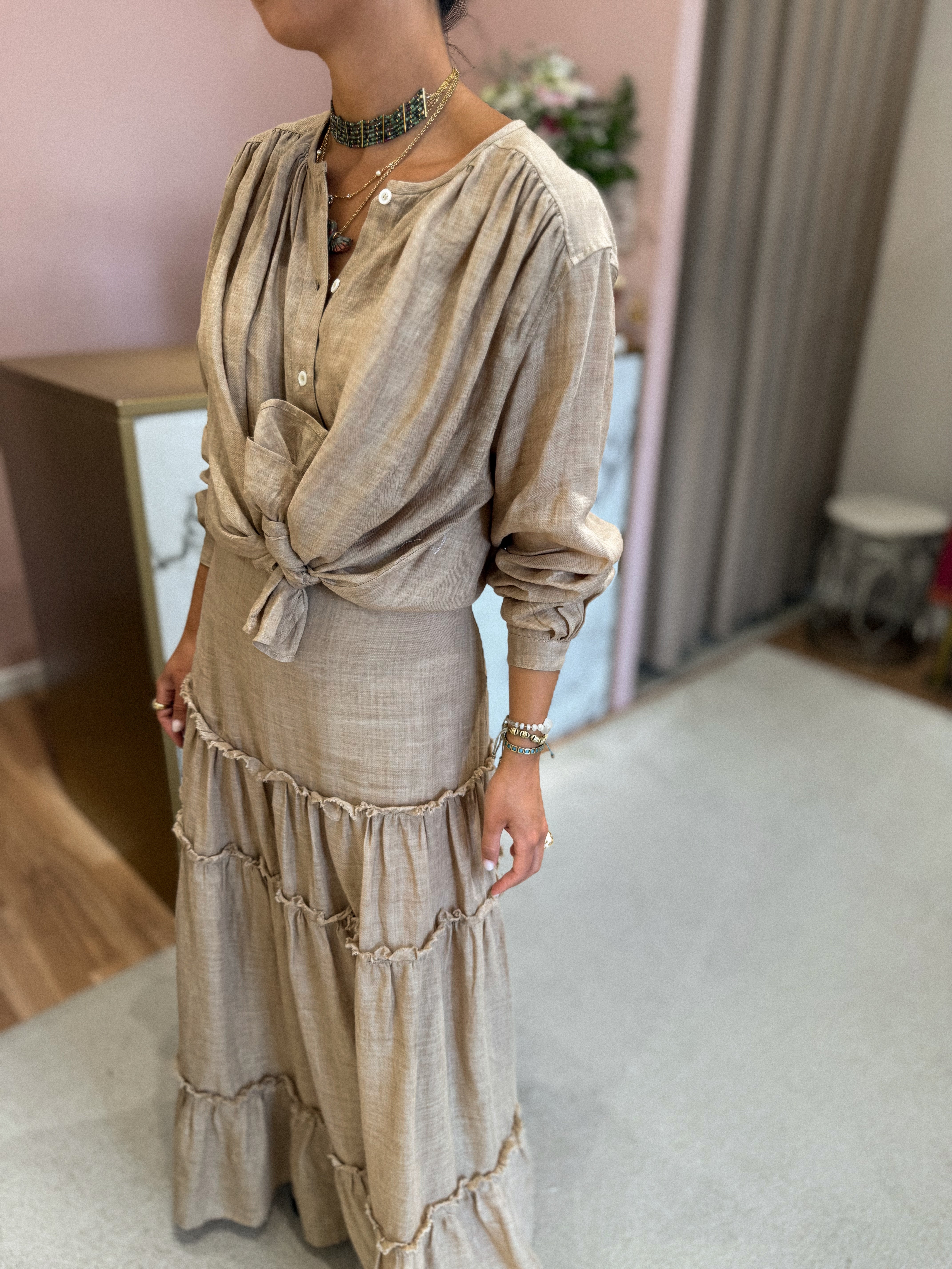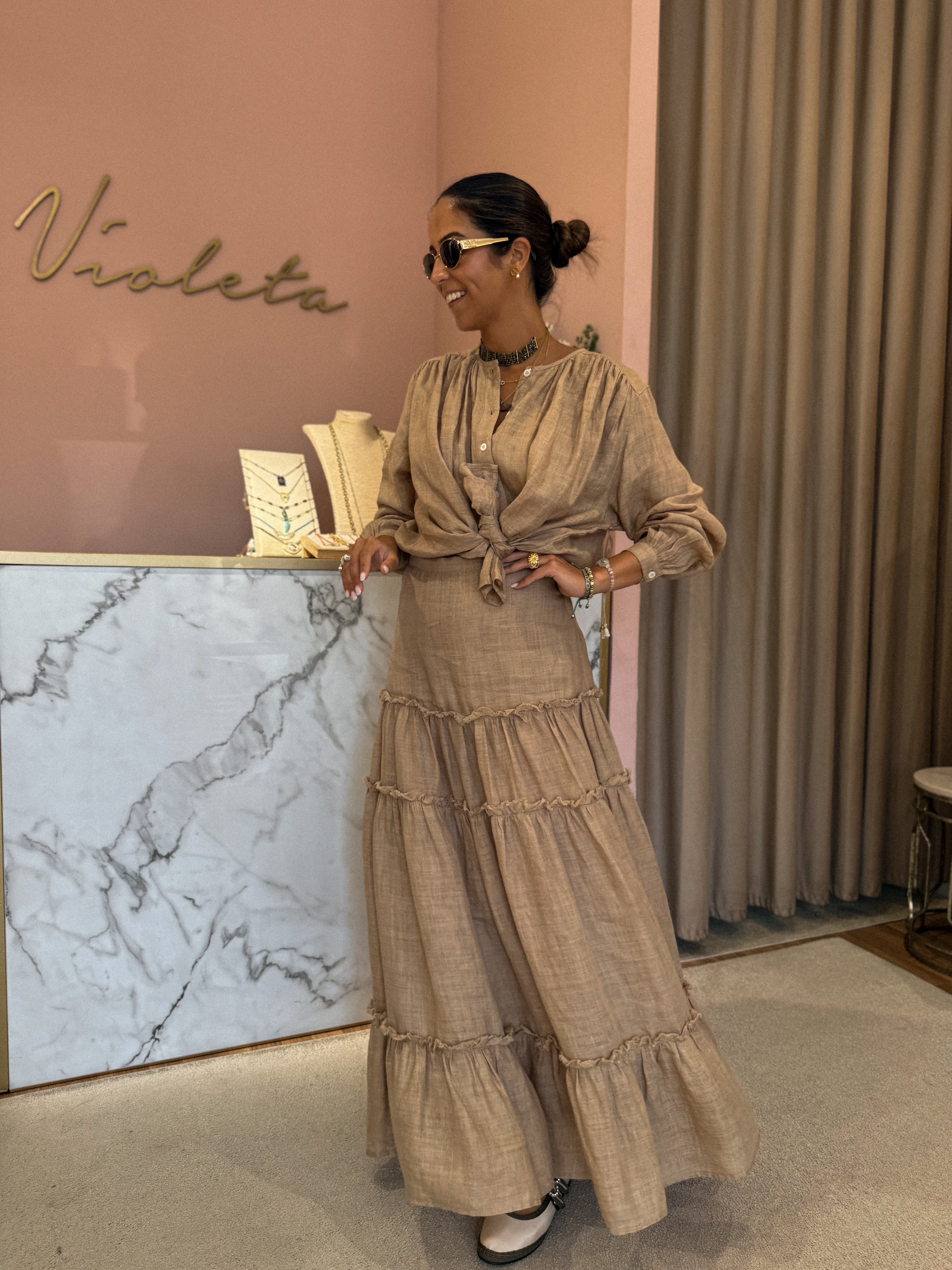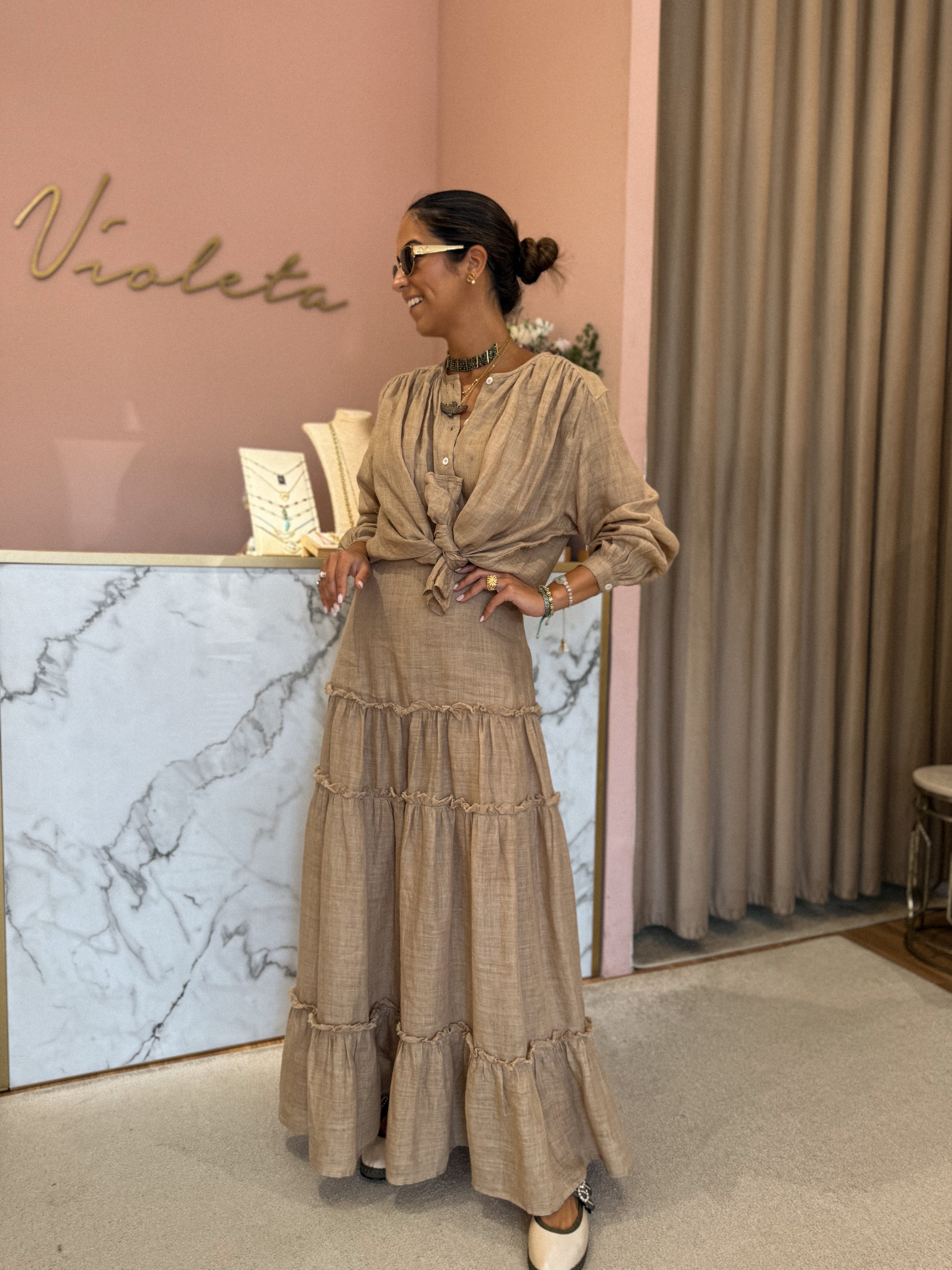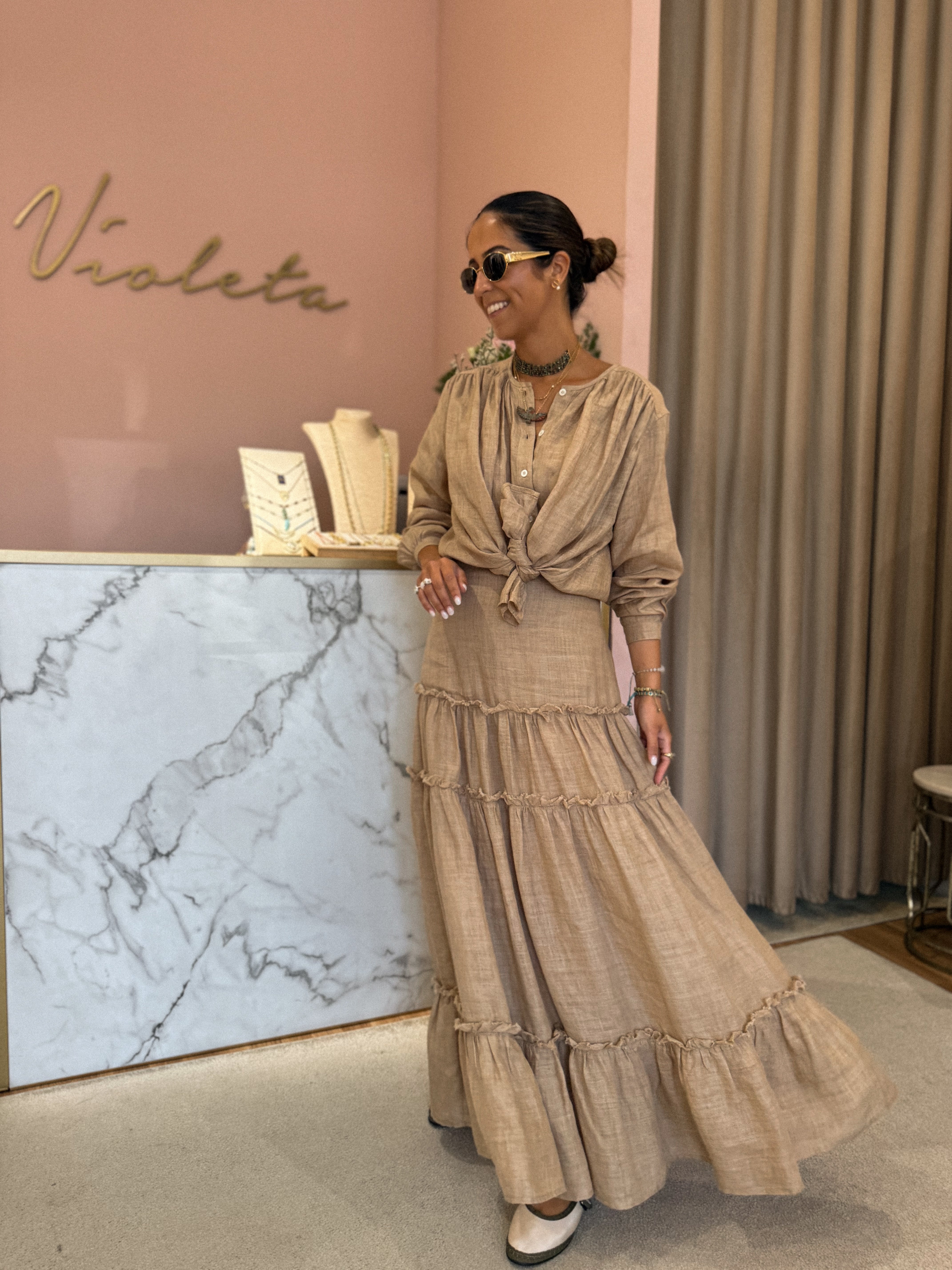 Camisa bege Ottod'ame em linho com pregas nas mangas e costas, manga comprida, gola subida.