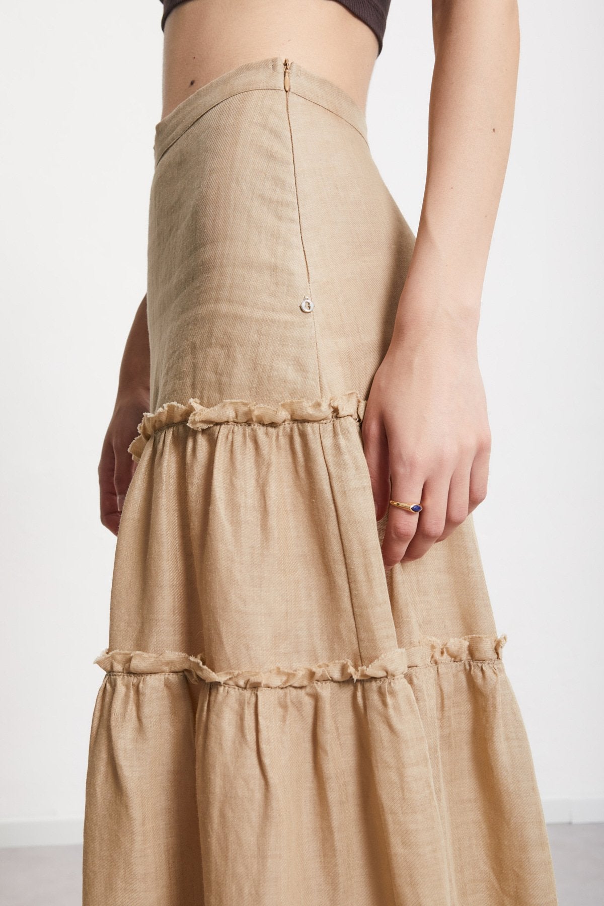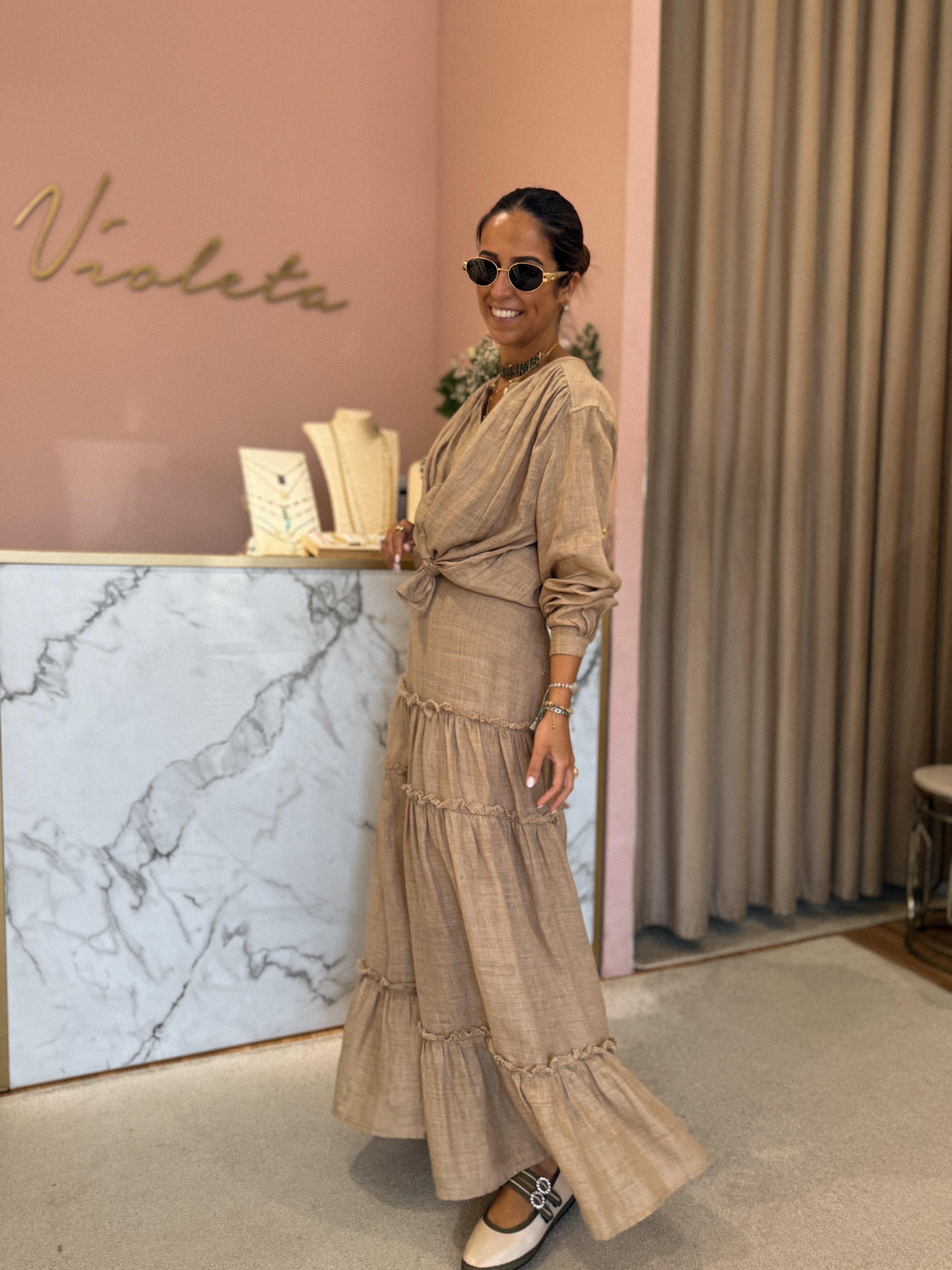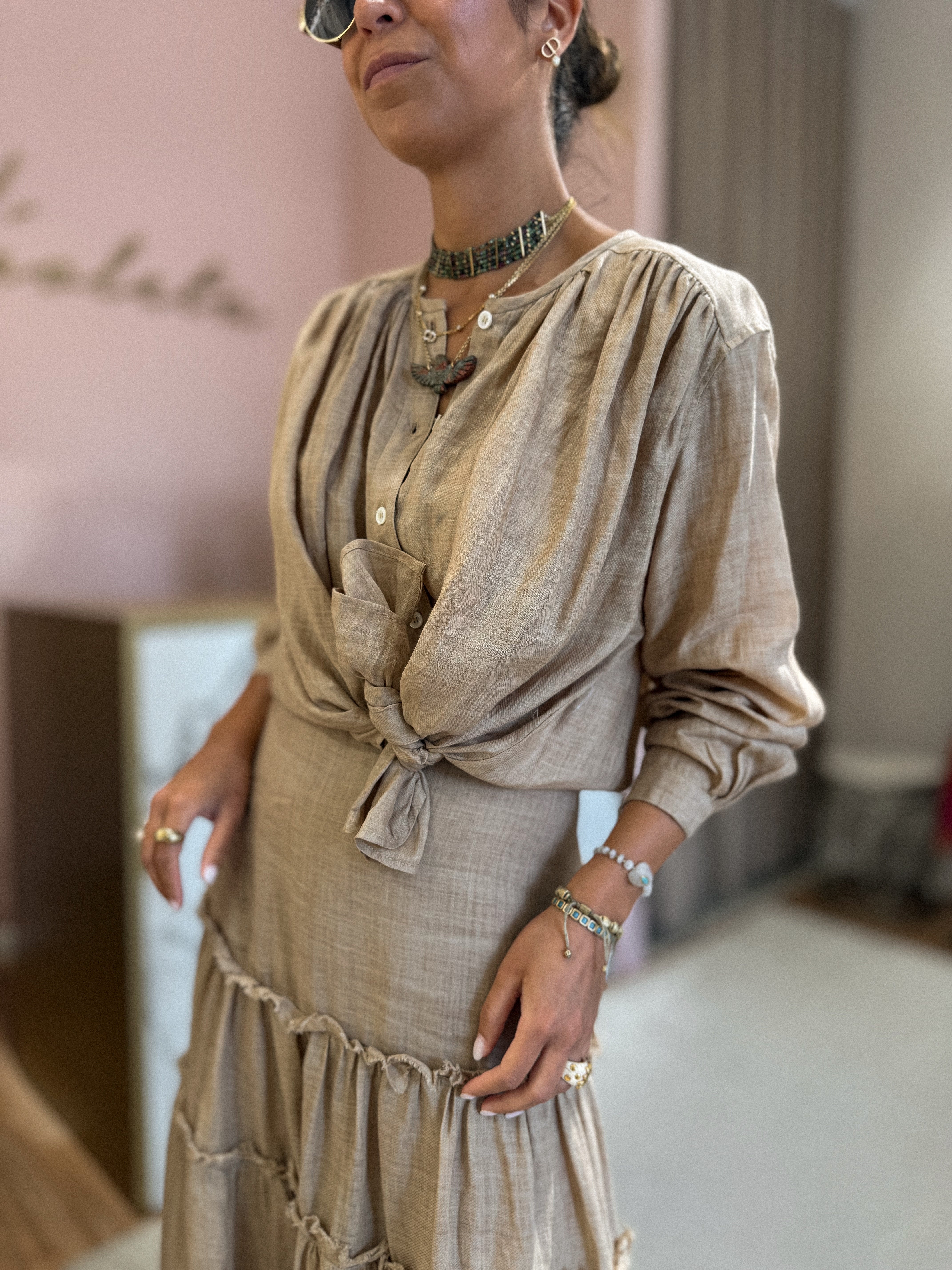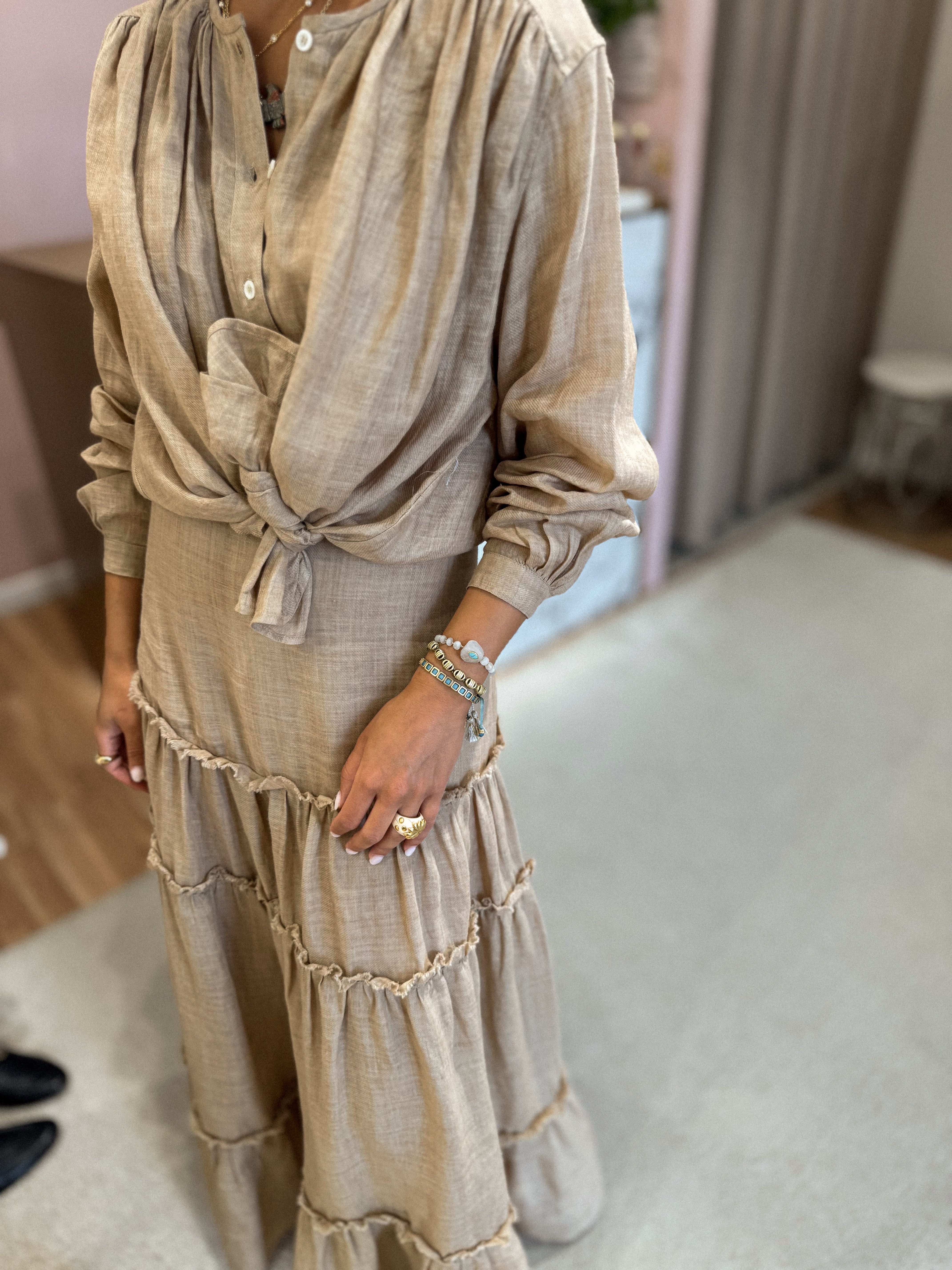 Camisa bege Ottod'ame em linho com pregas nas mangas e costas, manga comprida, gola subida.