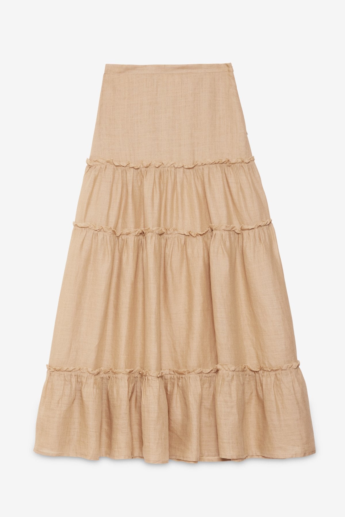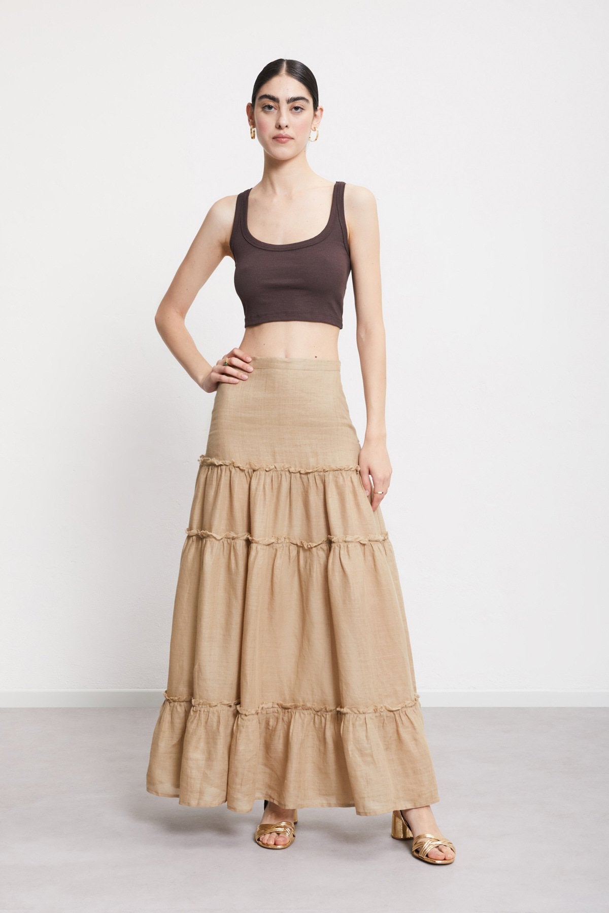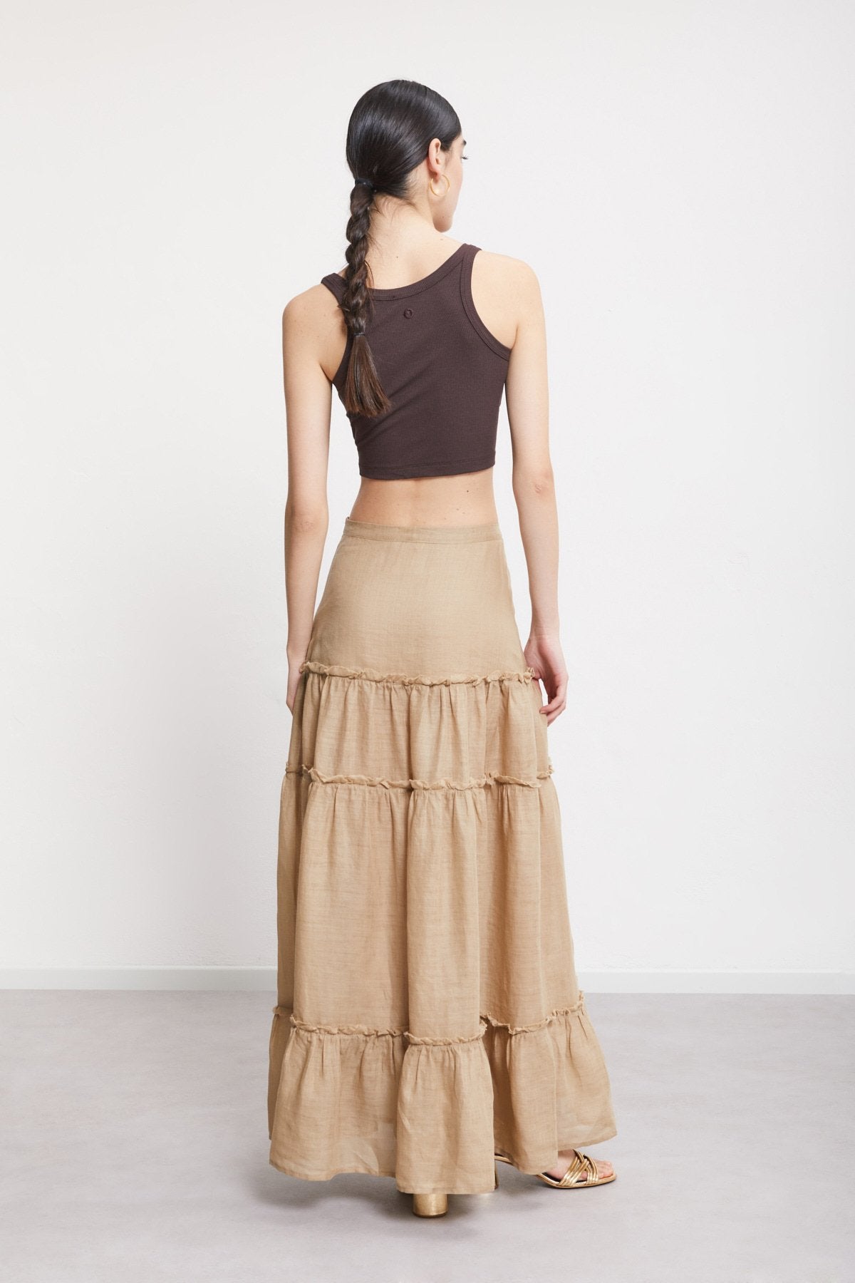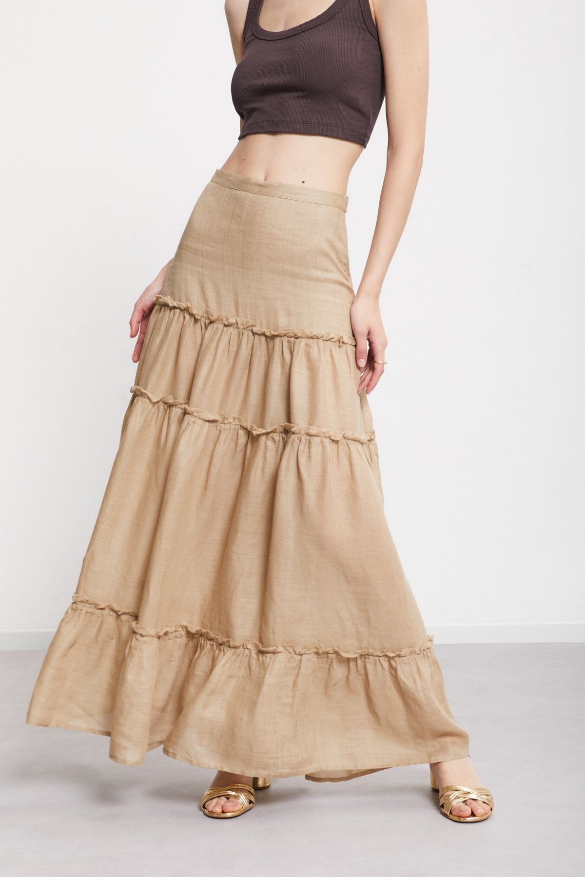Camisa bege Ottod'ame em linho com pregas nas mangas e costas, manga comprida, gola subida.