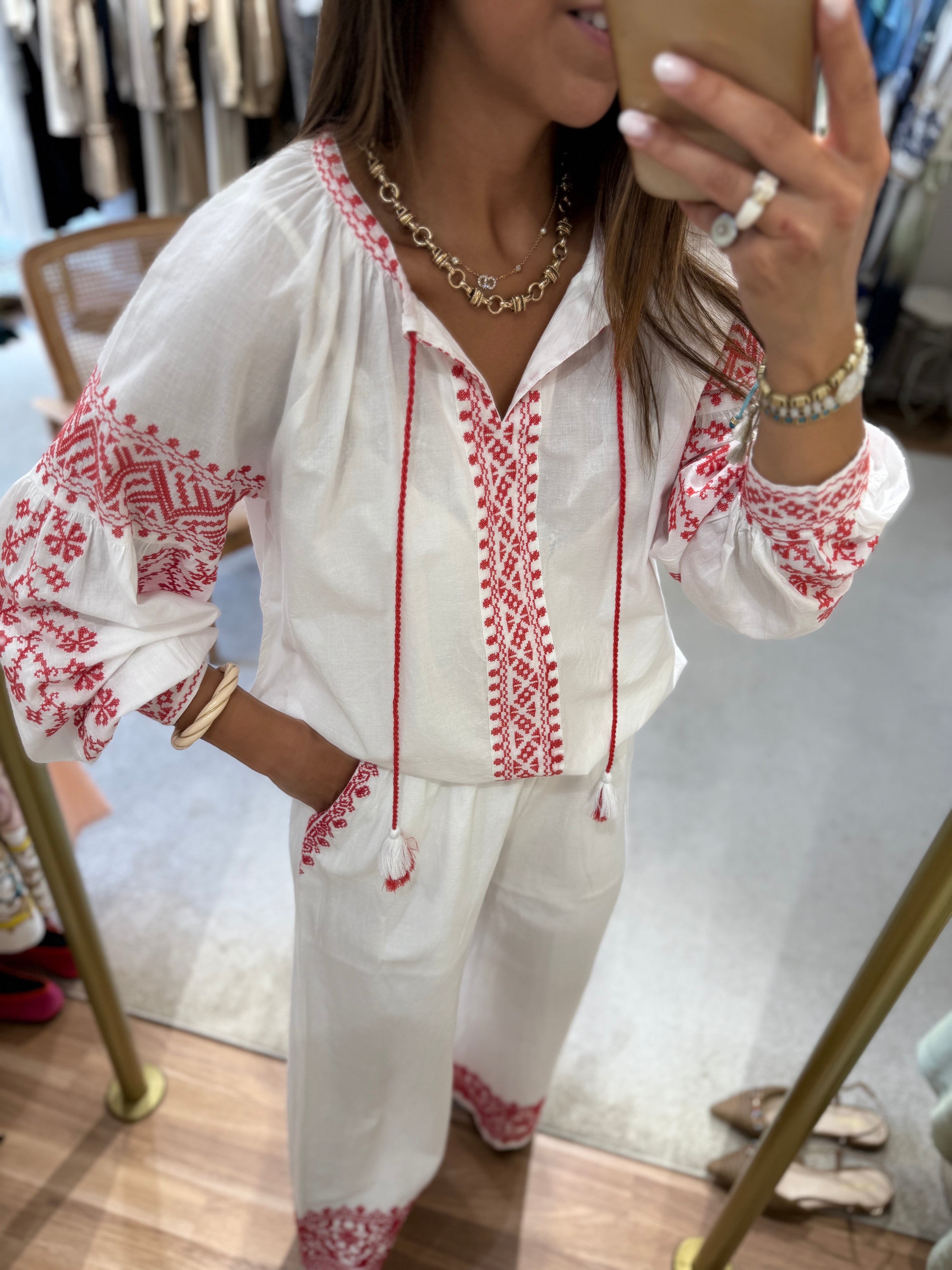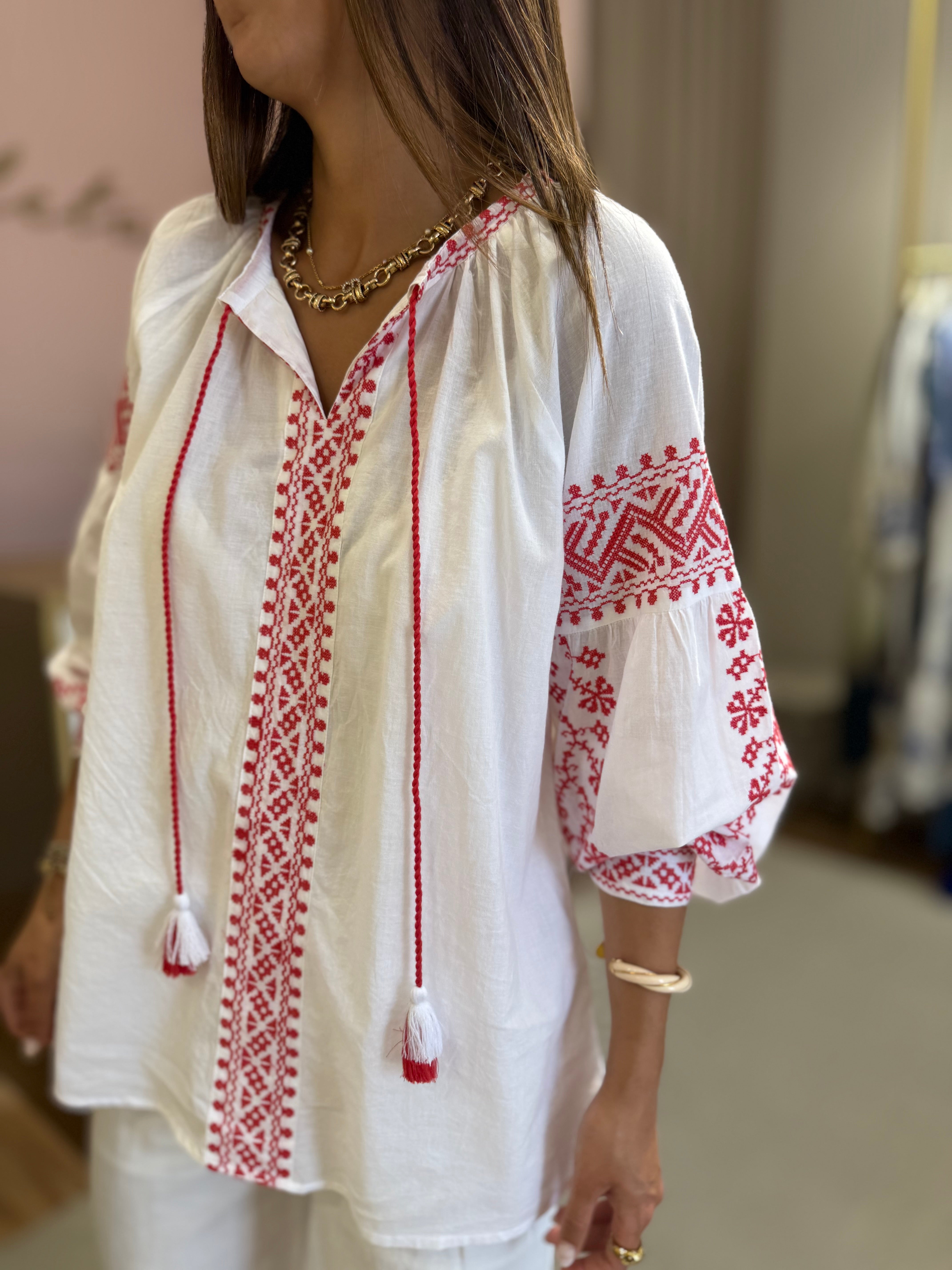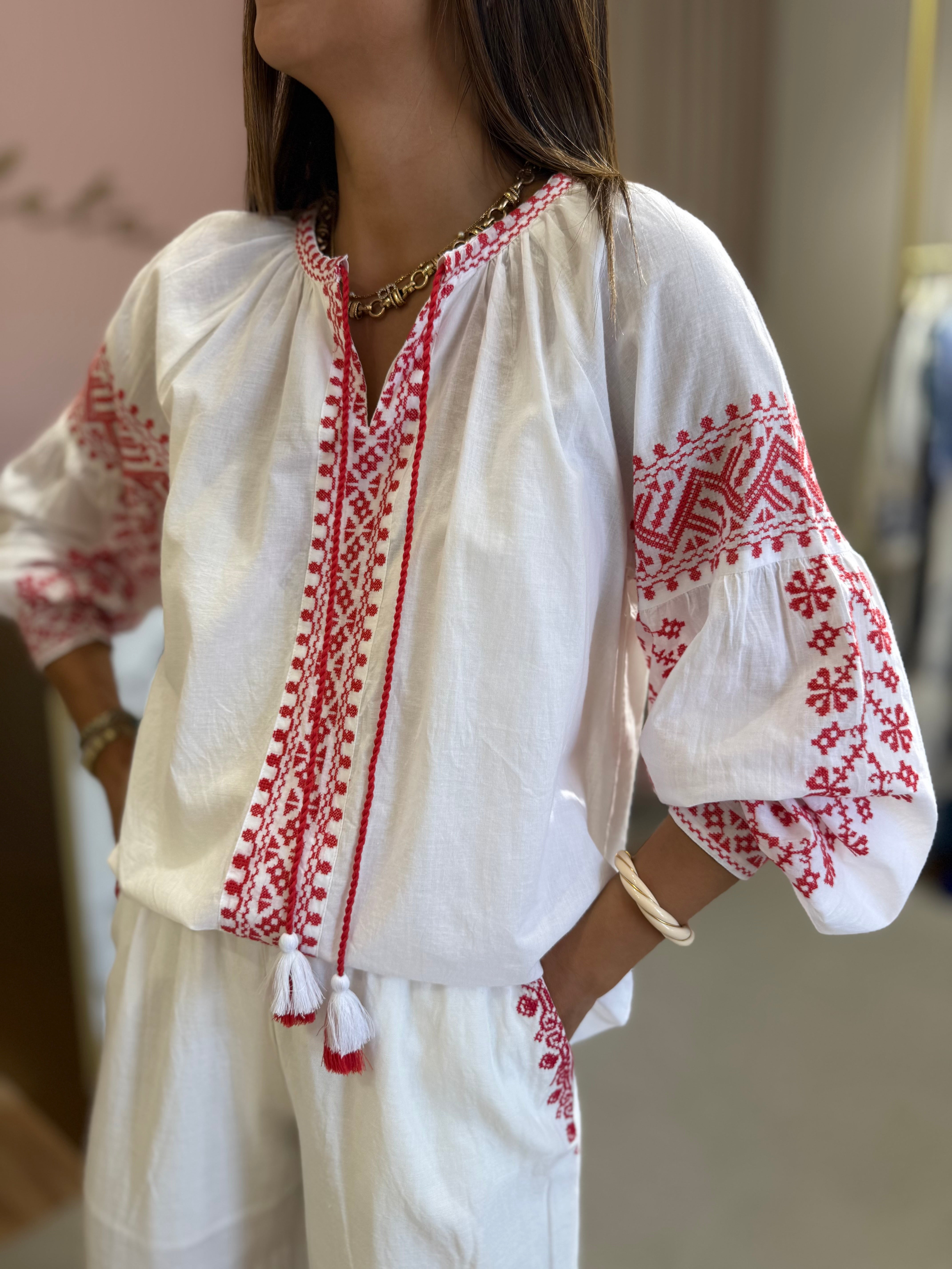 Blusa de algodão com bordados em vermelho na gola, mangas e peito, corte solto e decote em V com berloques