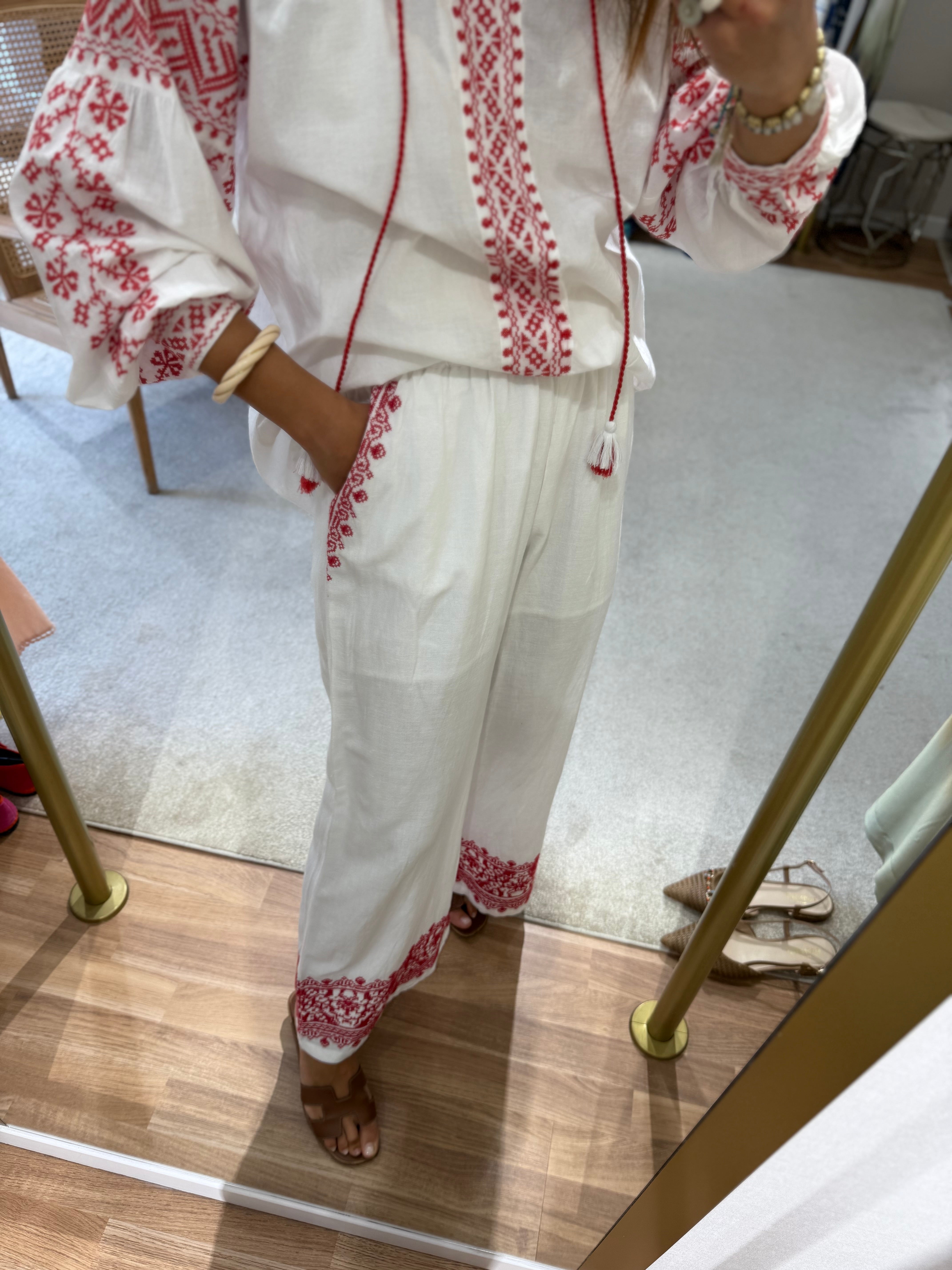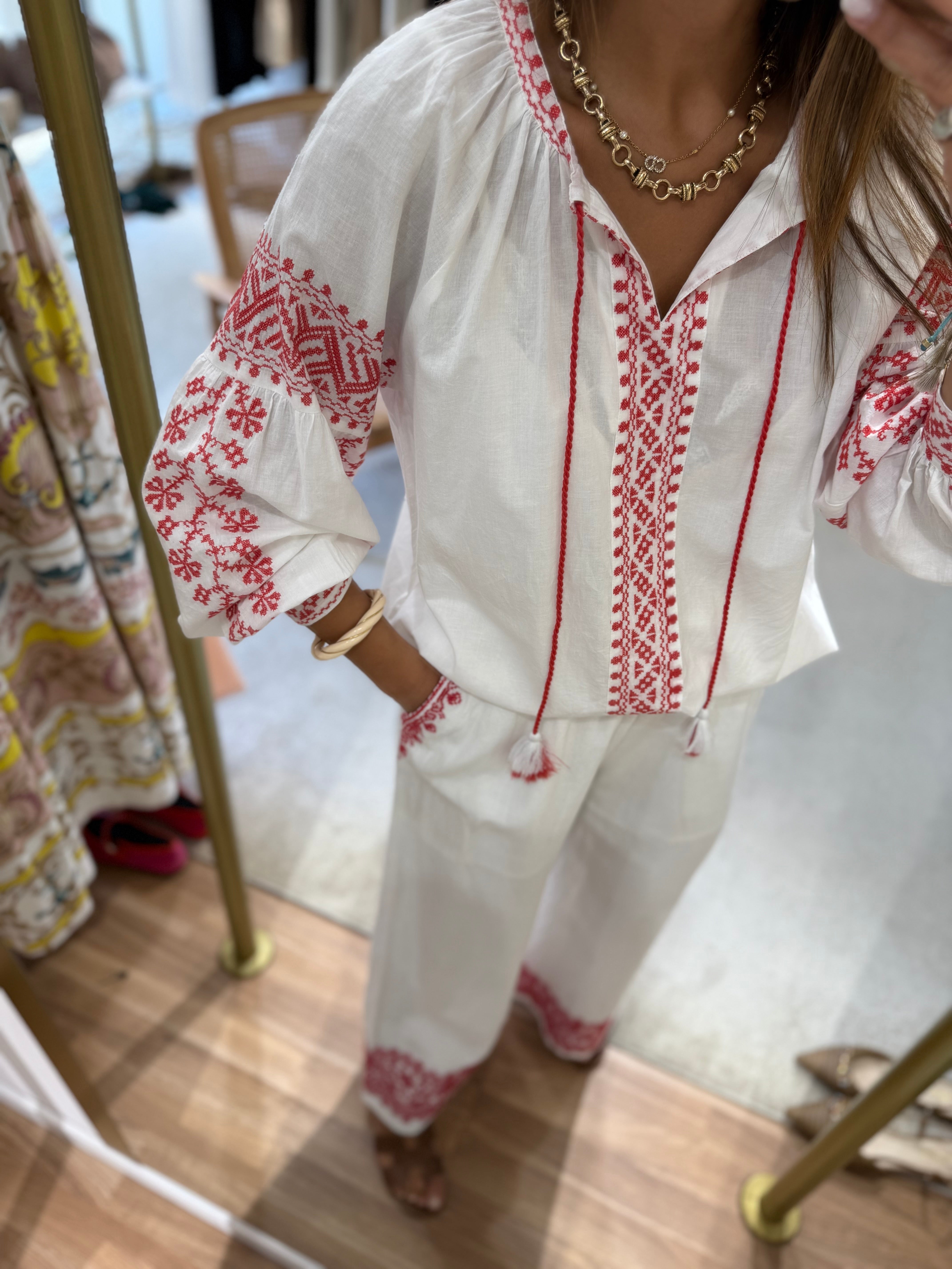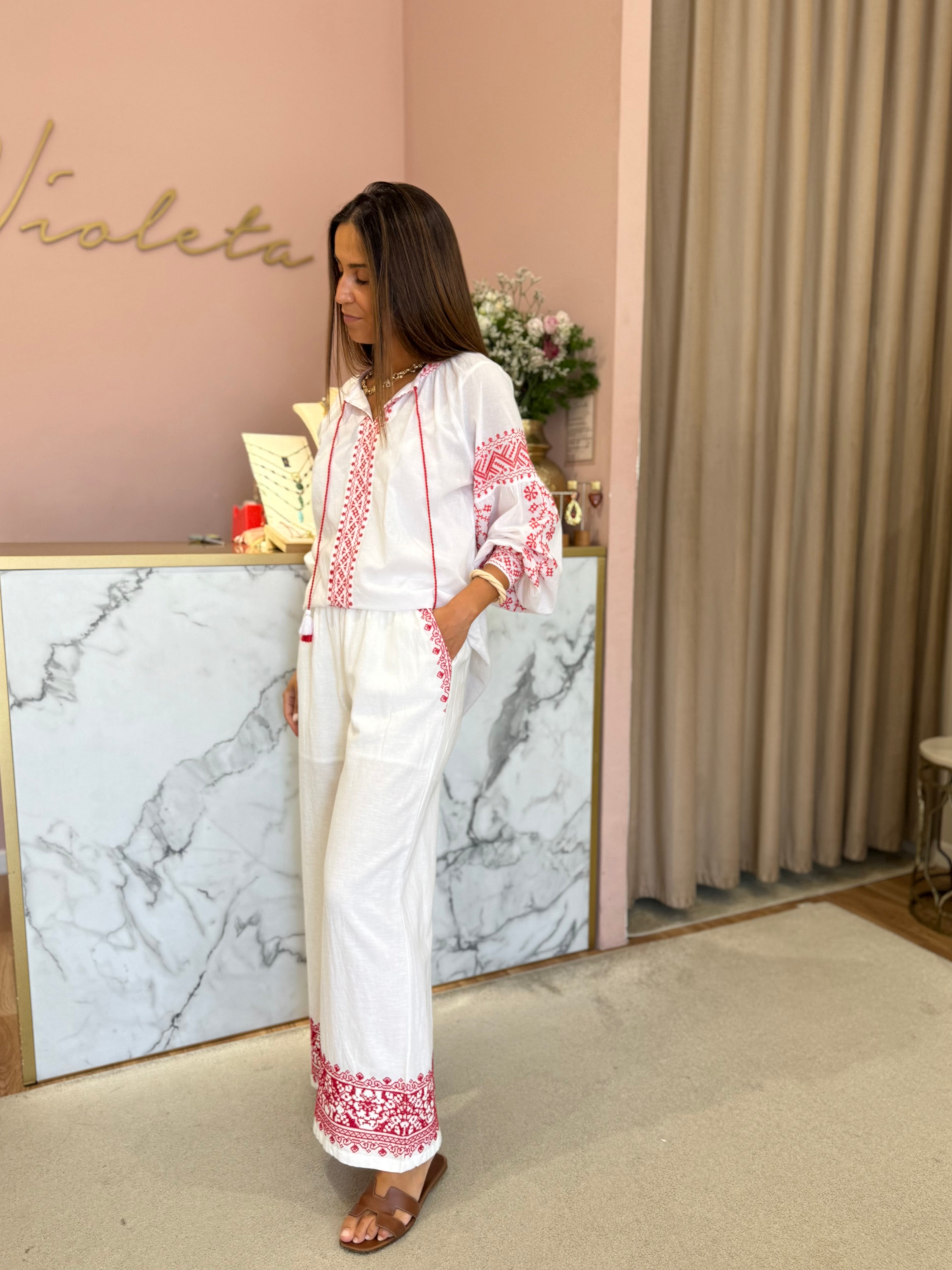 Conjunto em algodão branco com bordados vermelhos