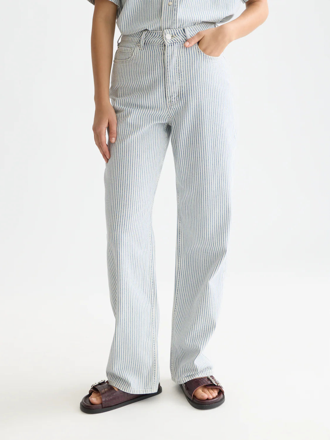 Um par de jeans straight de cintura alta com efeito risca subtil, que combina um corte clássico com uma estética moderna e urbana. Estes jeans destacam‑se pelo seu design clean e pelo padrão risca que acrescenta personalidade ao básico do guarda‑roupa.