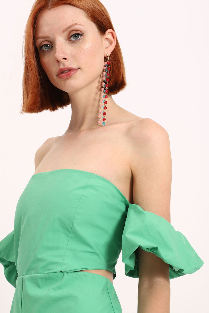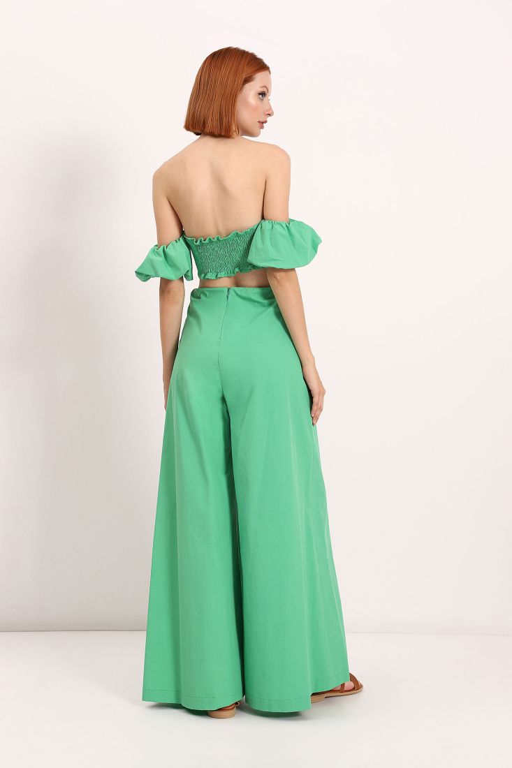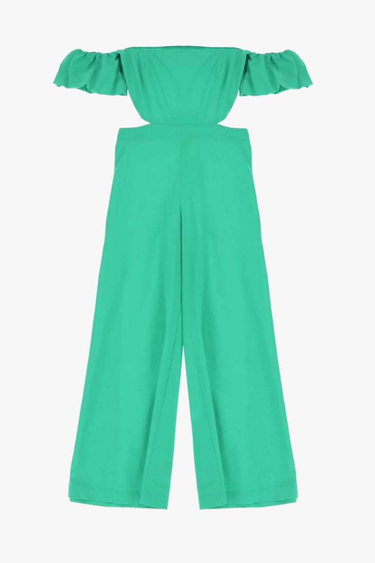 Macacão de ombros e costas descobertos, com alça caída no braço, cintura elástica, fecho na parte de trás da calça invisível, perna longa.