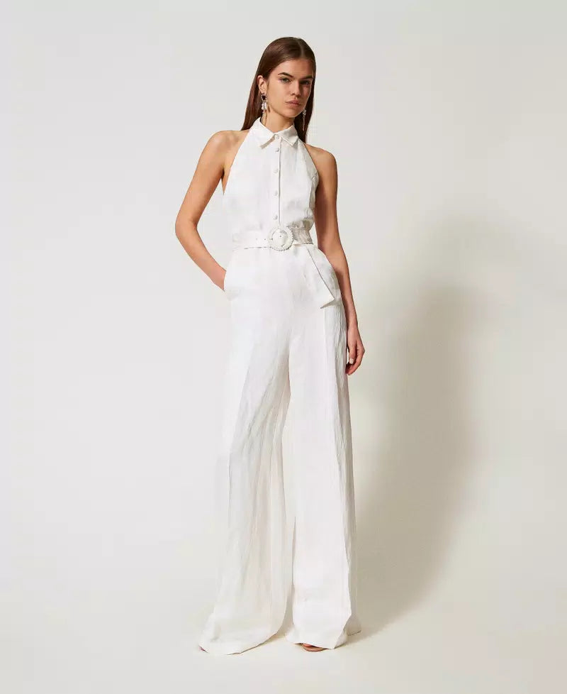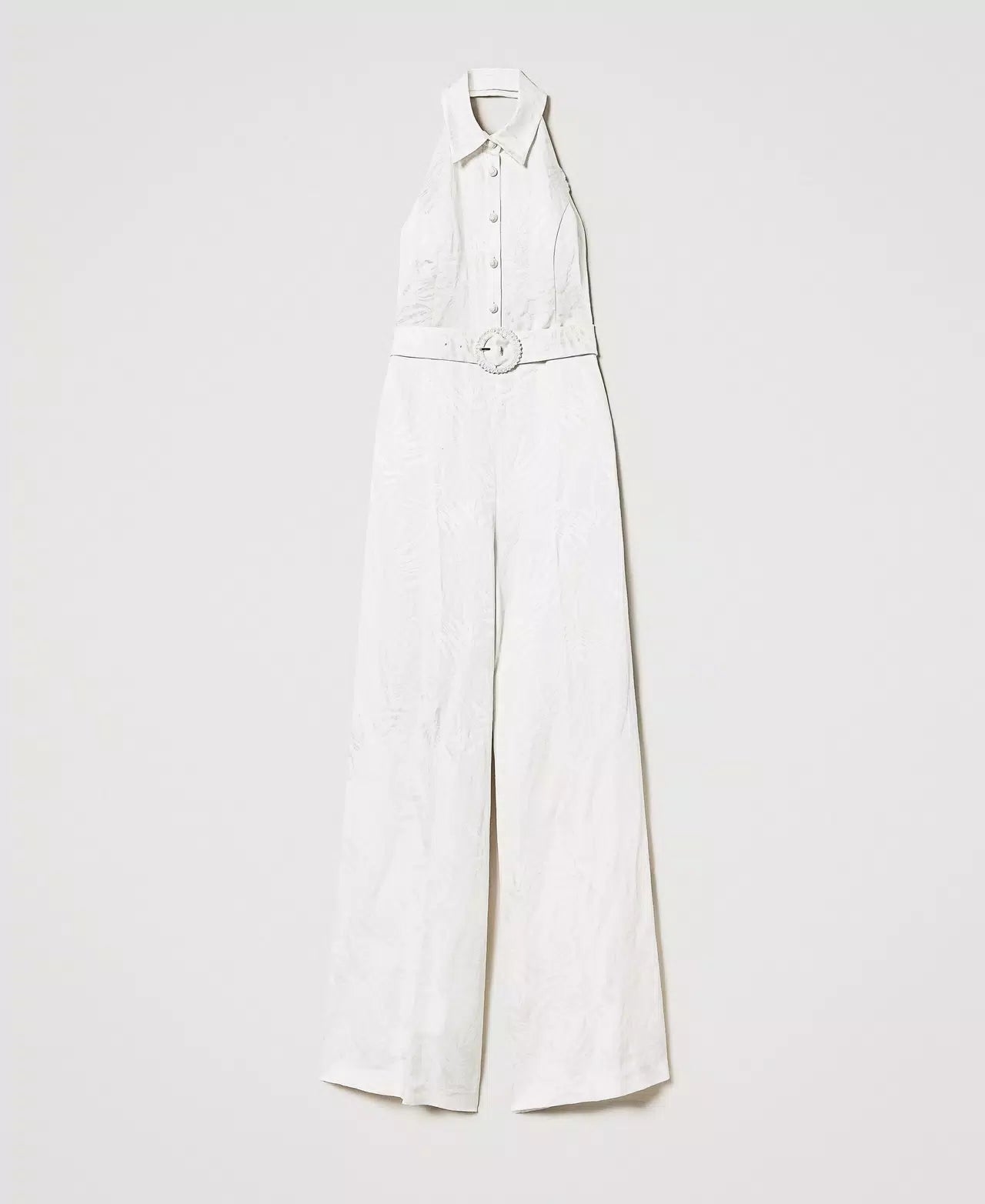 Jumpsuit TWINSET em cetim branco com textura de palmeiras em relevo, gola clássica decote halter , perna larga e fecho de botões forrados zona do peito. Cinto de tecido amovível e bolsos laterais.