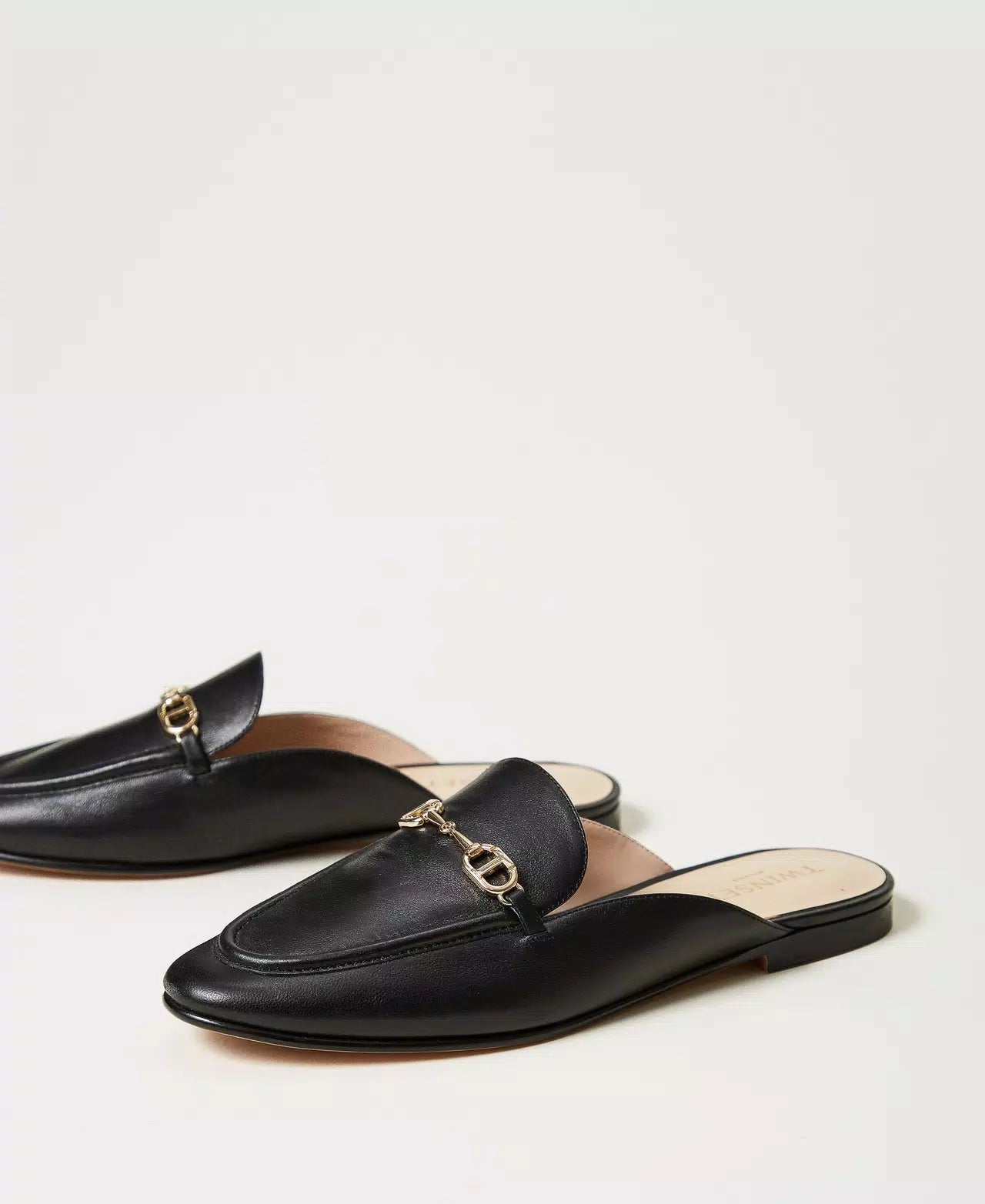 Mules em pele TWINSET pretas com logótipo oval em T de metal, sola de borracha.
