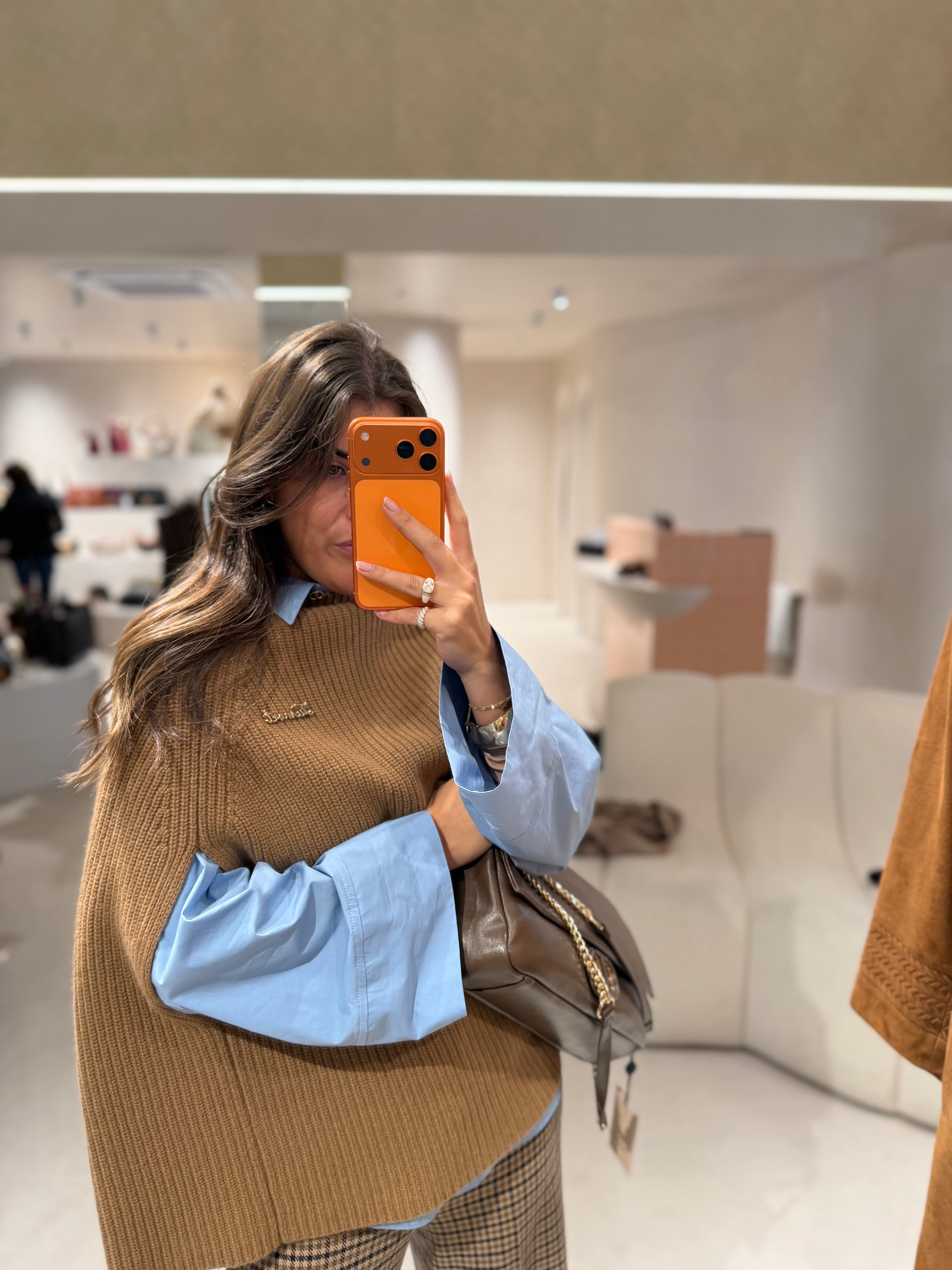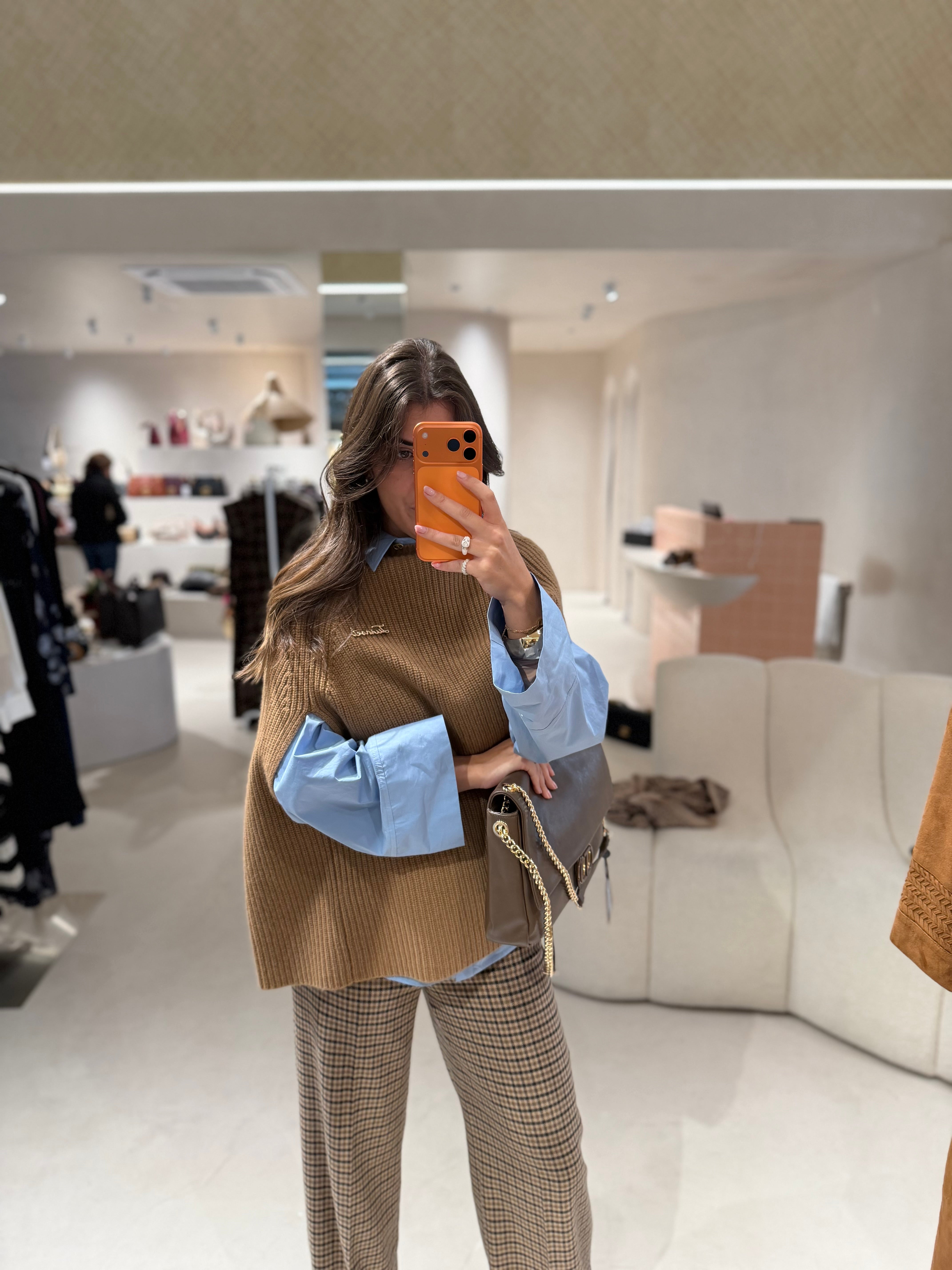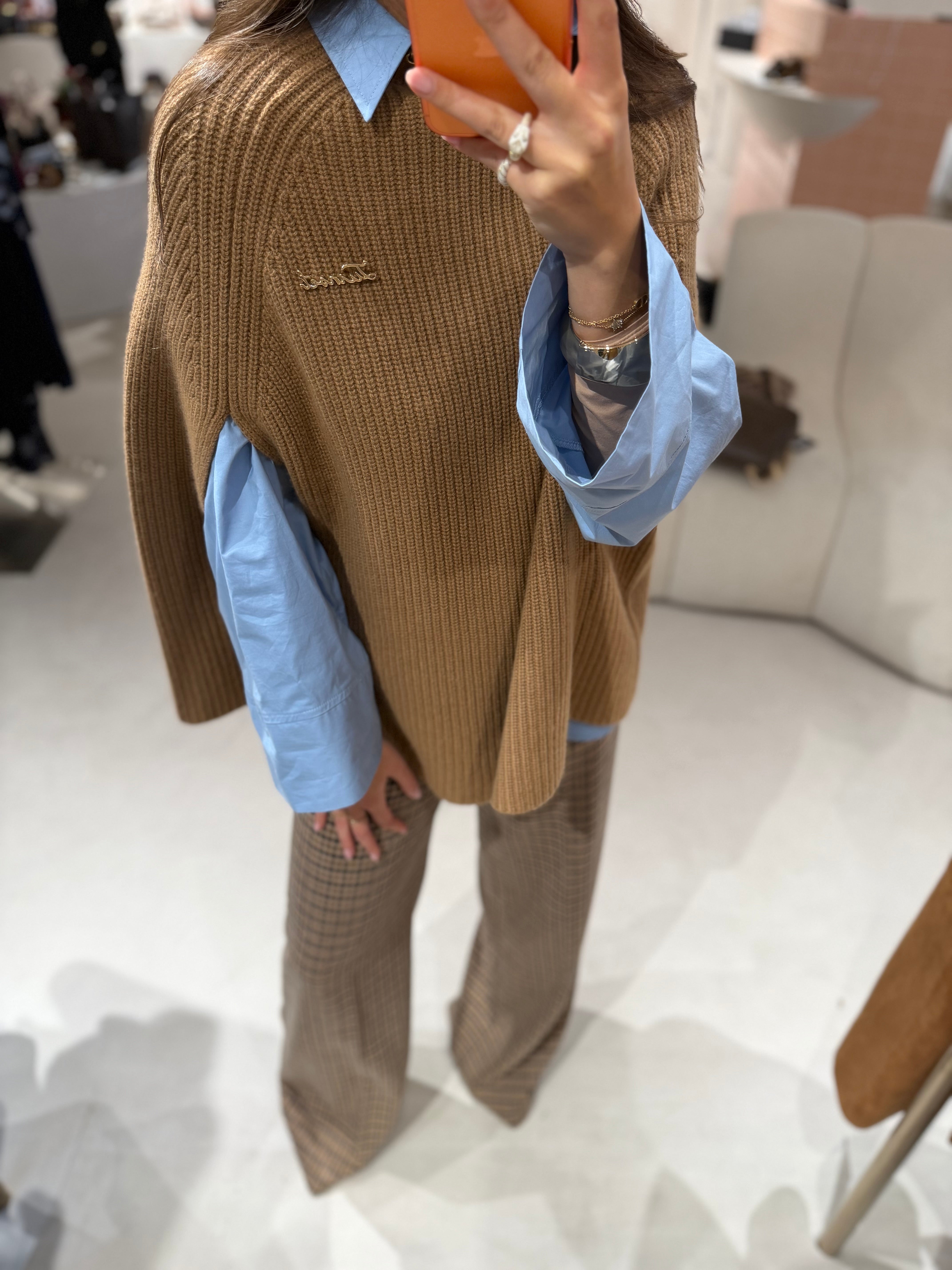 Pulôver com efeito capa em mistura de lã, viscose e cashmere, no ponto “corn stitch”. Apresenta recortes frontais para os braços, modelagem levemente evasê e um broche logo removível como detalhe sofisticado.