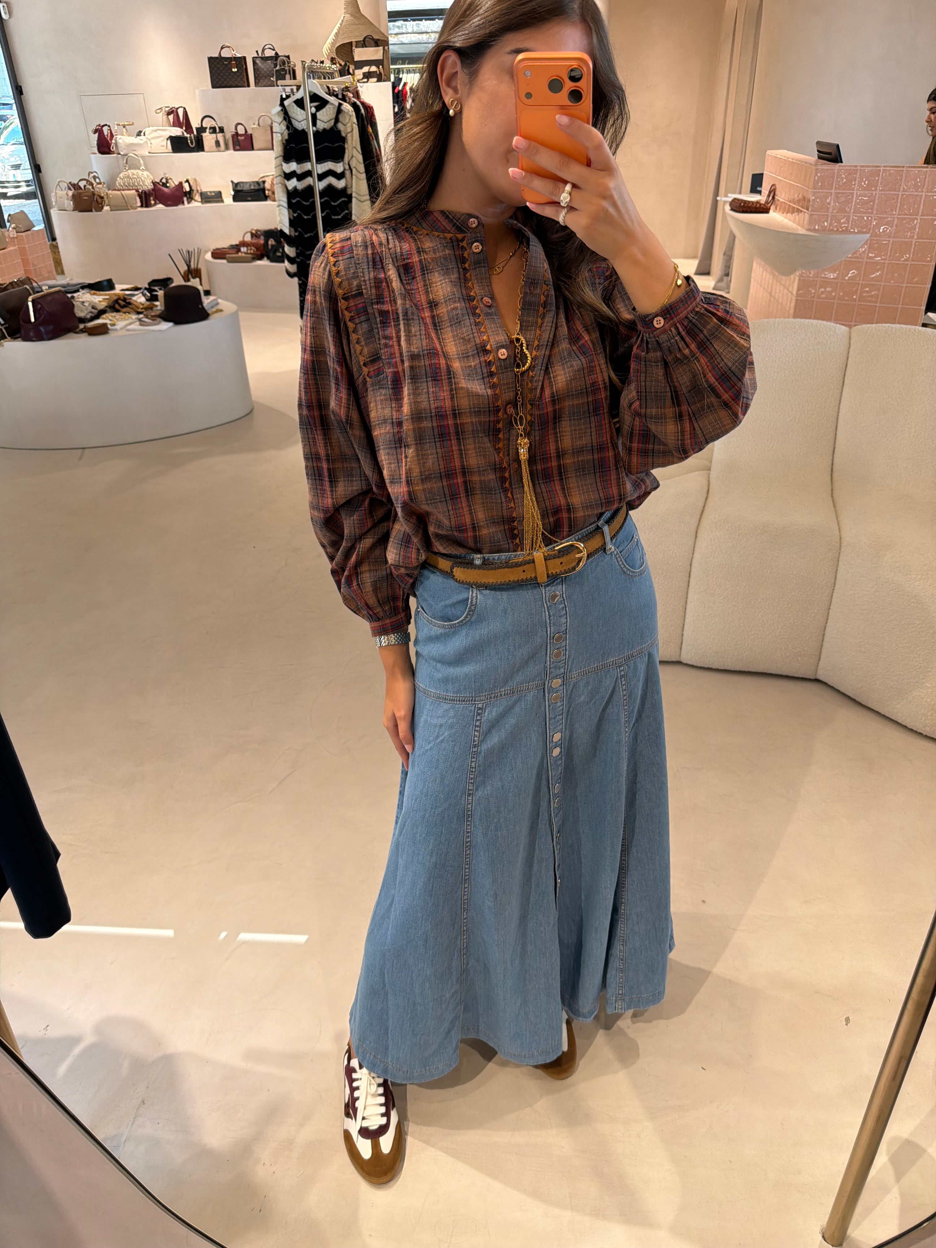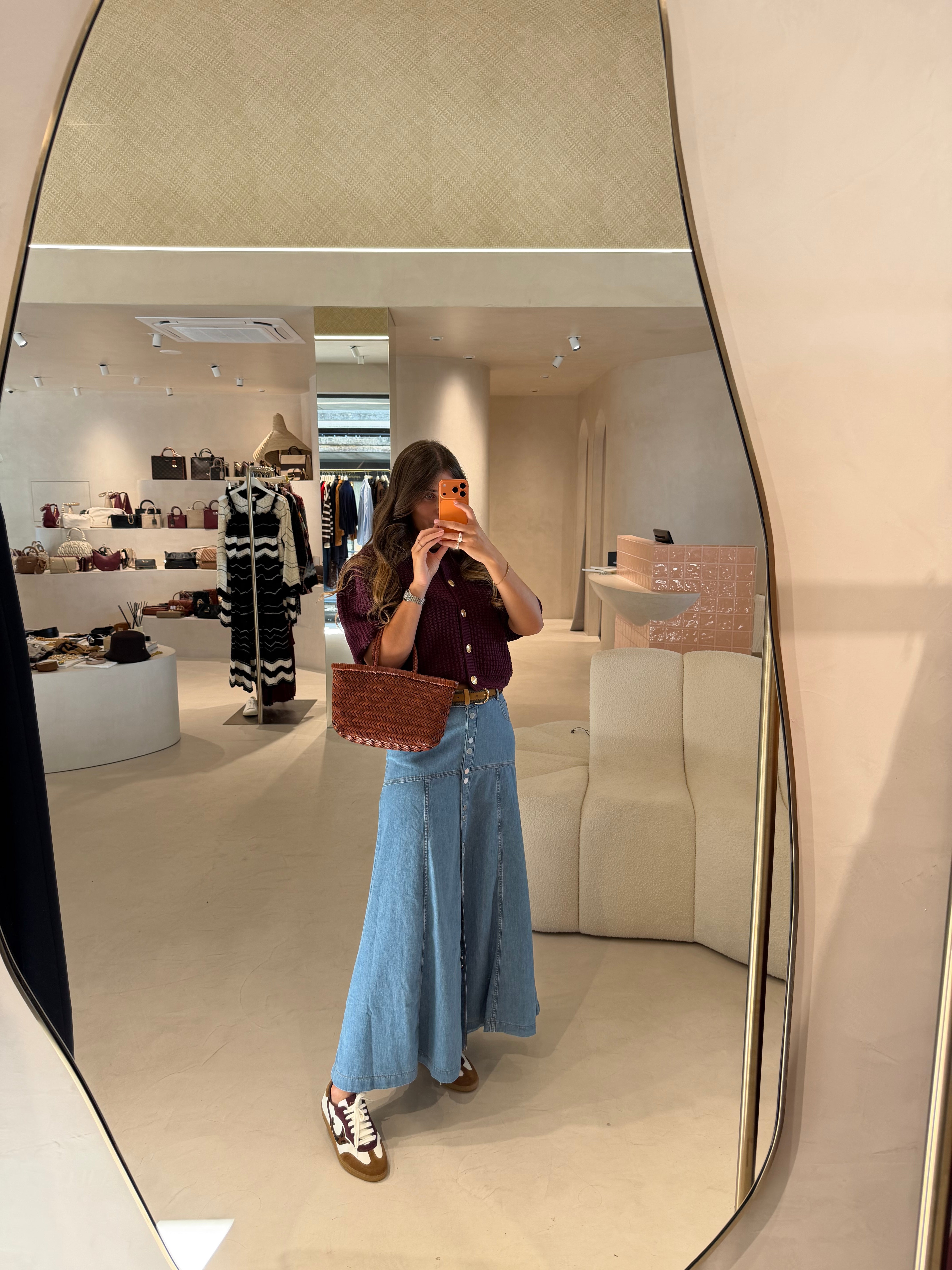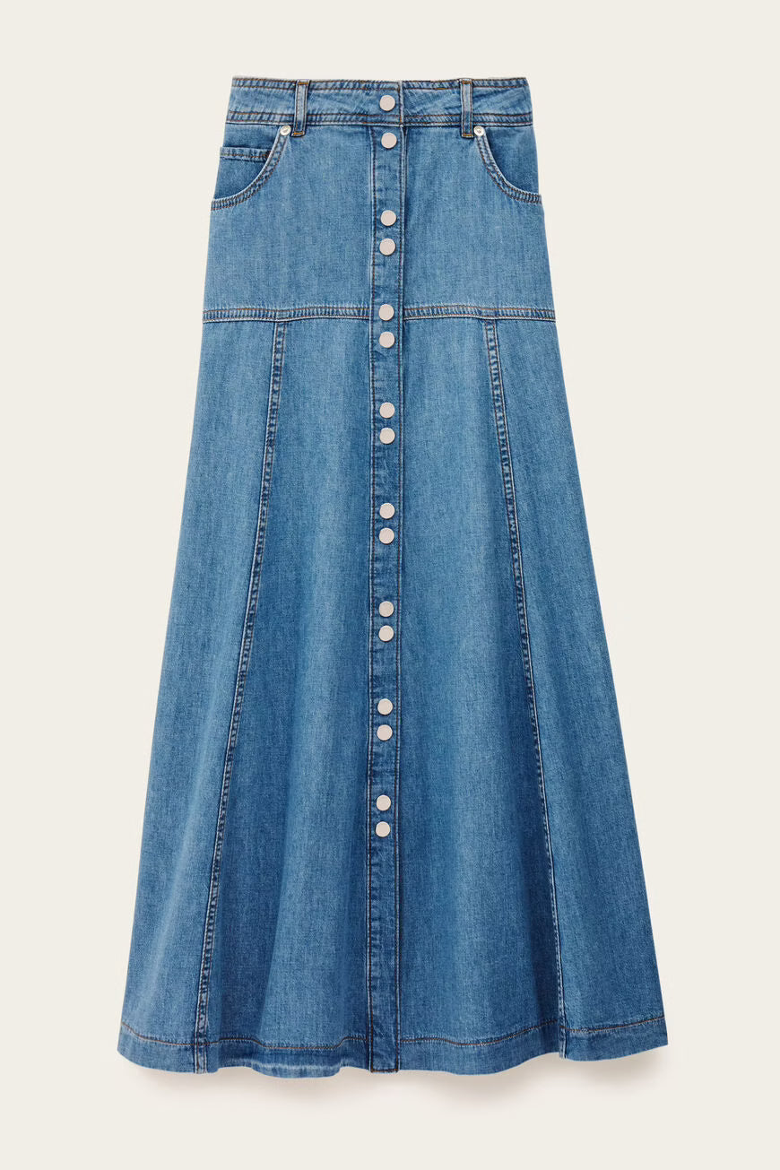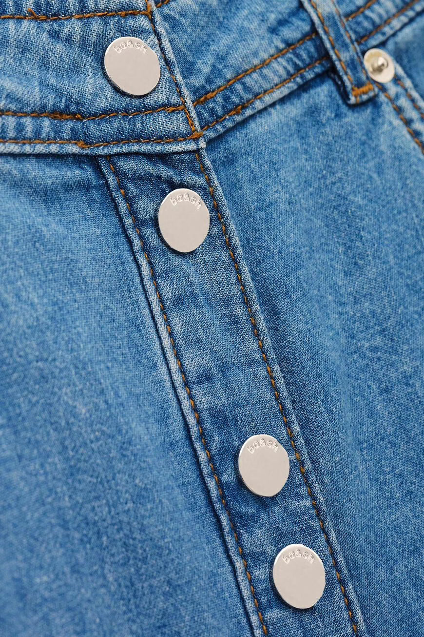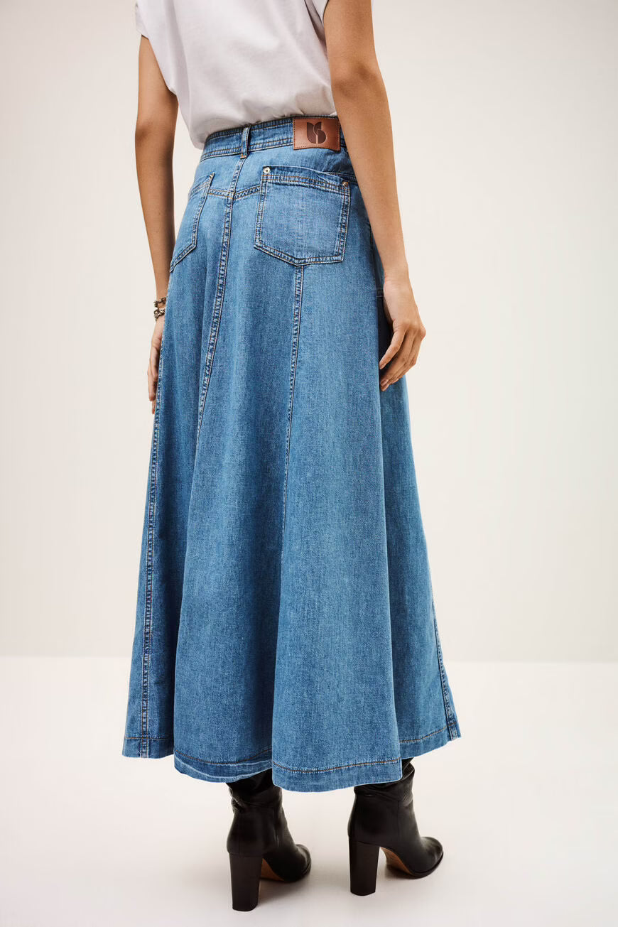 A saia Laddie em tom azul claro da ba&sh é a combinação perfeita entre estilo vintage e conforto moderno. Com um corte flare longo e cintura média, esta saia em denim de algodão orgânico apresenta um toque desgastado que confere um charme atemporal. O fecho frontal com botões e os bolsos frontais e traseiros adicionam um toque funcional e estiloso à peça.