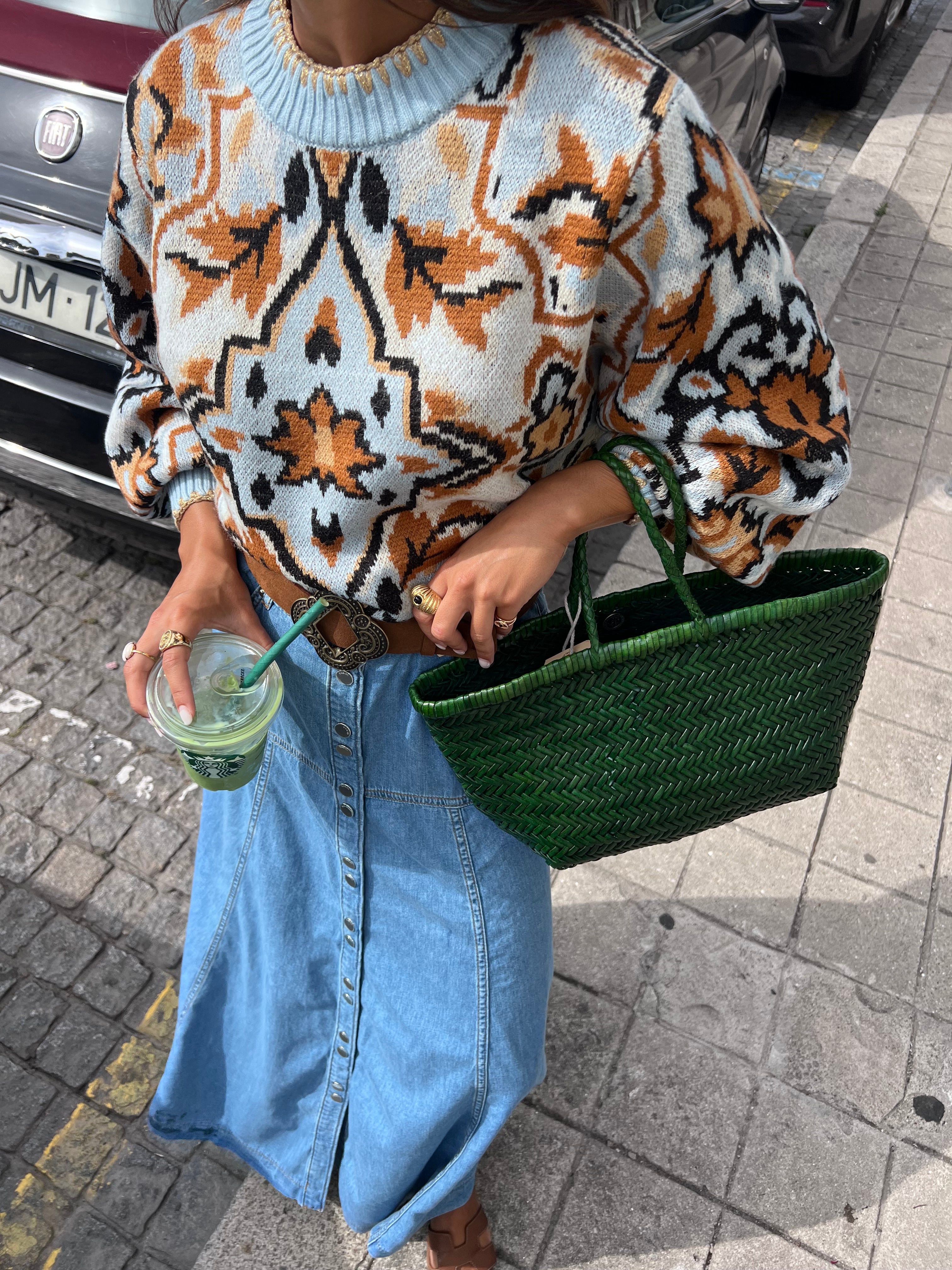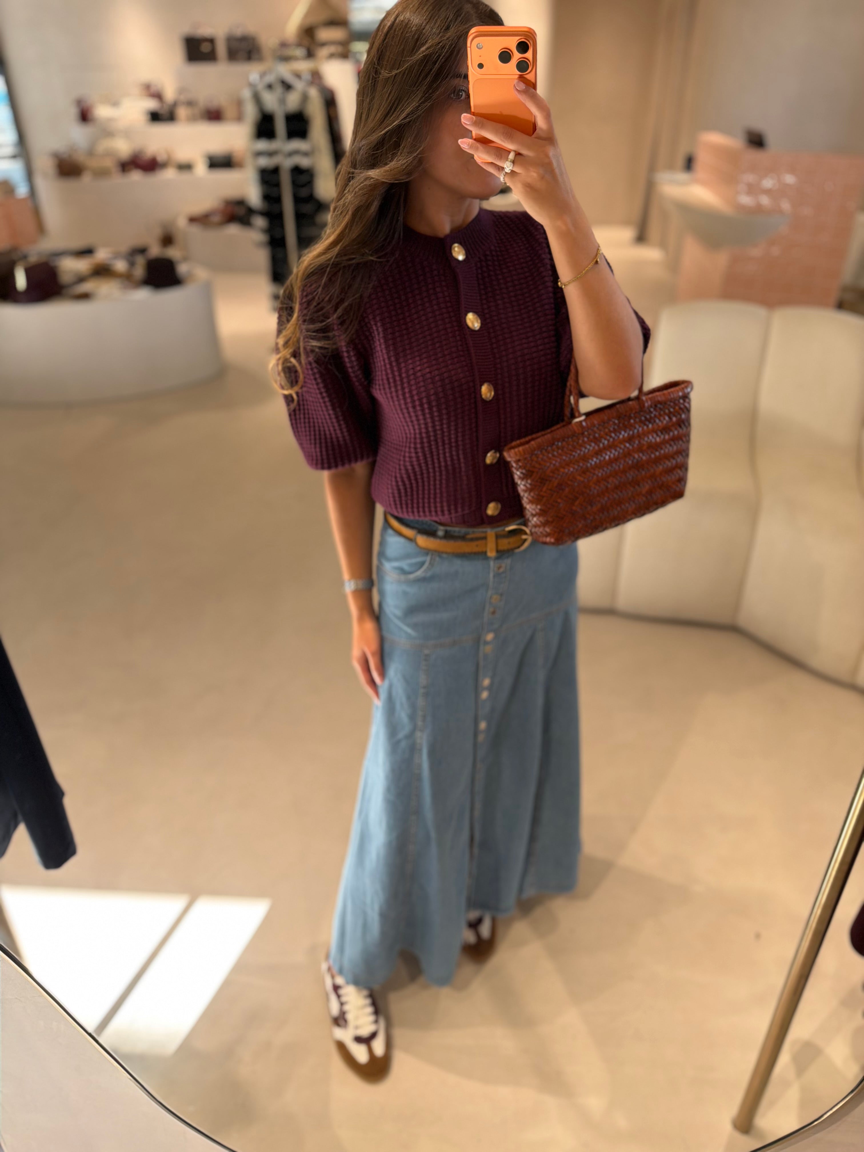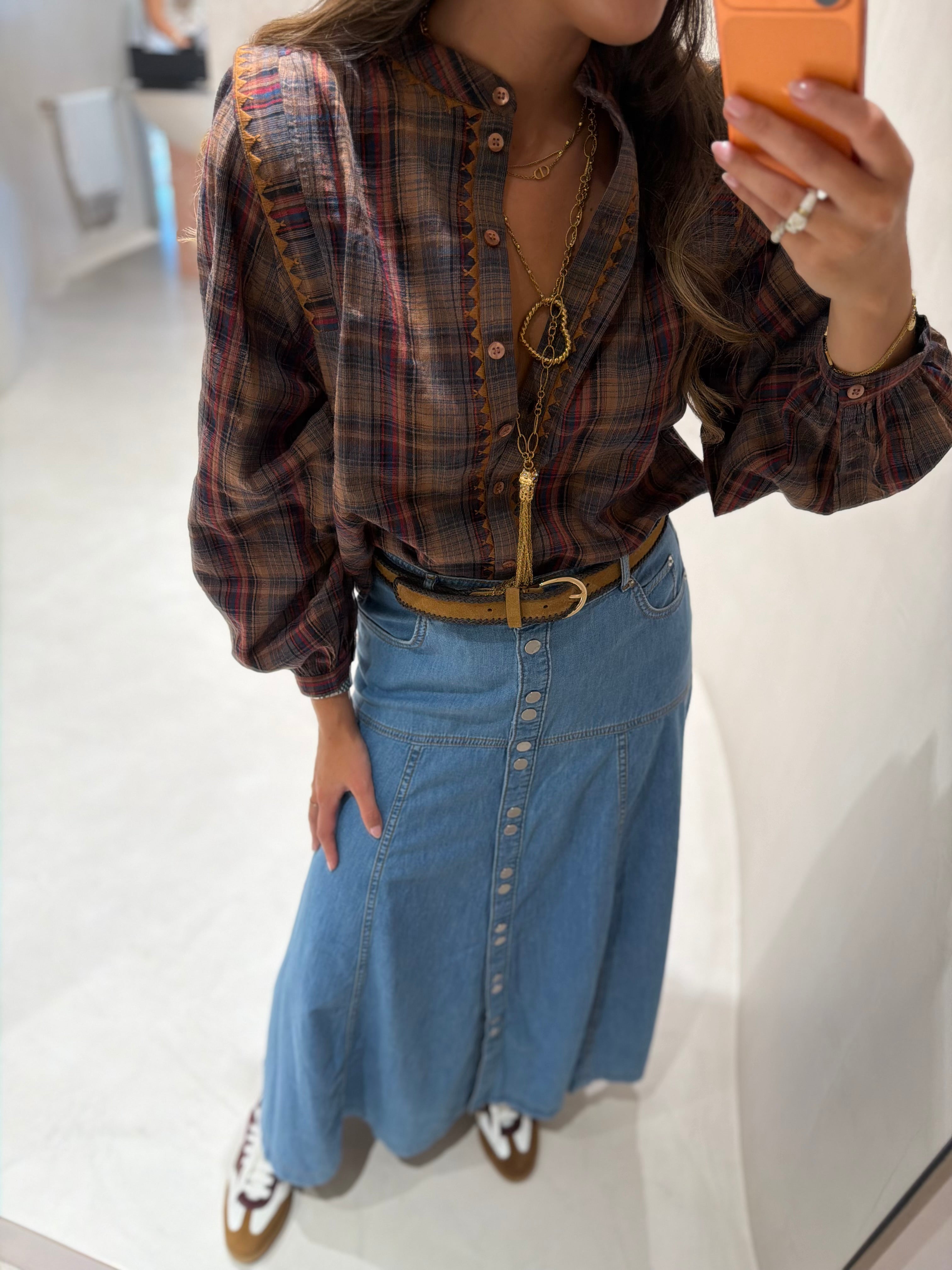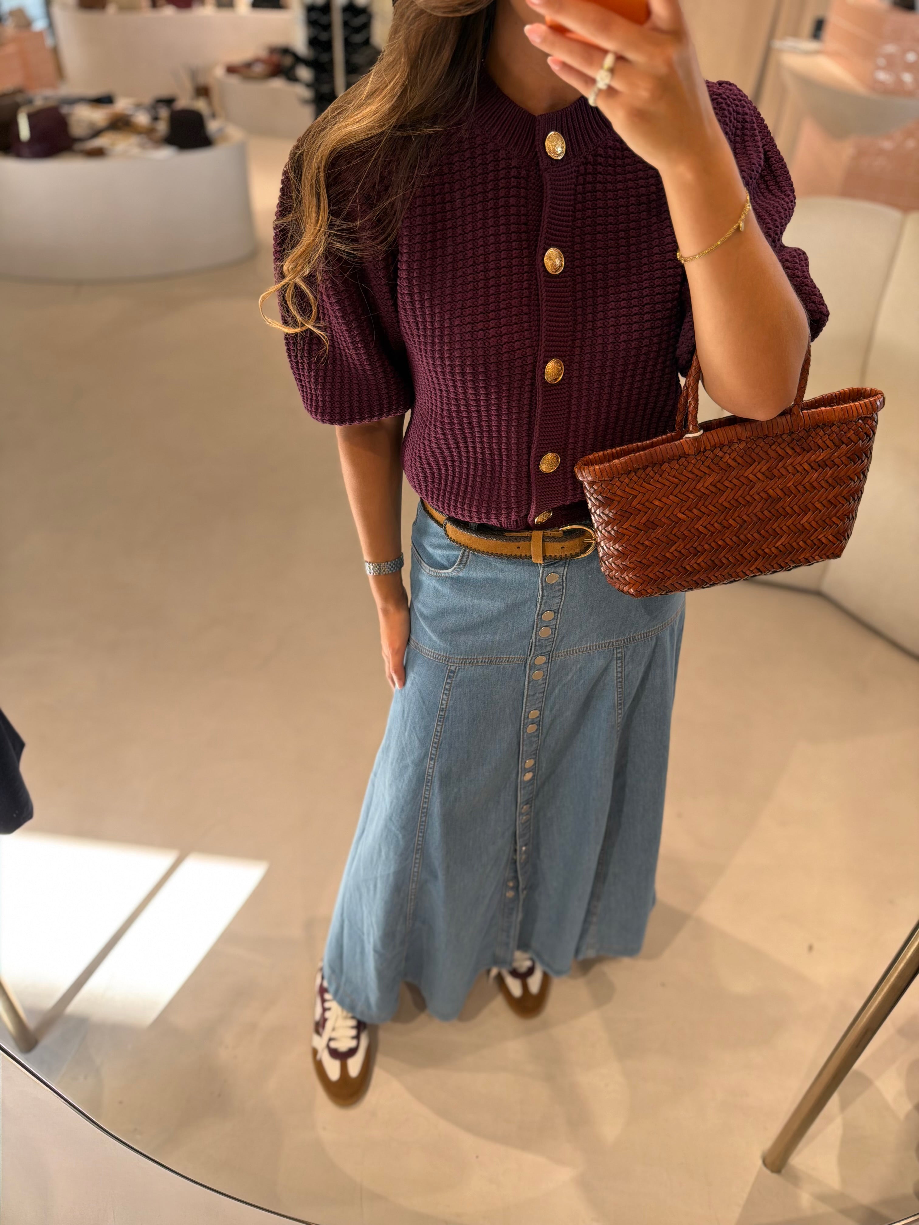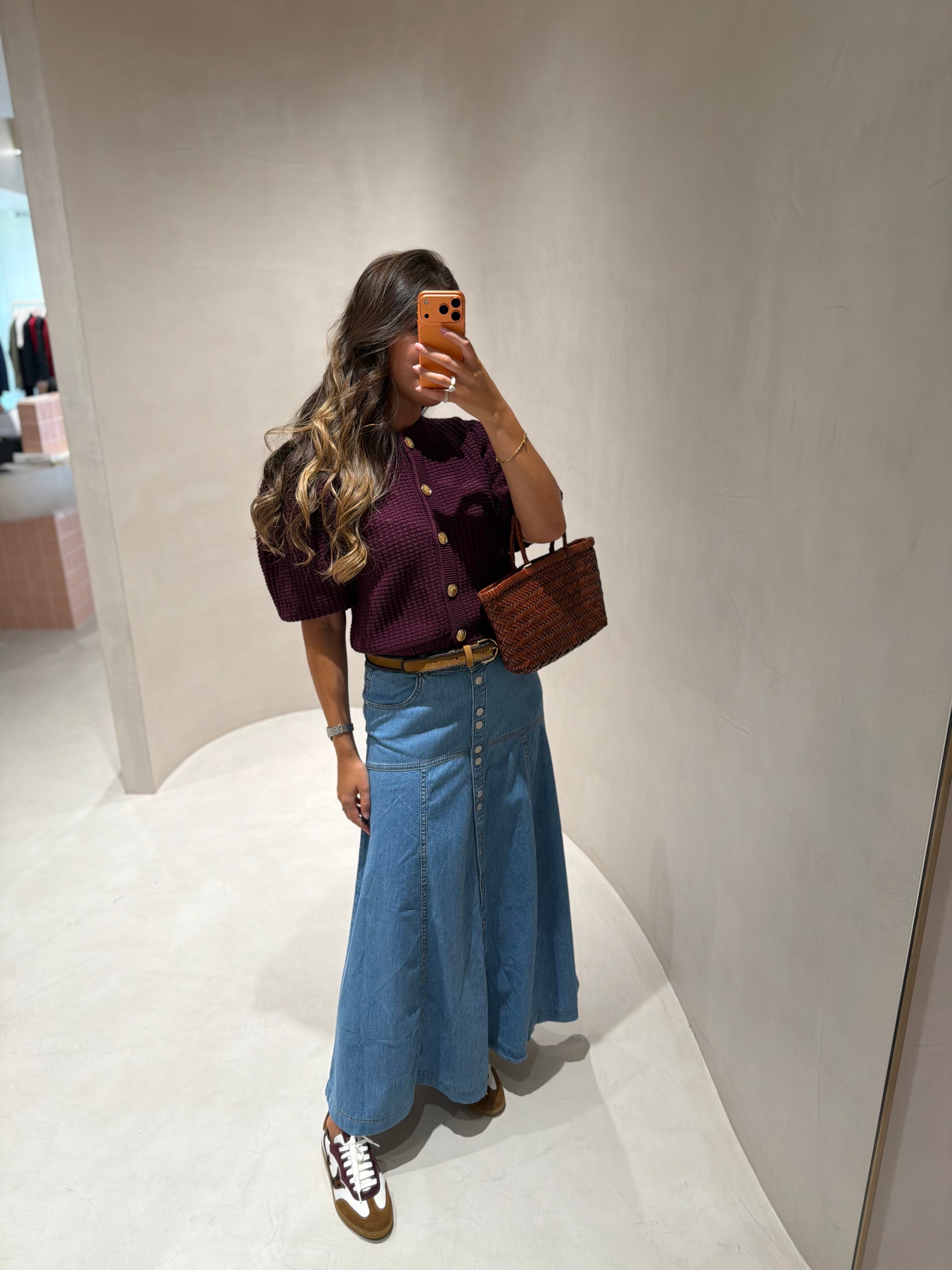 A saia Laddie em tom azul claro da ba&sh é a combinação perfeita entre estilo vintage e conforto moderno. Com um corte flare longo e cintura média, esta saia em denim de algodão orgânico apresenta um toque desgastado que confere um charme atemporal. O fecho frontal com botões e os bolsos frontais e traseiros adicionam um toque funcional e estiloso à peça.