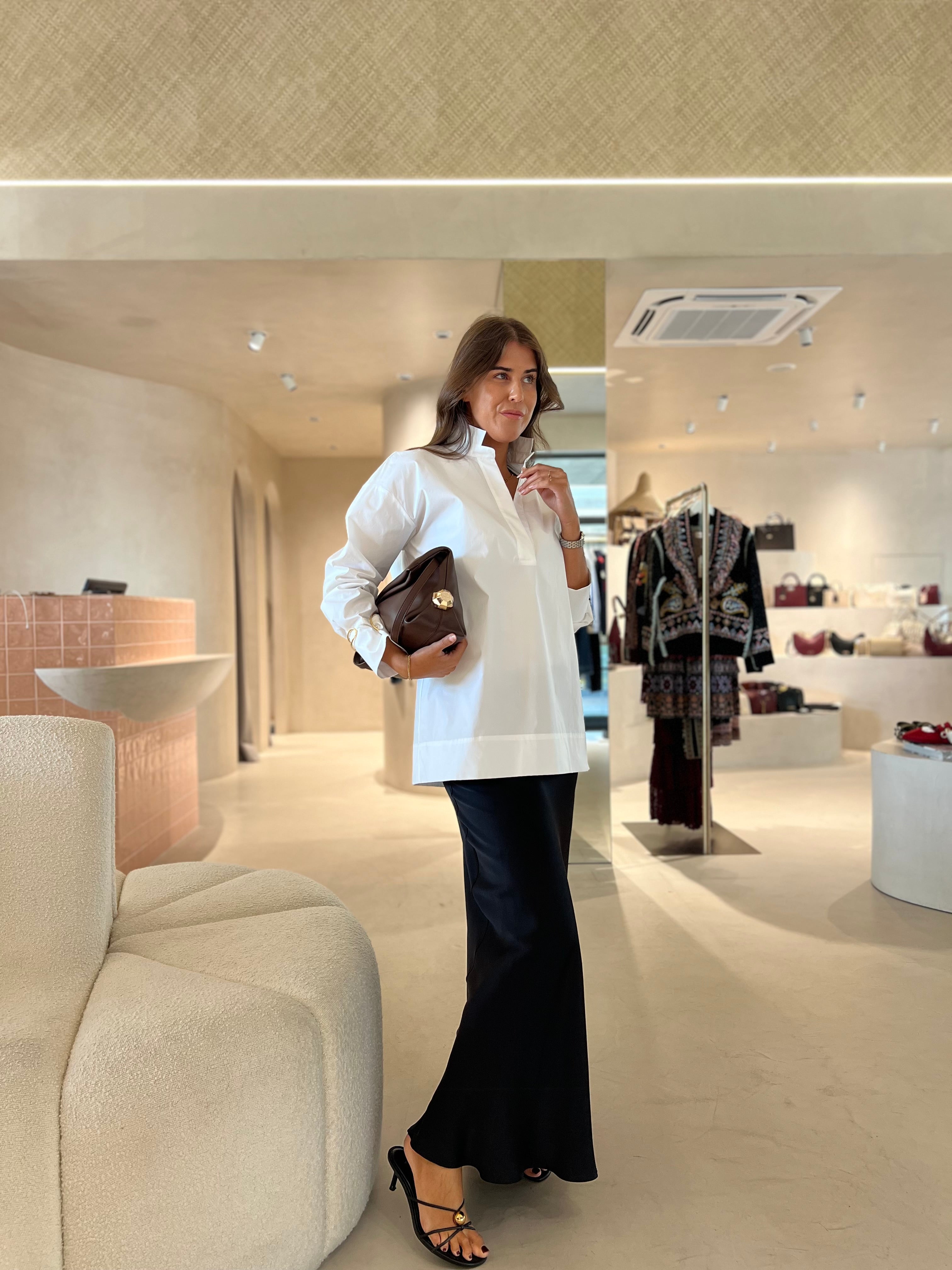 Saia midi acetinada Ottod'ame preta com cós elástico.