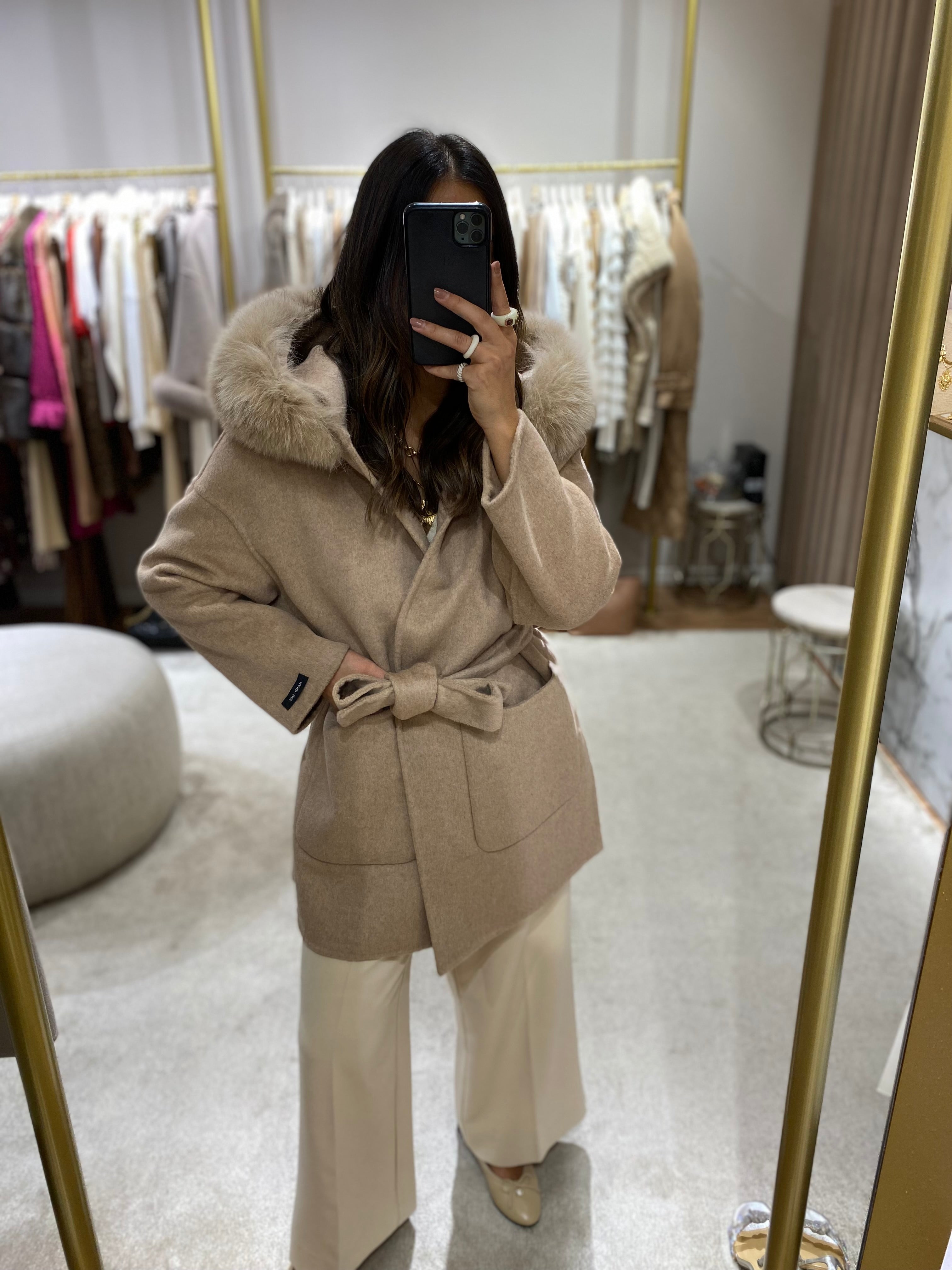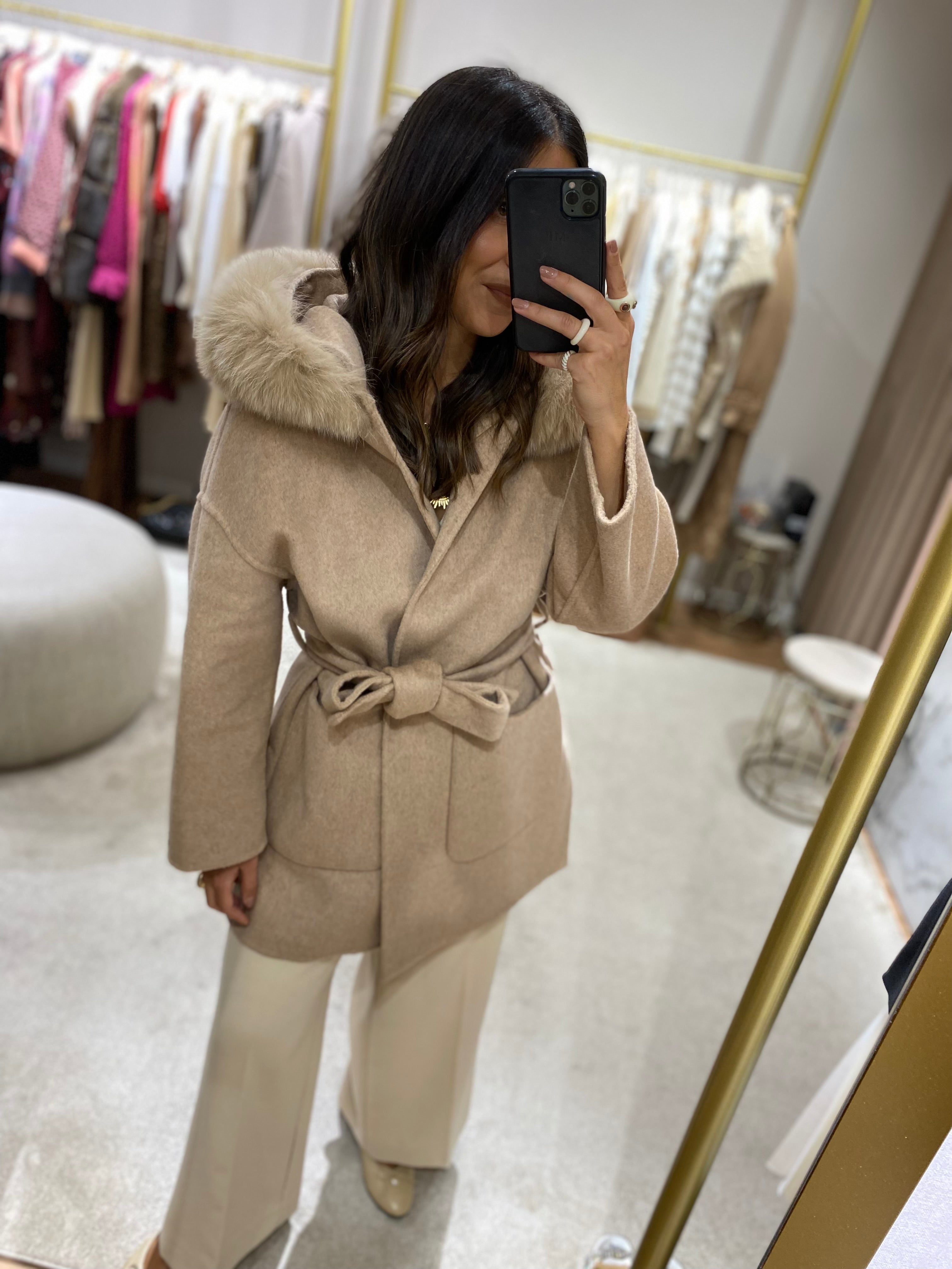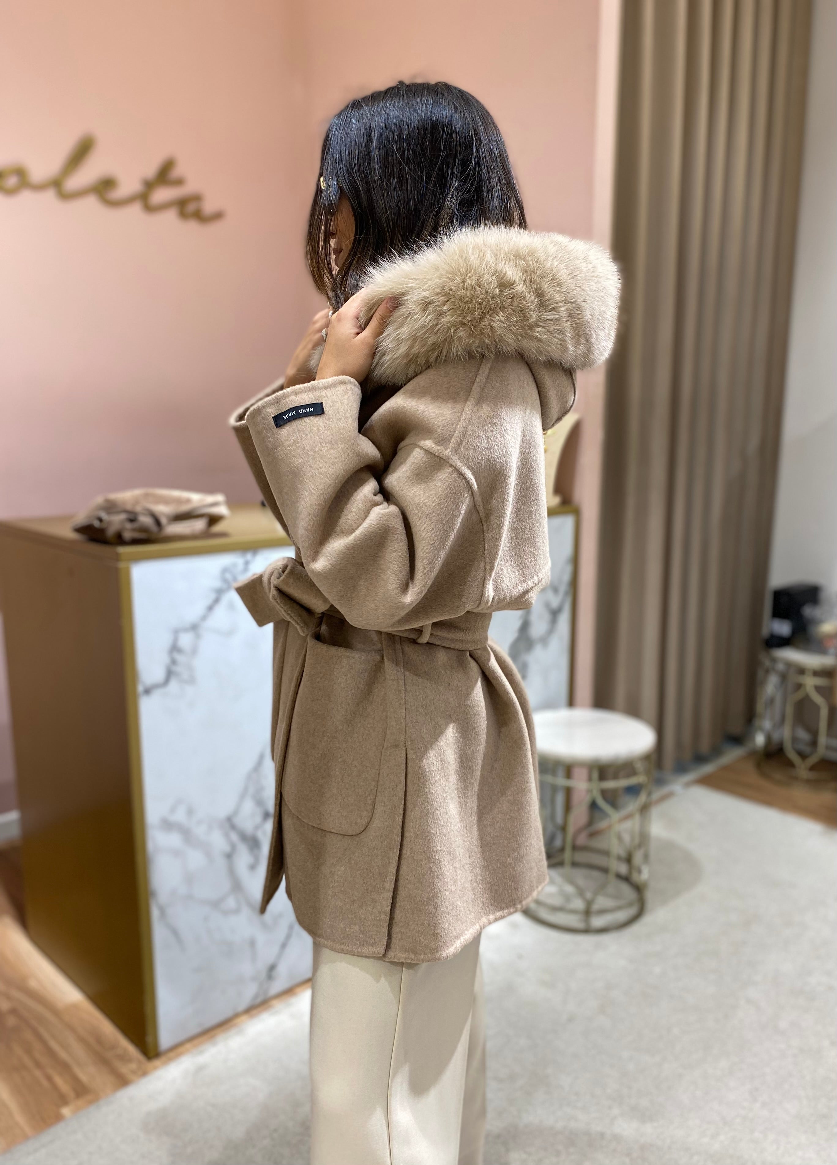 Sobretudo curto em fazenda de lã mel, capuz com pêlo amovível, bolsos à frente e cinto de tecido amovível