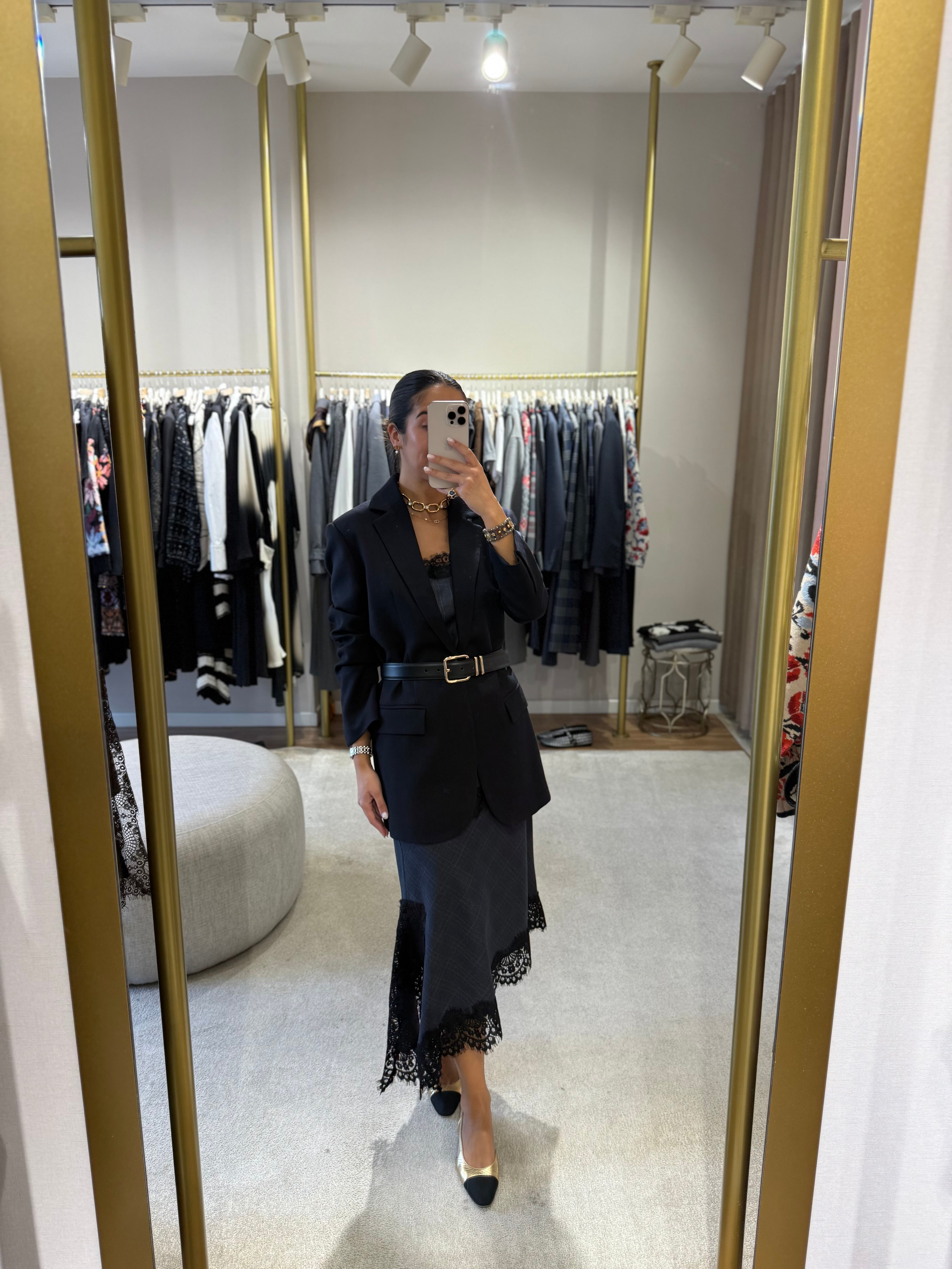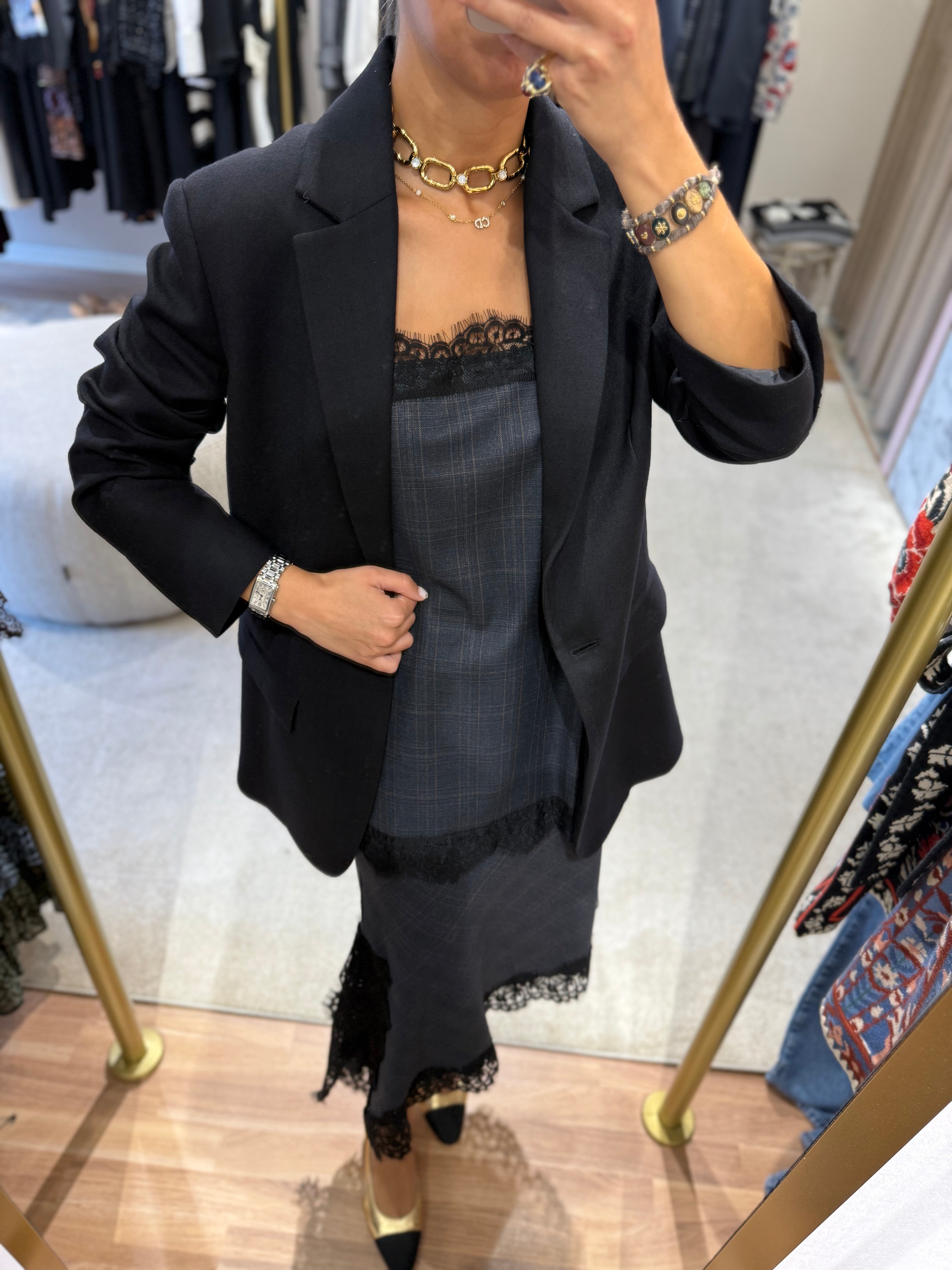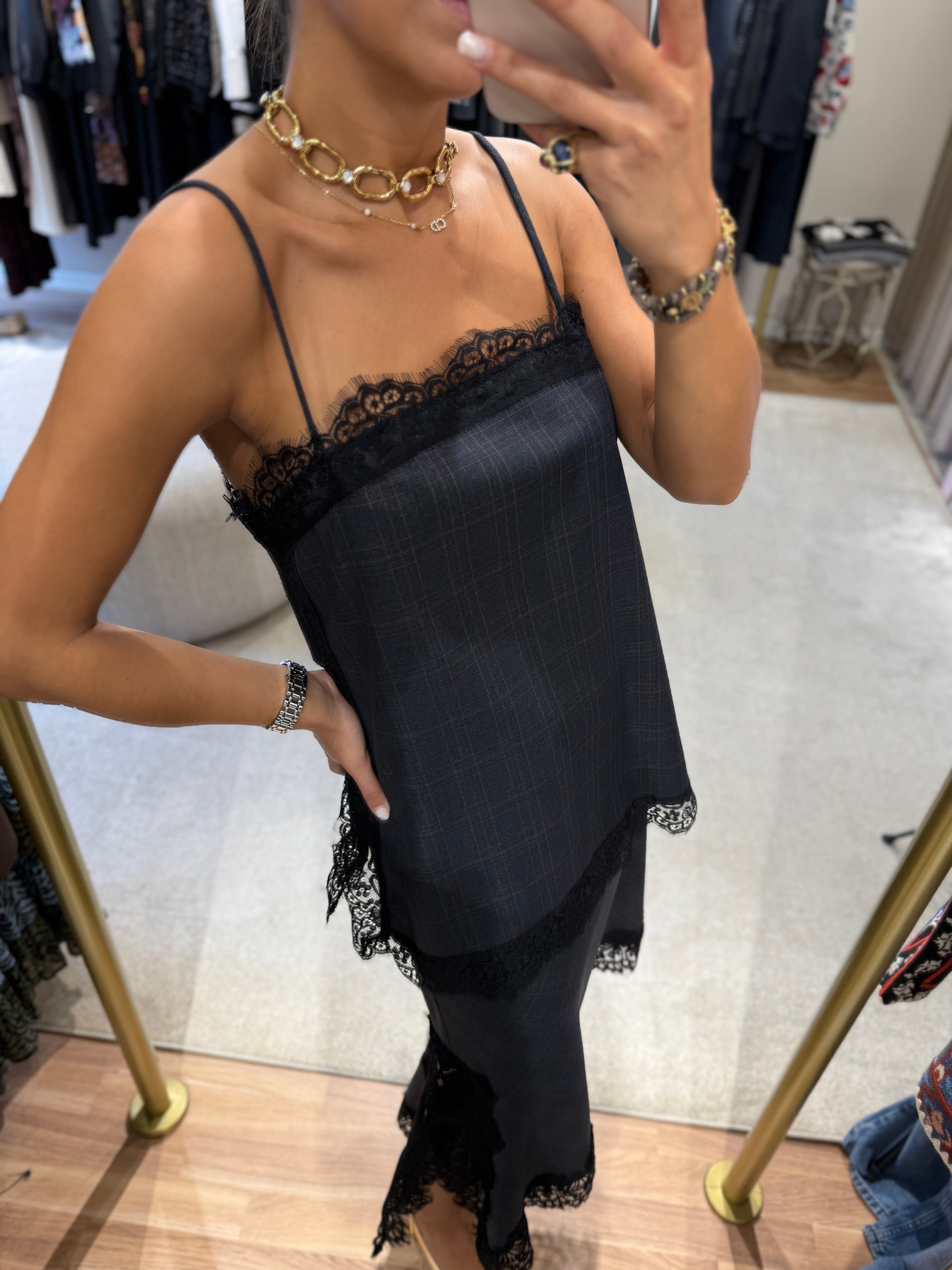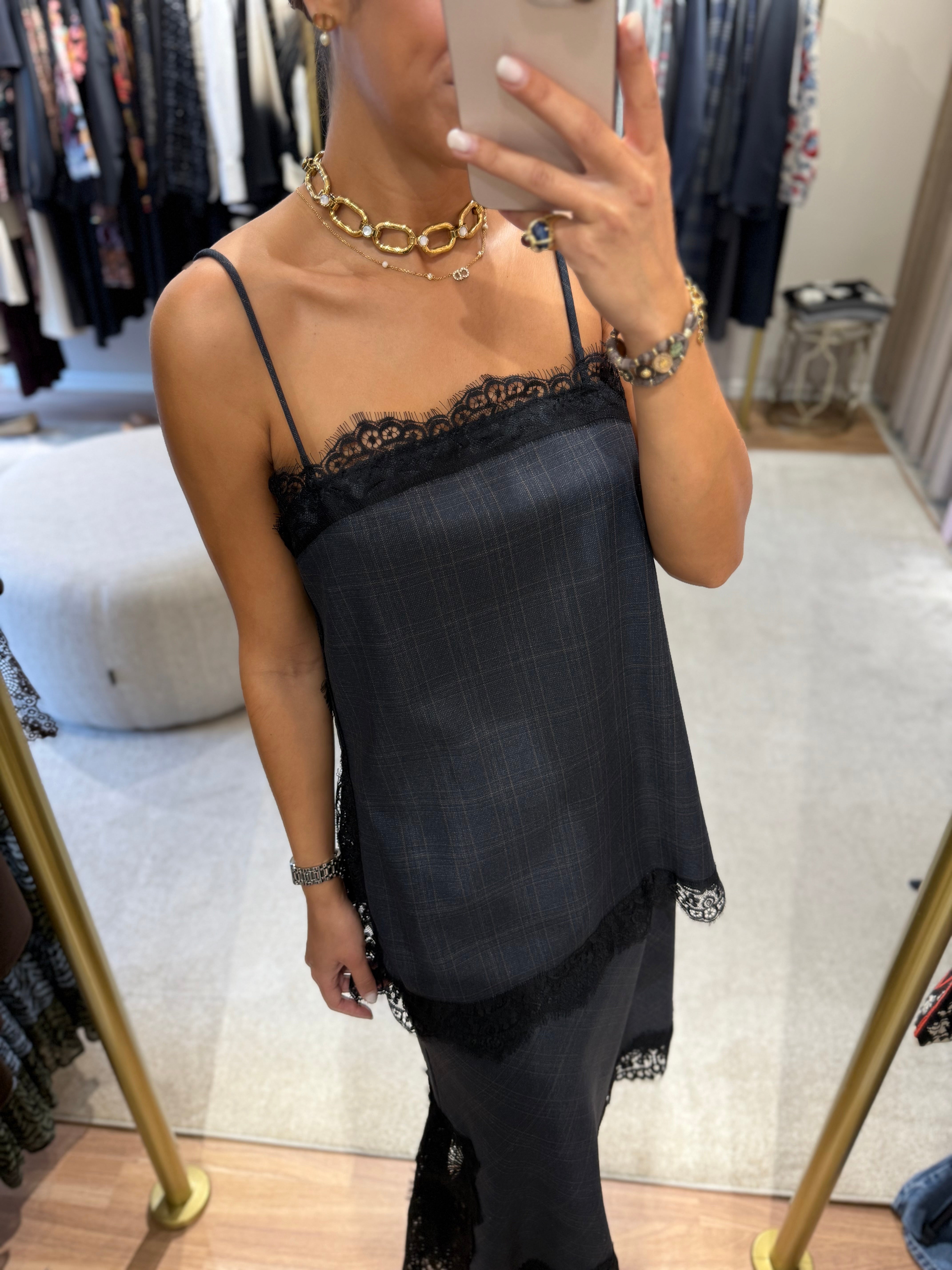 Top de alças em fazenda azul marinho ao xadrez com acabamento em renda na bainha.