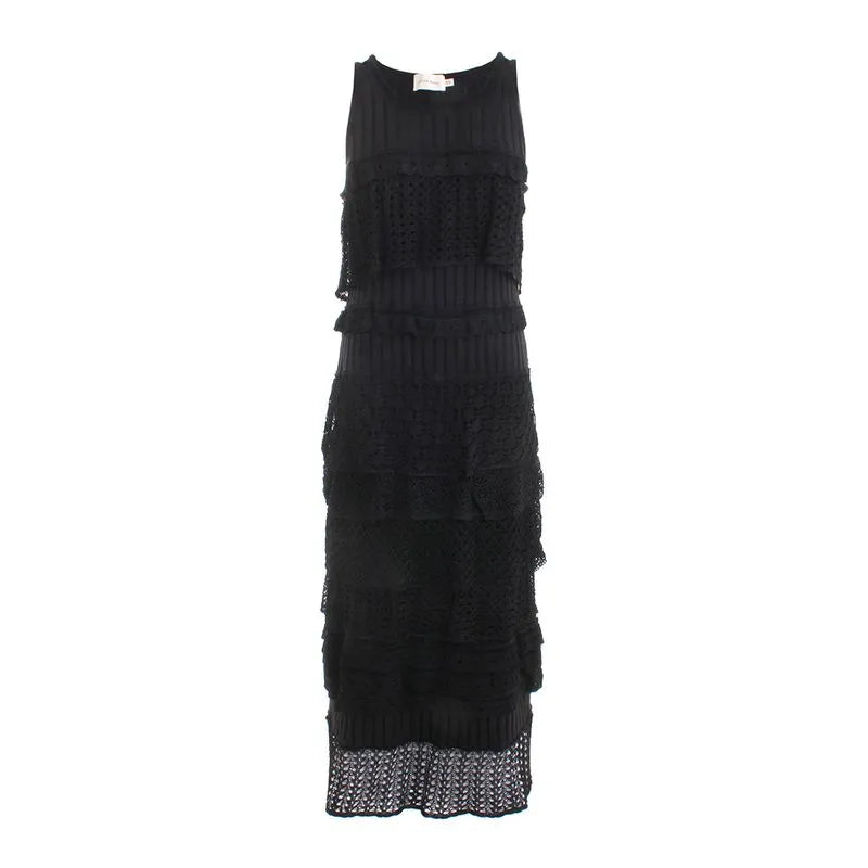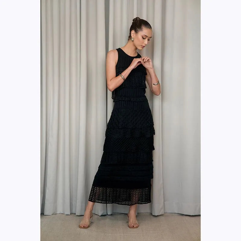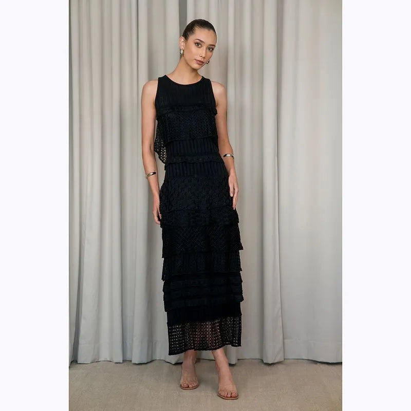 Vestido midi Cecilia Prado em malha tricotada preta, camadas de folhos em todo o comprimento, manga cava, com forro interior.