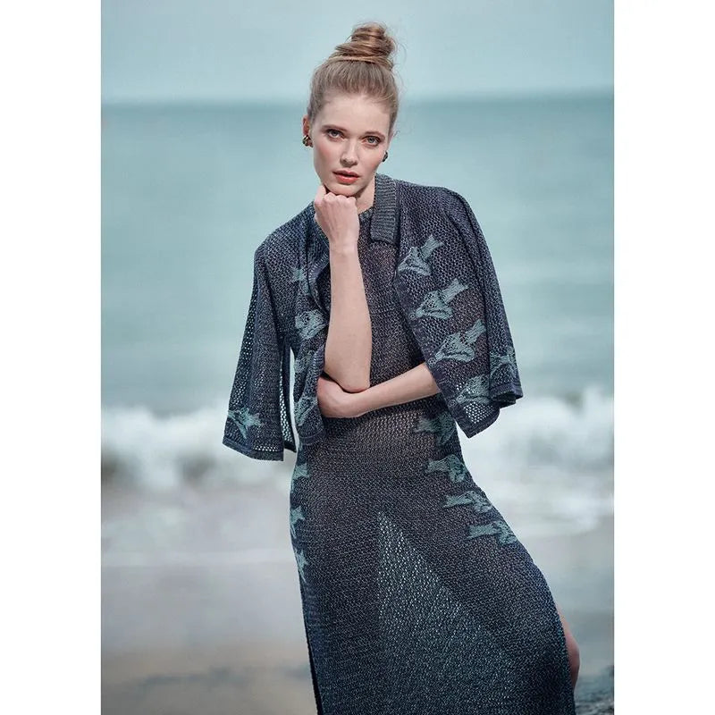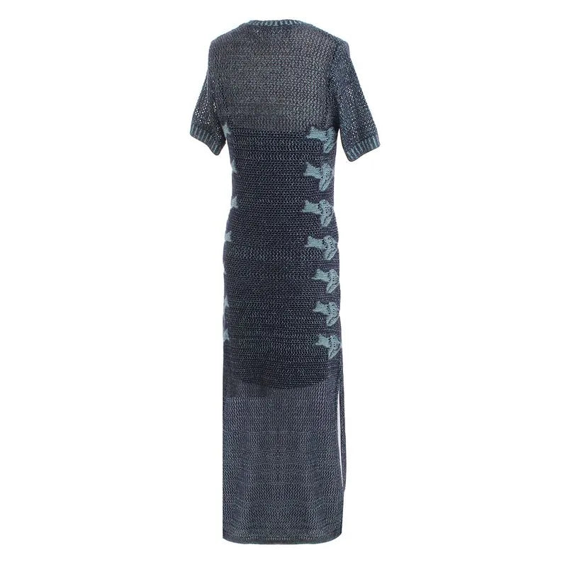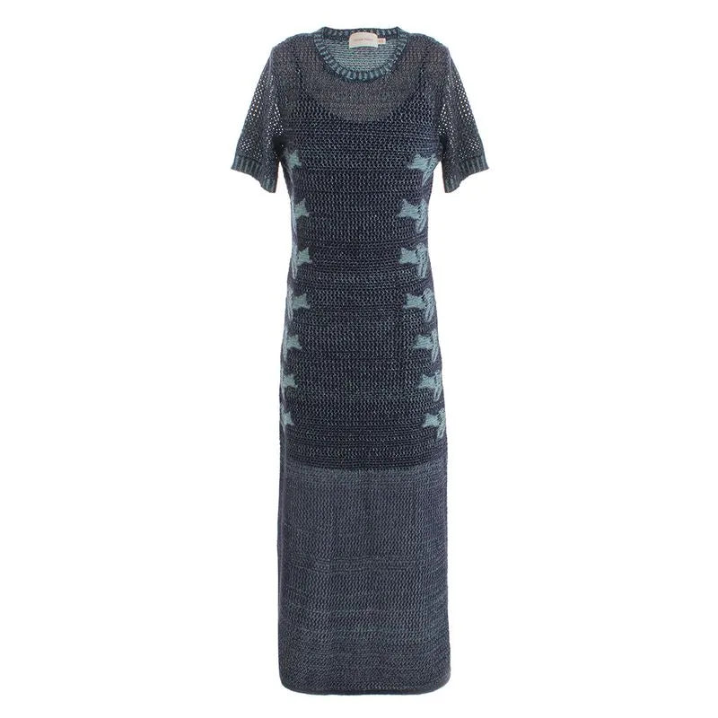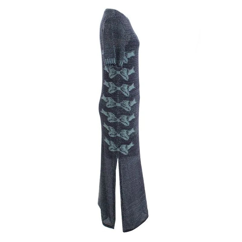 Vestido longo Cecilia Prado em malha tricotada azul com desenho de laços nas laterais, modelo justo, corte reto, manga curta, aberturas laterais na bainha, forro interior.