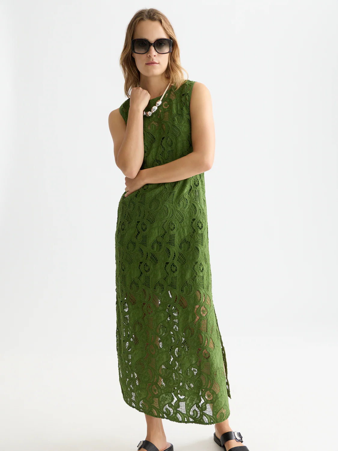 Descobre um vestido midi sem mangas com renda bordada, onde a delicadeza do bordado encontra a fluidez de um corte elegante e contemporâneo. Este vestido é a escolha perfeita para quem procura um visual feminino, sofisticado e confortável para várias ocasiões.