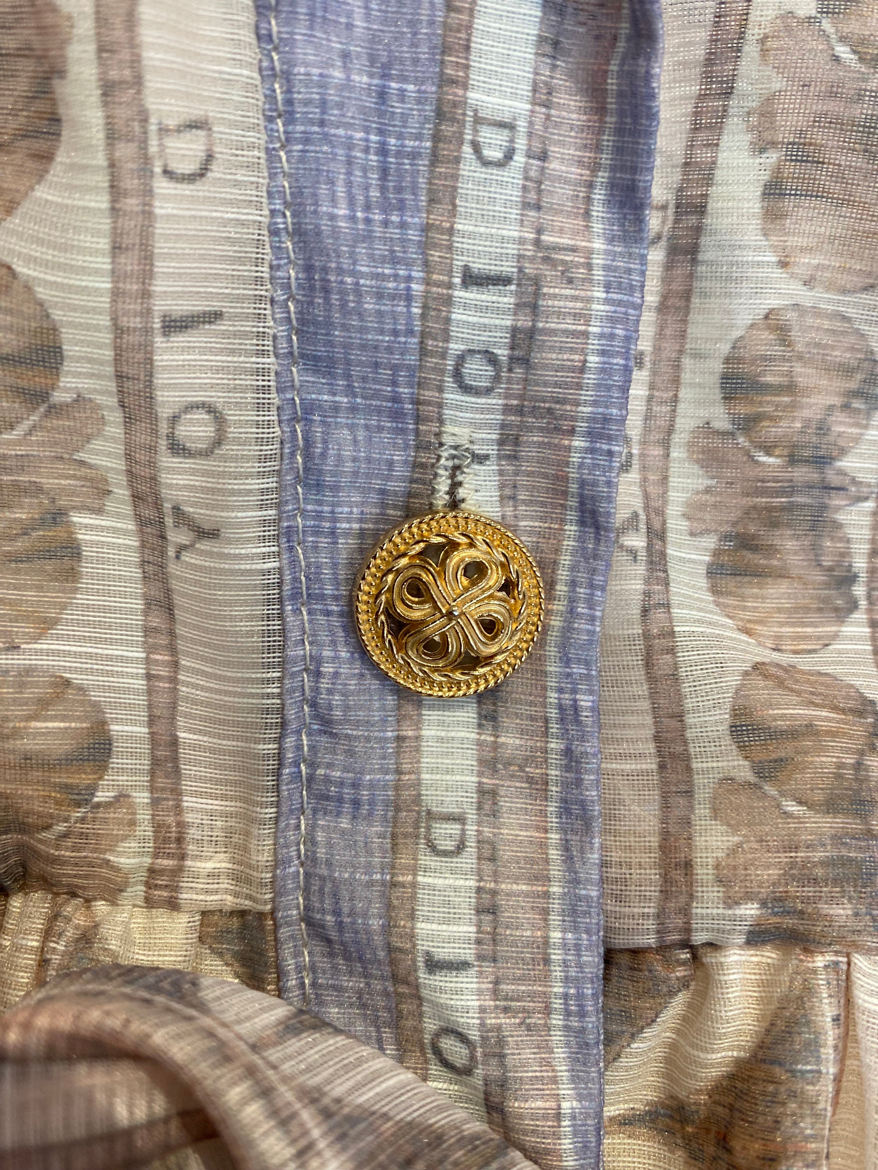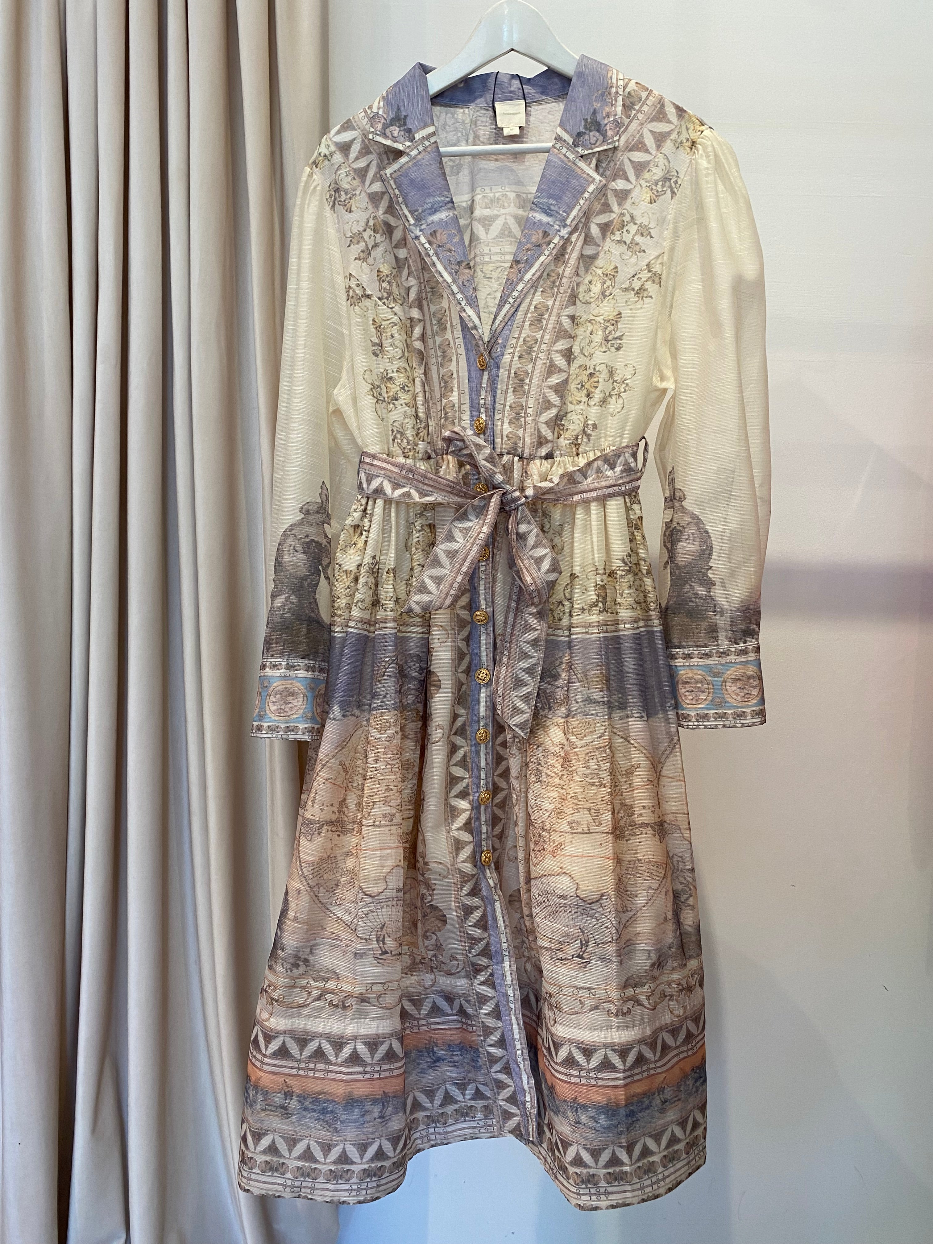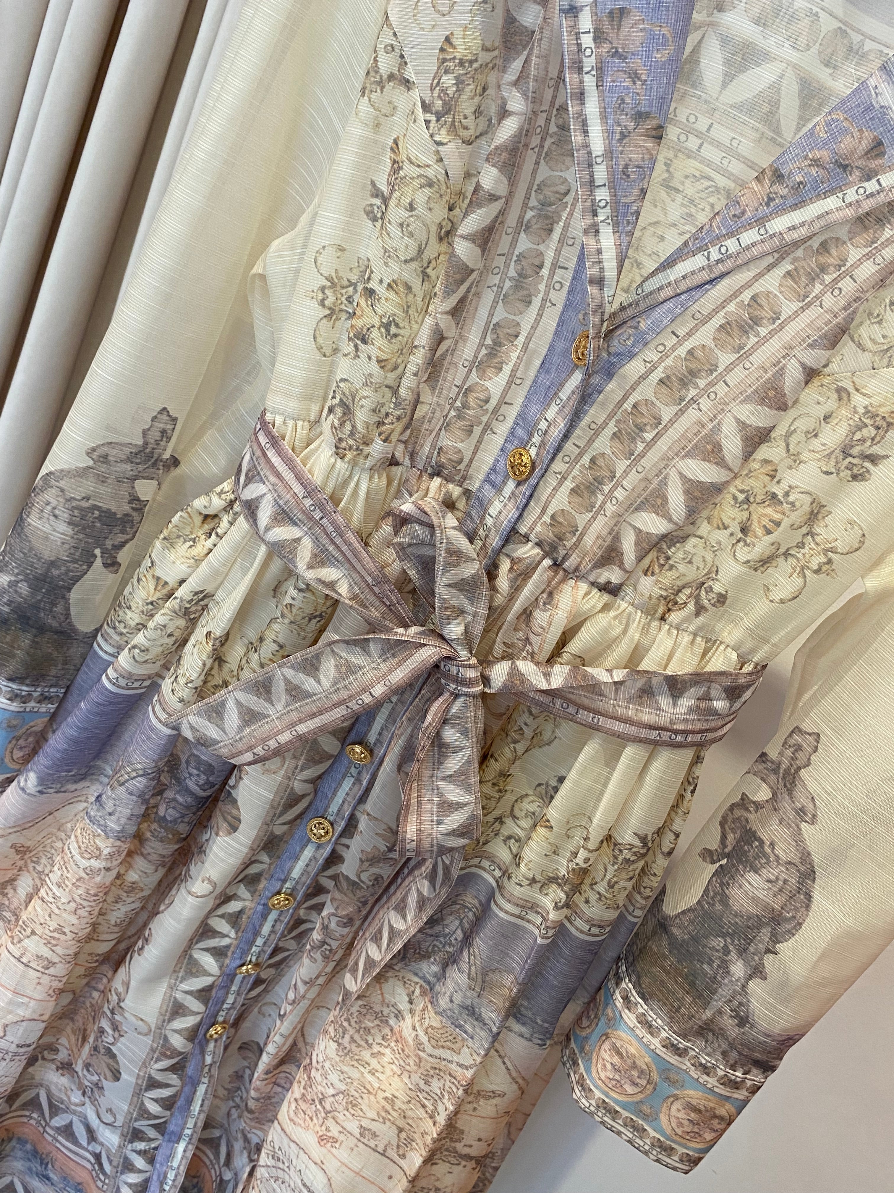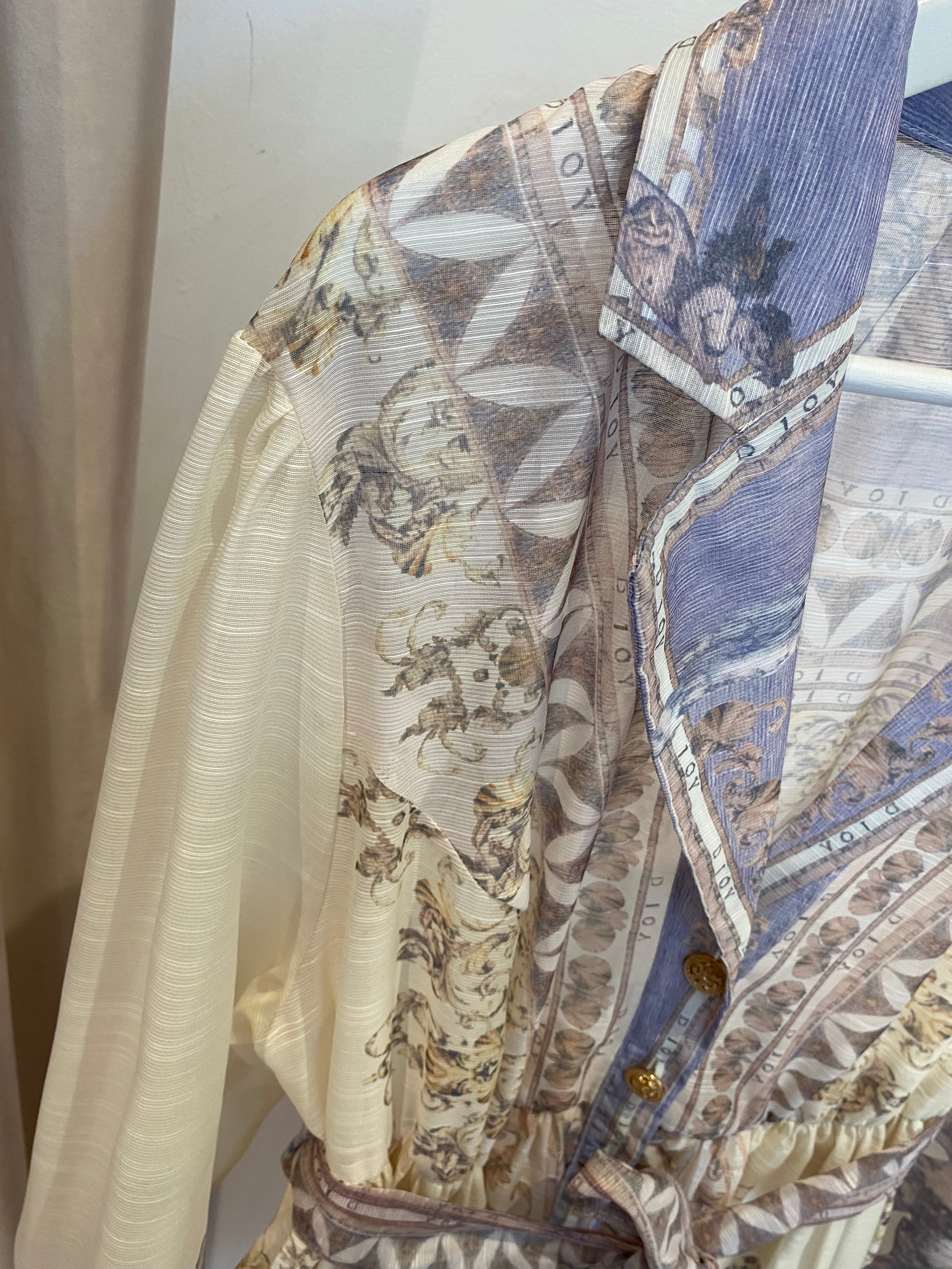 Vestido midi com padrão, mangas e tronco transparente, cinta elástica, cinto, gola clássica e decote em bico.