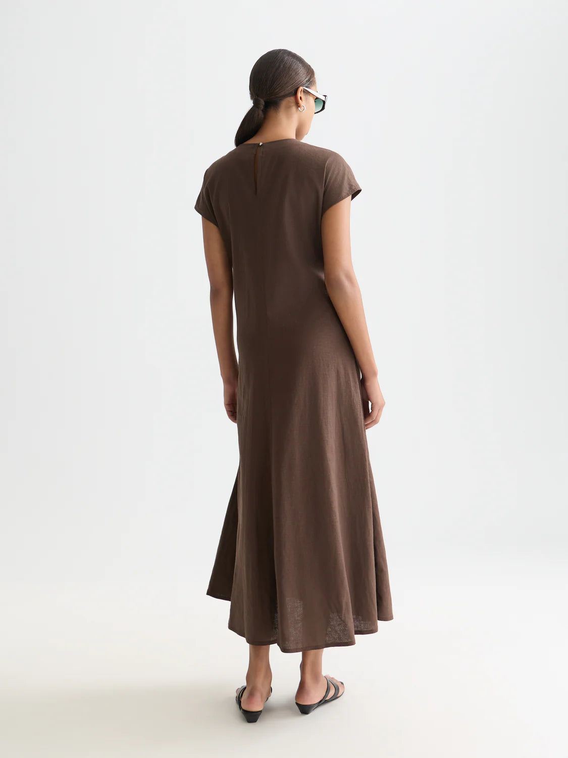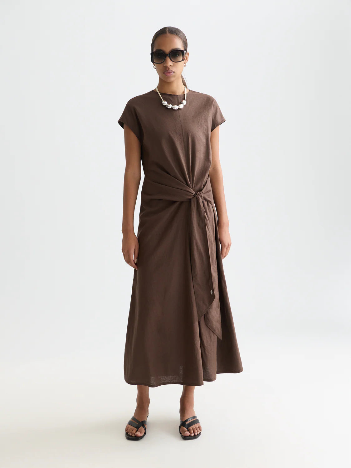 Este vestido descontraído em de linho castanho combina conforto e elegância discreta, sendo ideal para looks leves e sofisticados. Apresenta comprimento pelo tornozelo, decote redondo e mangas curtas que garantem um visual simples e intemporal. O detalhe de laço lateral acrescenta um toque feminino e permite ajustar ligeiramente o caimento, criando uma silhueta natural e fluida perfeita para o dia a dia.