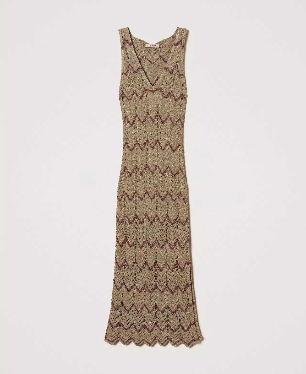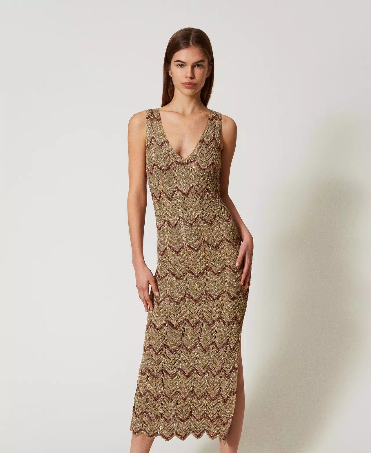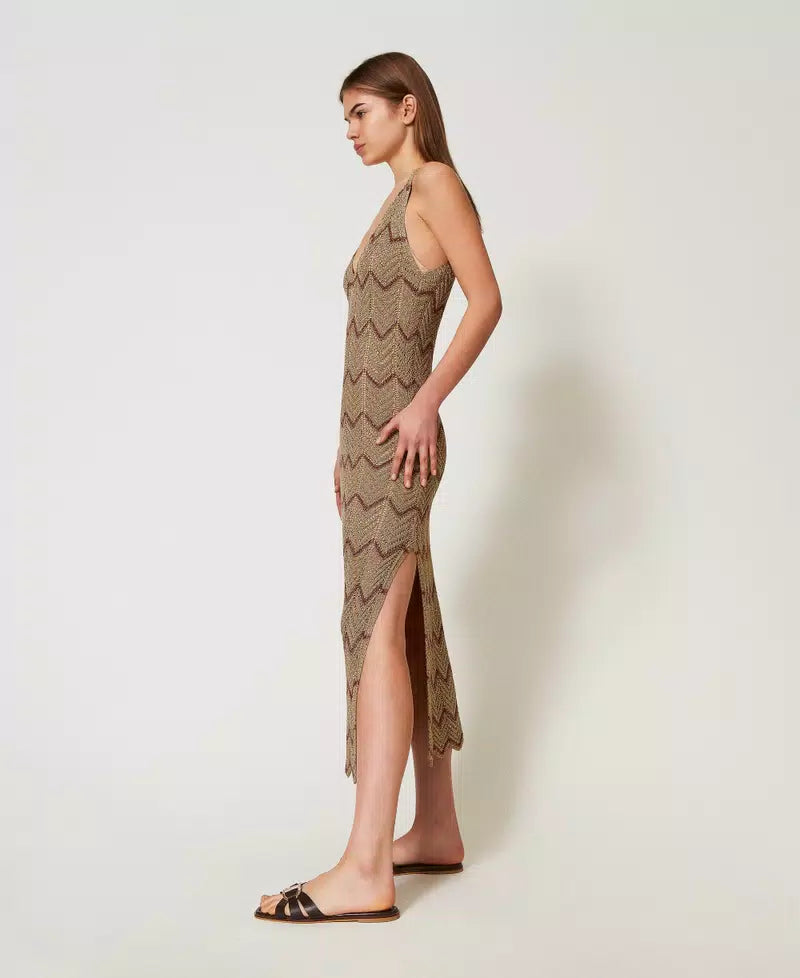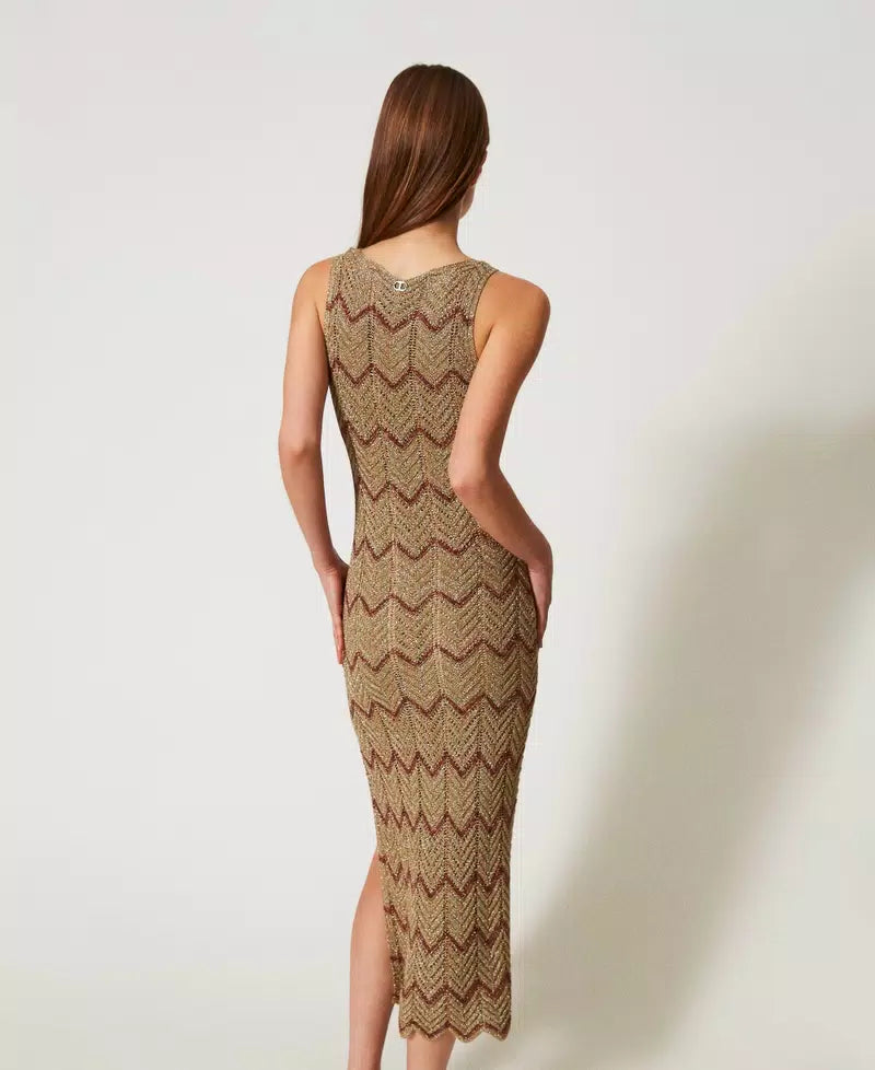 Vestido midi TWINSET em malha lurex bicolor de manga cava com padrões geométricos perfurados, bainha recortada e abertura latural em baixo.