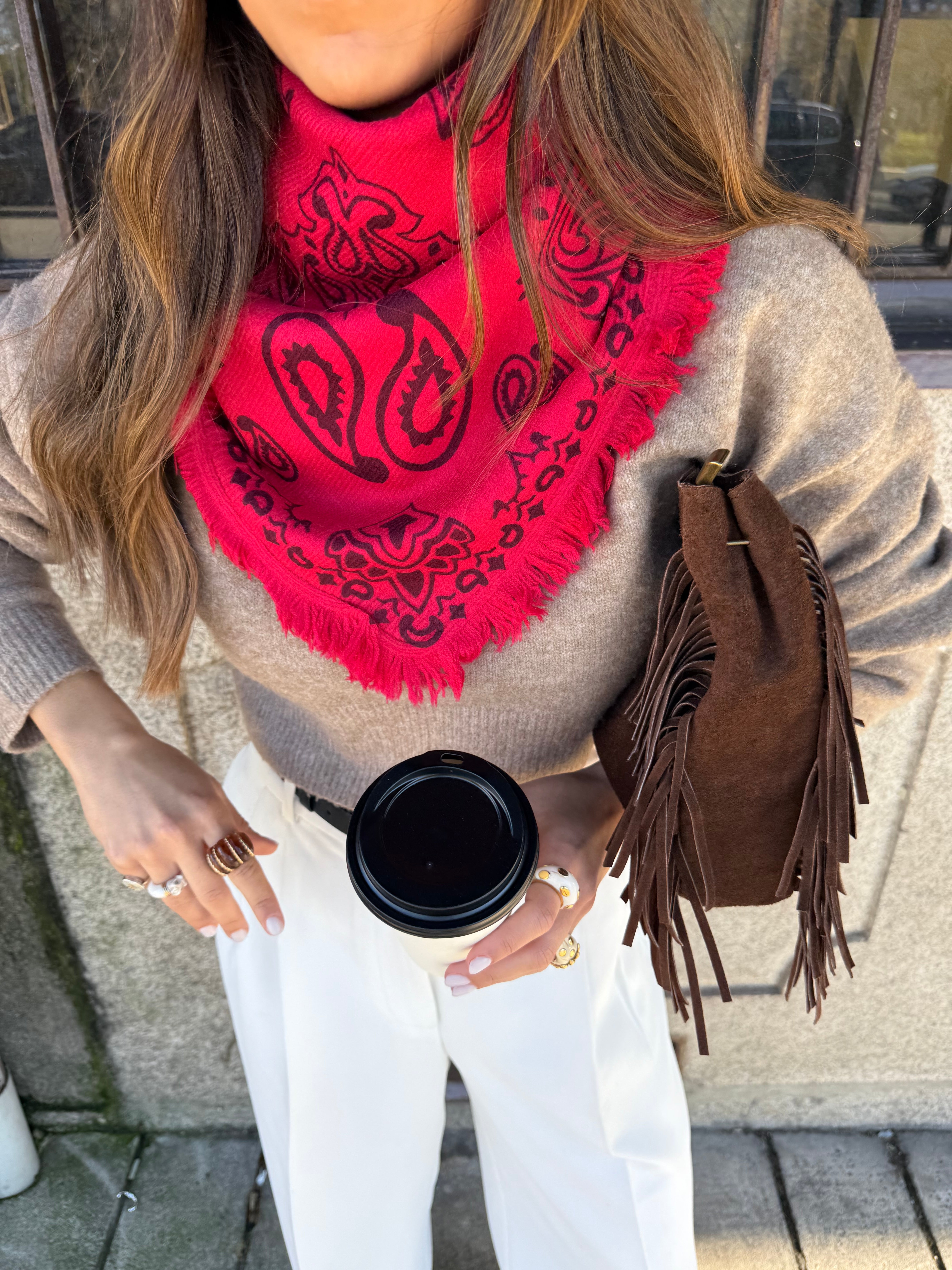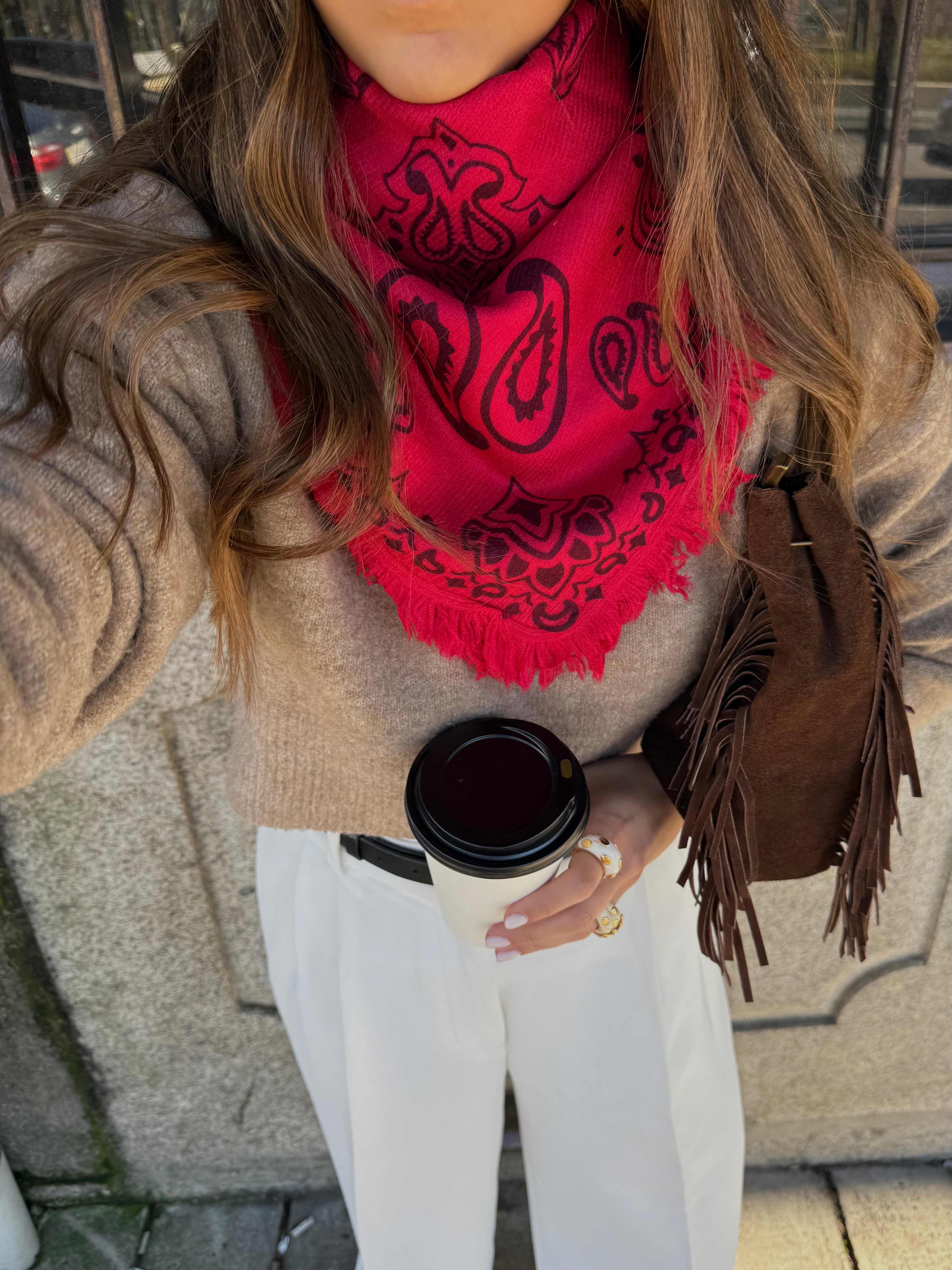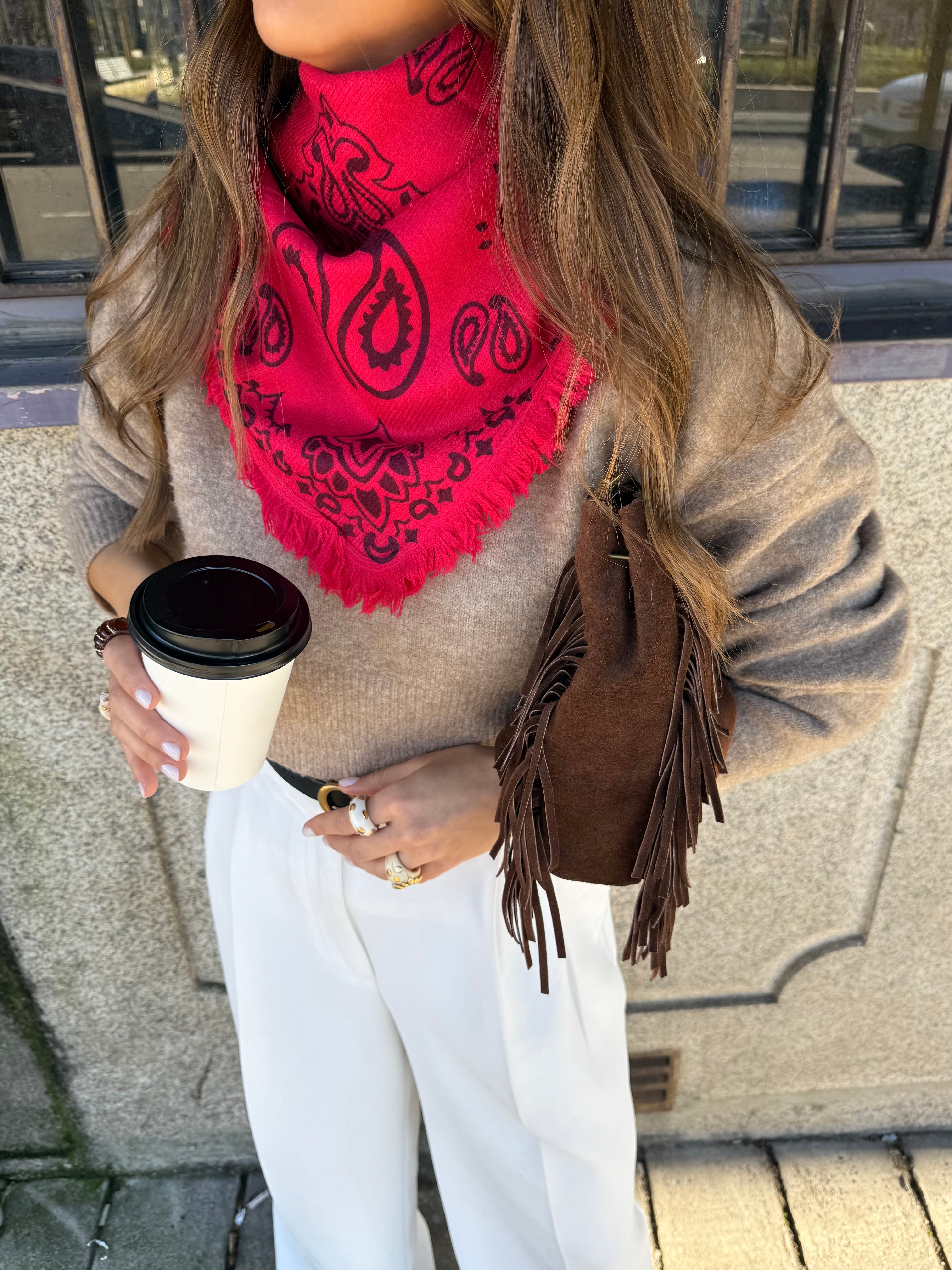 Este lenço quadrado estampa bandana é feito em malha macia e aconchegante (50% viscose, 50% poliamida) oferecendo leveza e aquecimento na medida certa. O formato triangular facilita o styling: use como cachecol, xale ou ponto de destaque sobre casacos e tricots. Versátil, estiloso e perfeito para elevar qualquer look com um toque moderno e confortável.