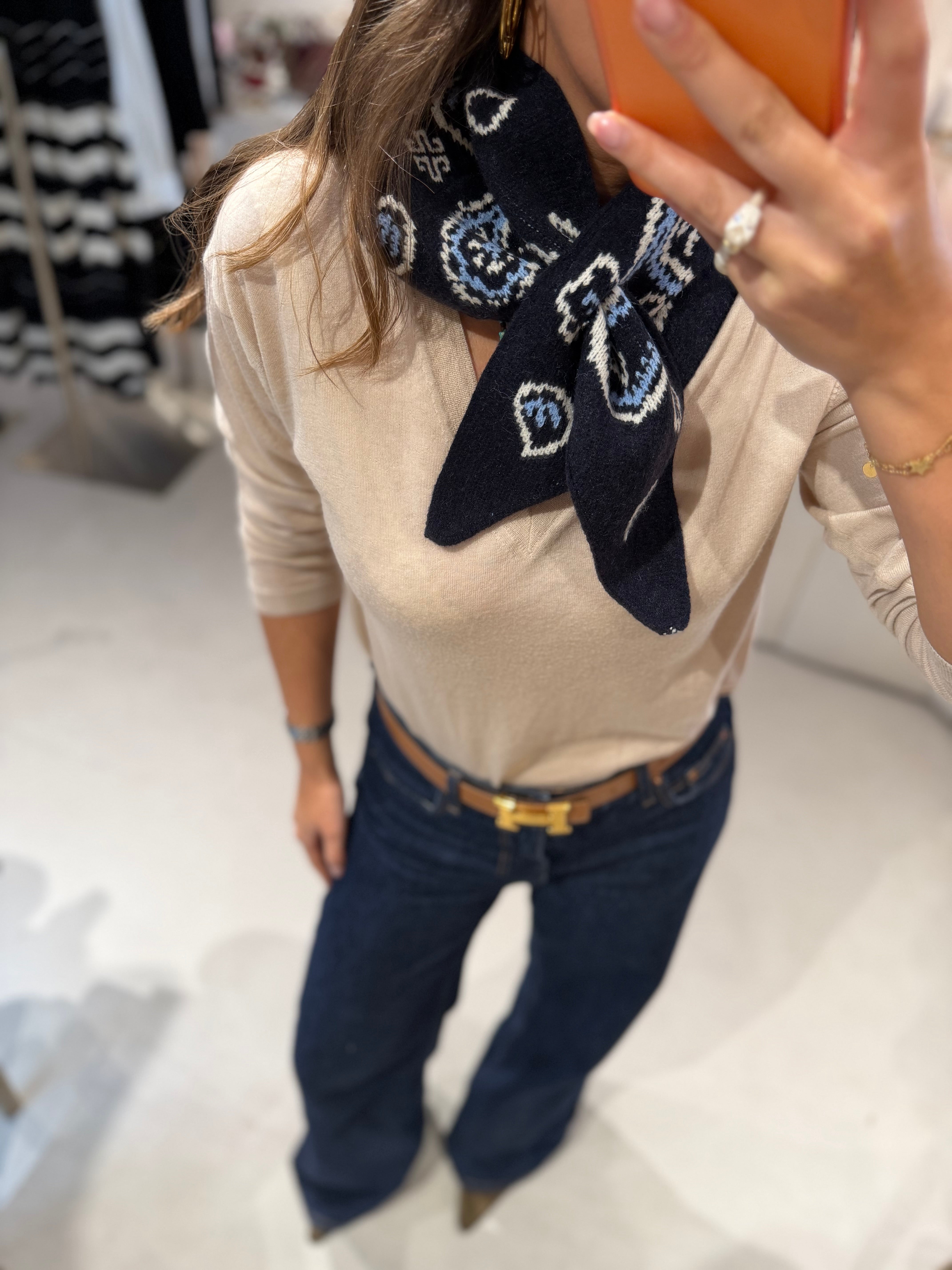 Este lenço triangular estampa bandana é feito em malha macia e aconchegante (40% viscose, 30% poliamida, 20% lã e 10% caxemira), oferecendo leveza e aquecimento na medida certa. O formato triangular facilita o styling: use como cachecol, xale ou ponto de destaque sobre casacos e tricots. Versátil, estiloso e perfeito para elevar qualquer look com um toque moderno e confortável.