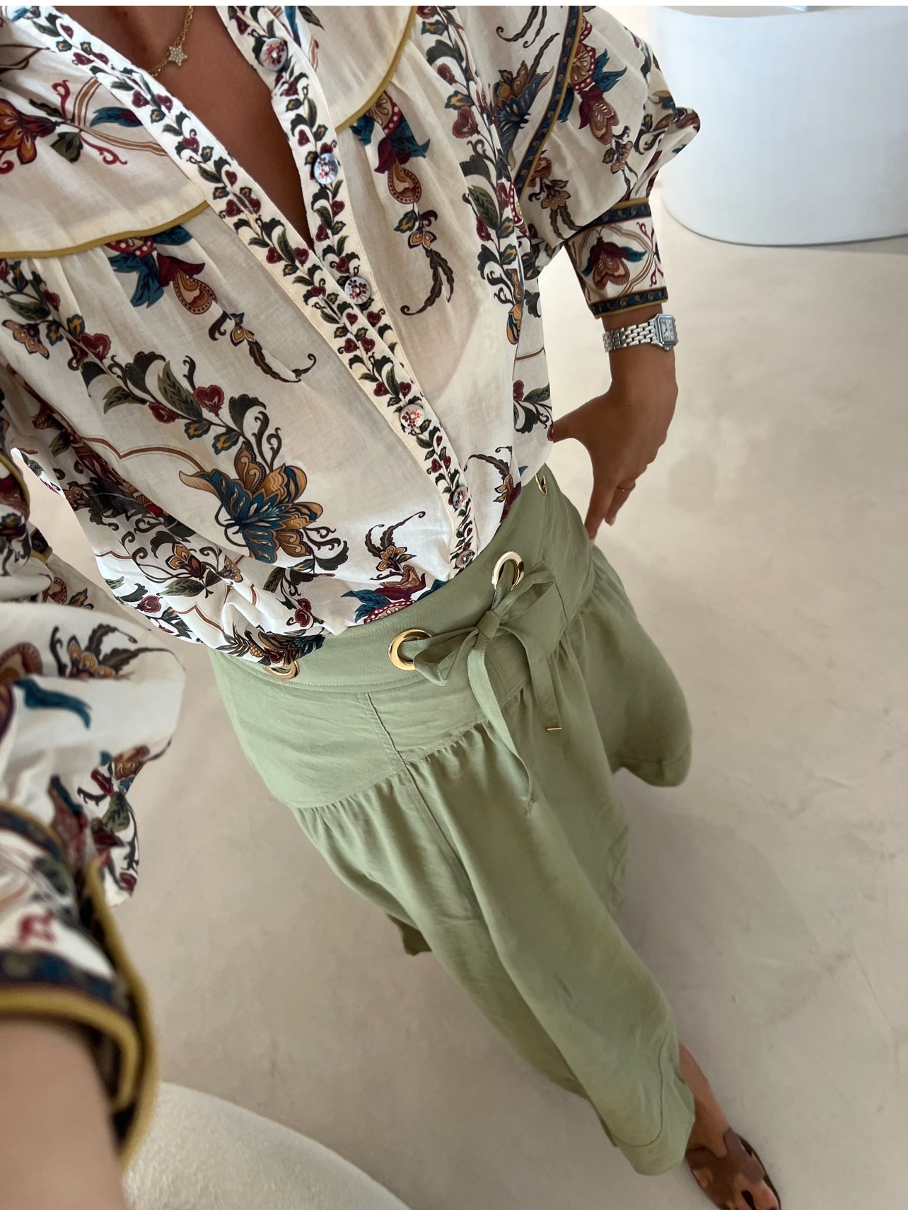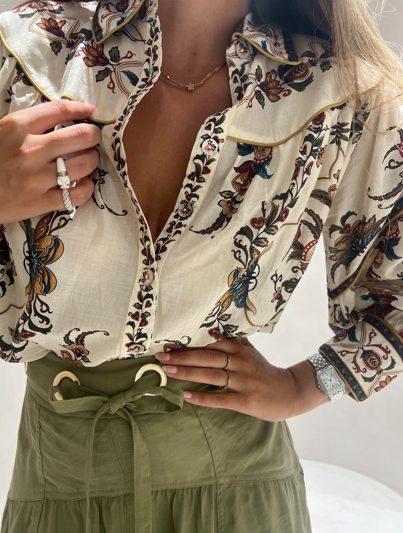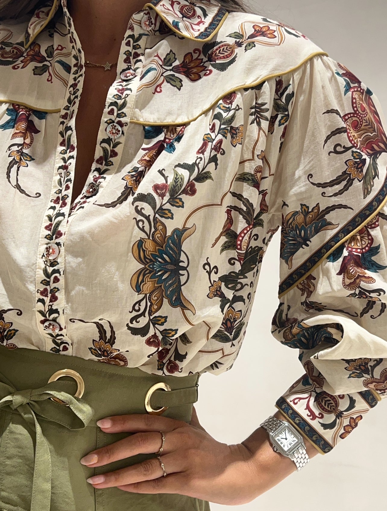 Blusa de algodão com padrão floral com golas clássicas e fecho de botões à frente, corte solto e botões nos punhos.