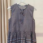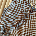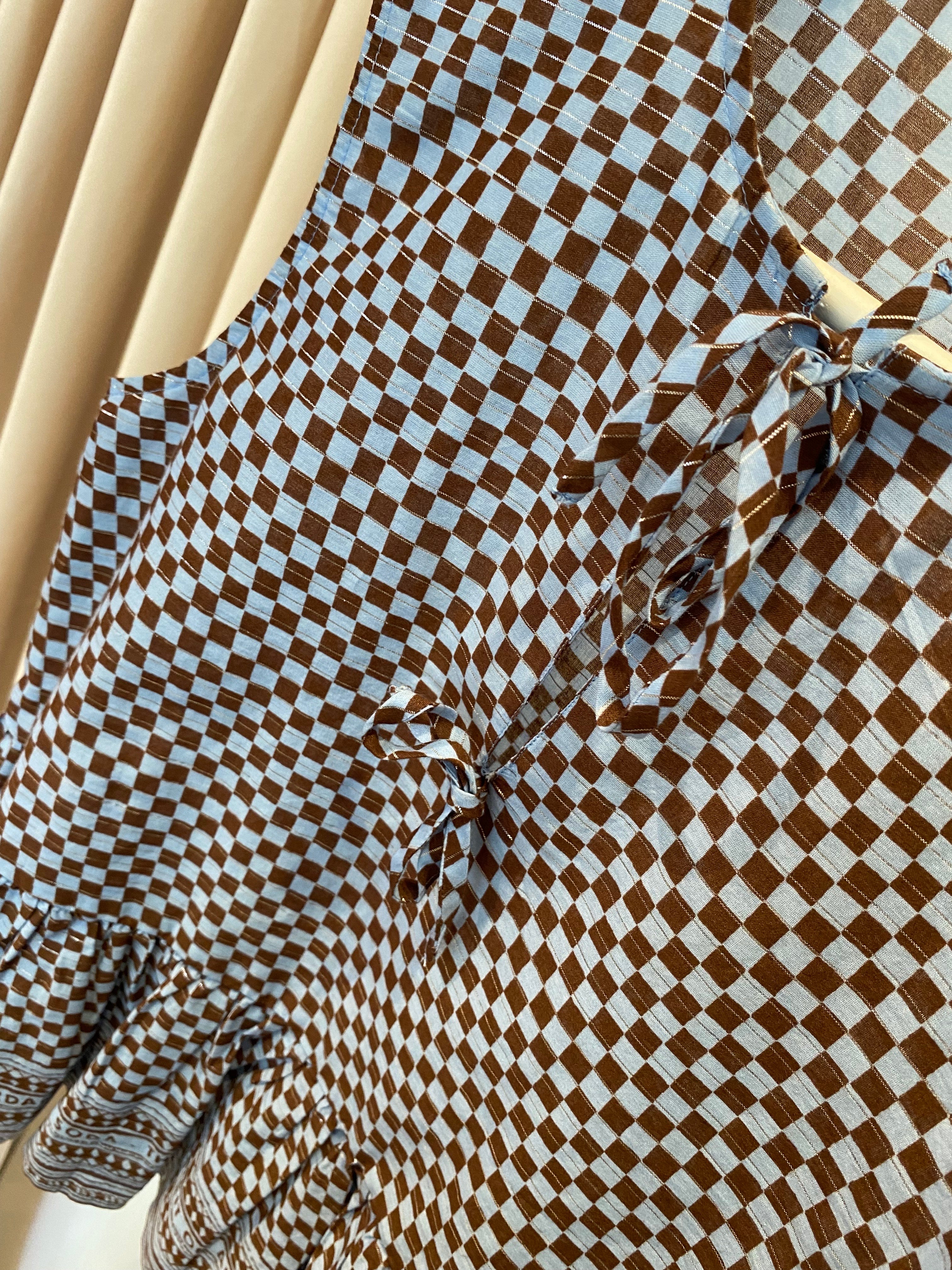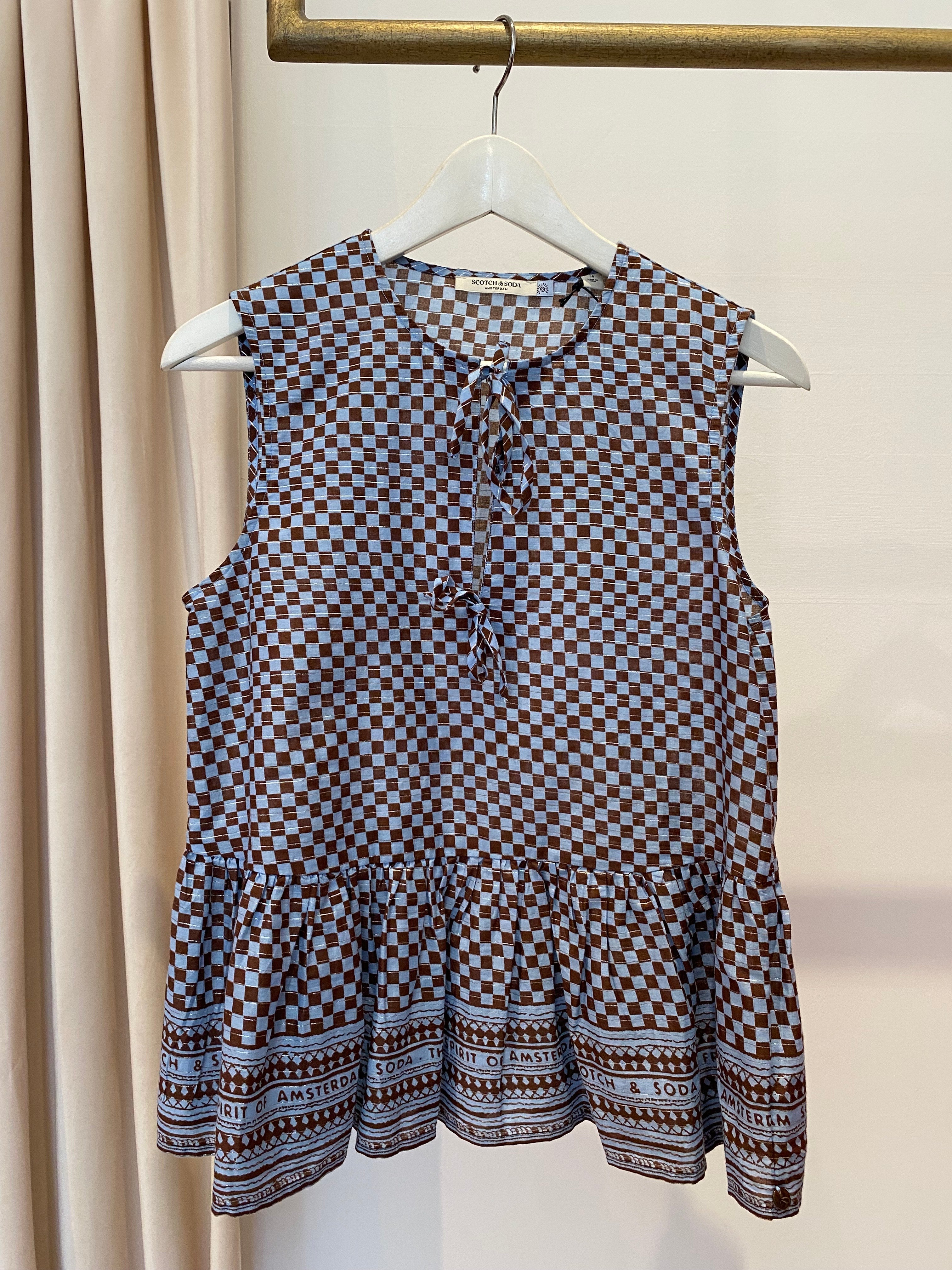 Blusa Scotch&soda Xadrez azul e castanho com laços ajustáveis no peito, manga à cava e folho em baixo.