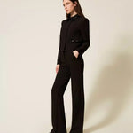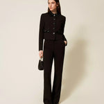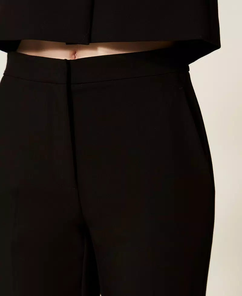 Calças em crepe fluido com modelagem palazzo que combinam leveza e sofisticação. O vinco central acentua a estrutura elegante, enquanto o corte amplo proporciona movimento e conforto. Ideal para criar looks de contraste: ajuste no topo e volume nas pernas, ou usadas com blazer fluido para um visual refinado e contemporâneo.
