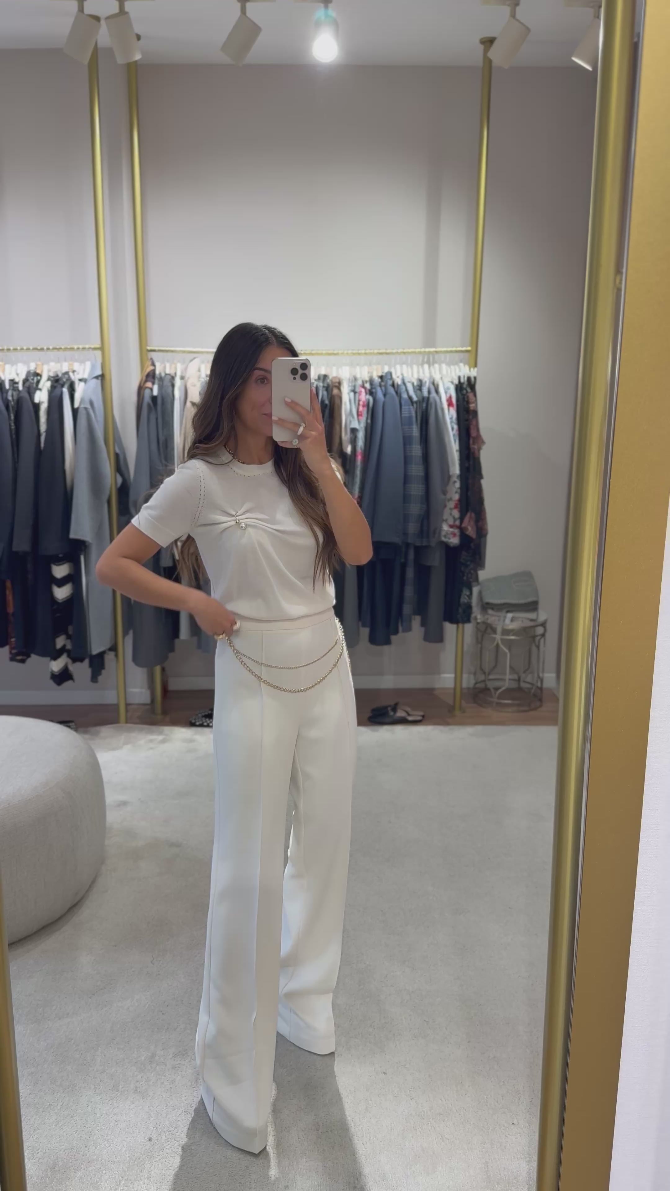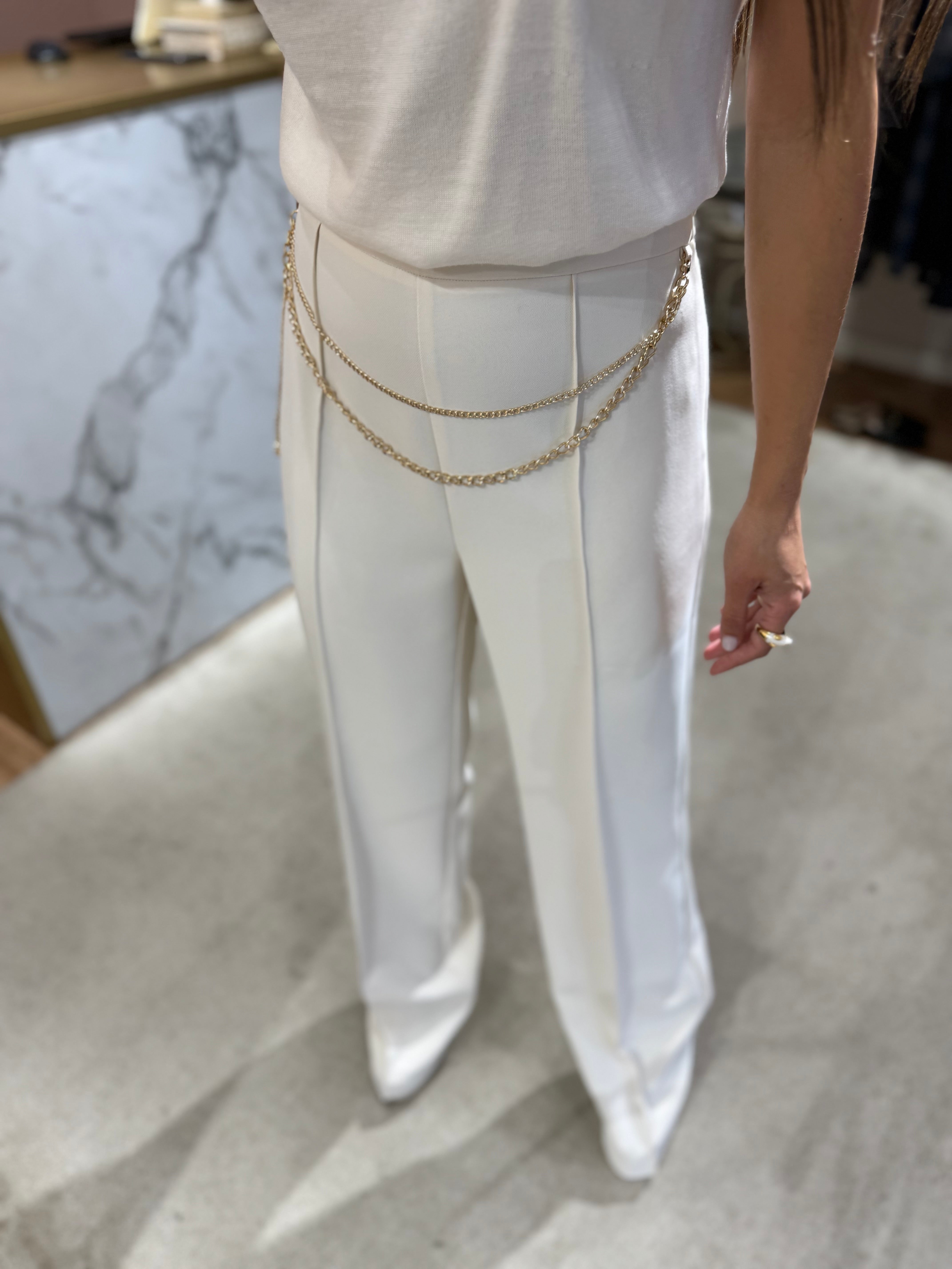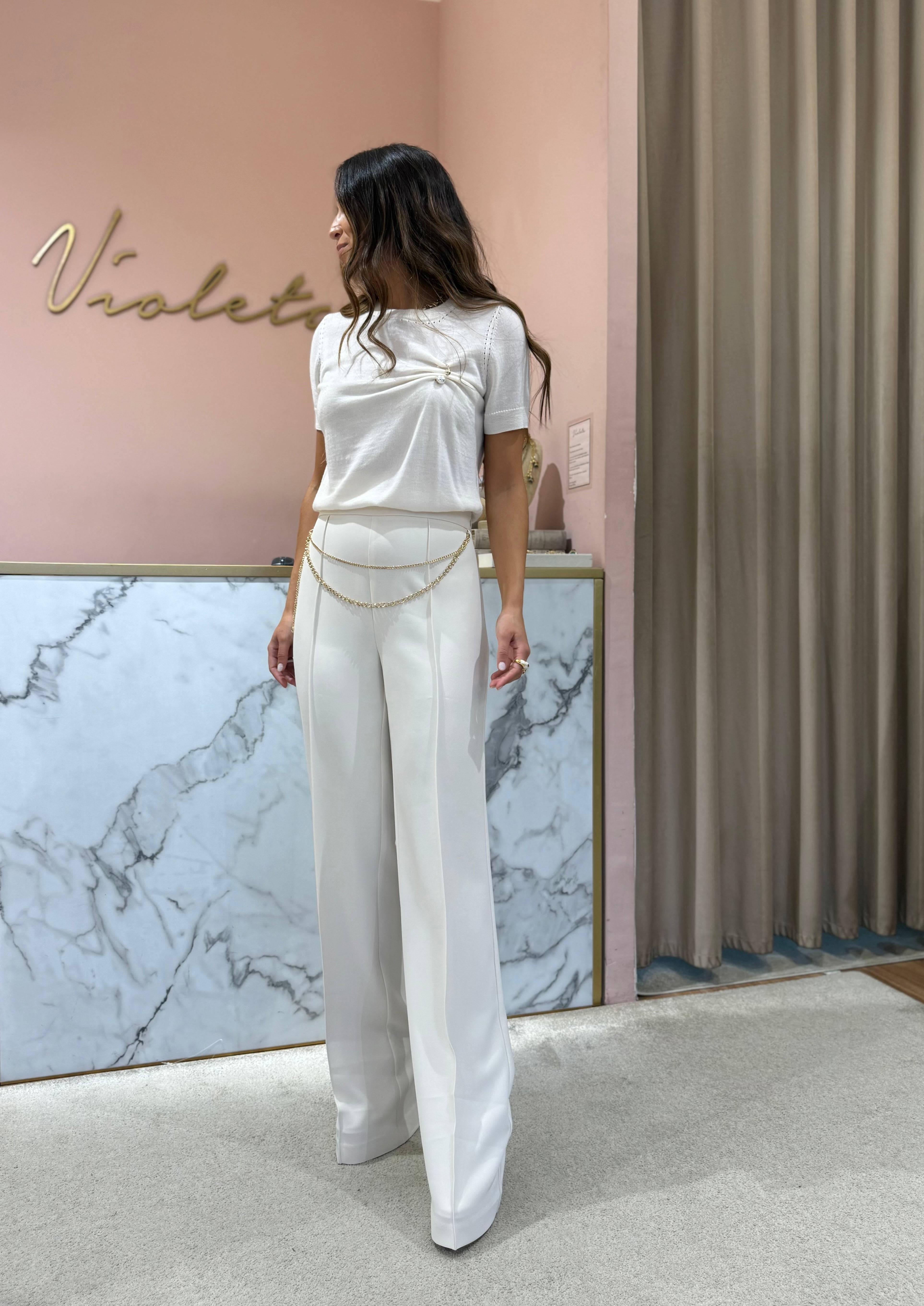As calças palazzo em crepe com cinto da Twinset são a definição perfeita de elegância versátil. Com um estilo palazzo fluído, apresentam cintura alta, fecho lateral discreto e uma costura central que acentua o corte alongado. O destaque fica por conta do cinto removível em corrente metálica com detalhes ovais (T), que acrescenta um elemento sofisticado e distintivo.