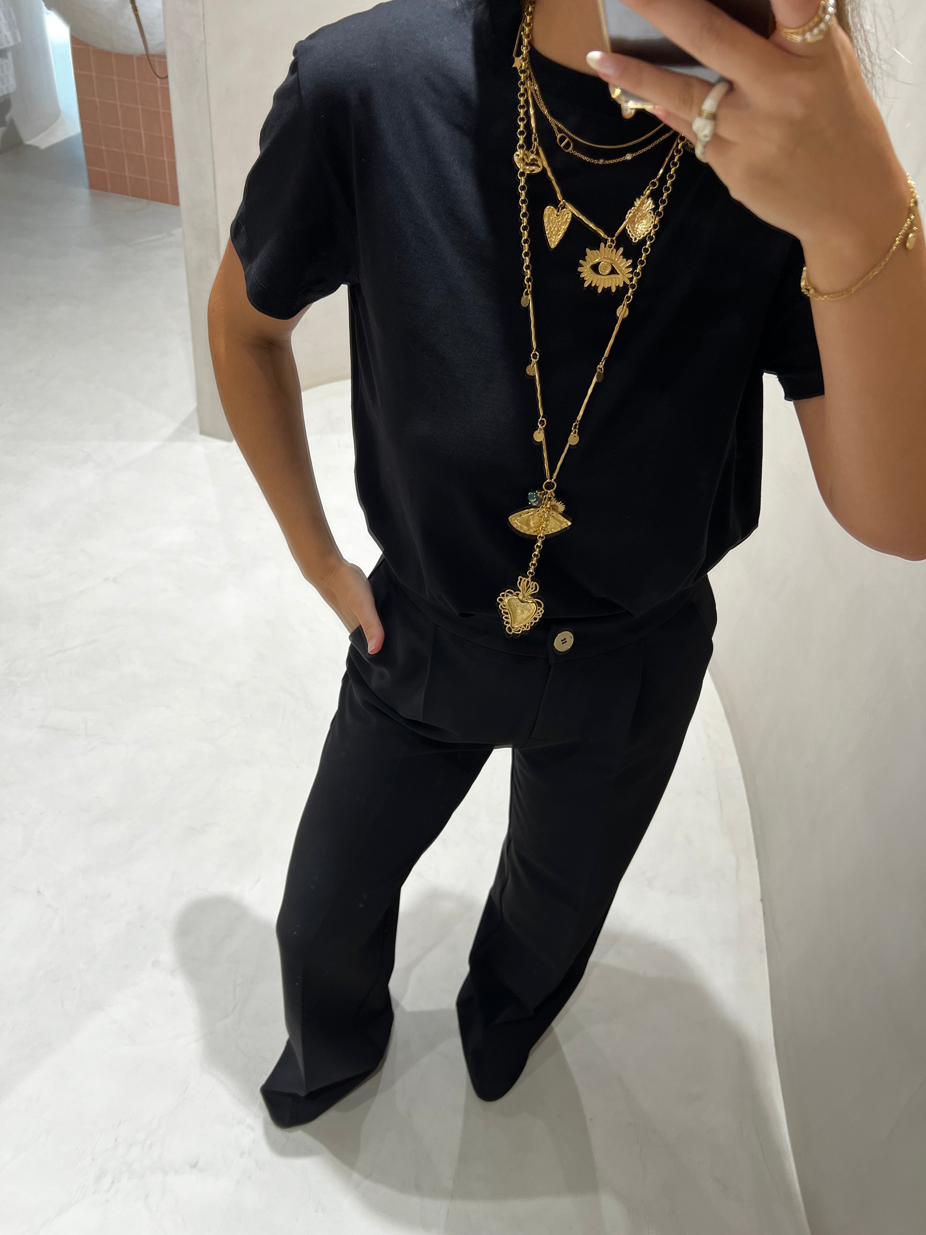 Calça pantalona Nenette com duas pregas à frente, botão dourado e fecho oculto.