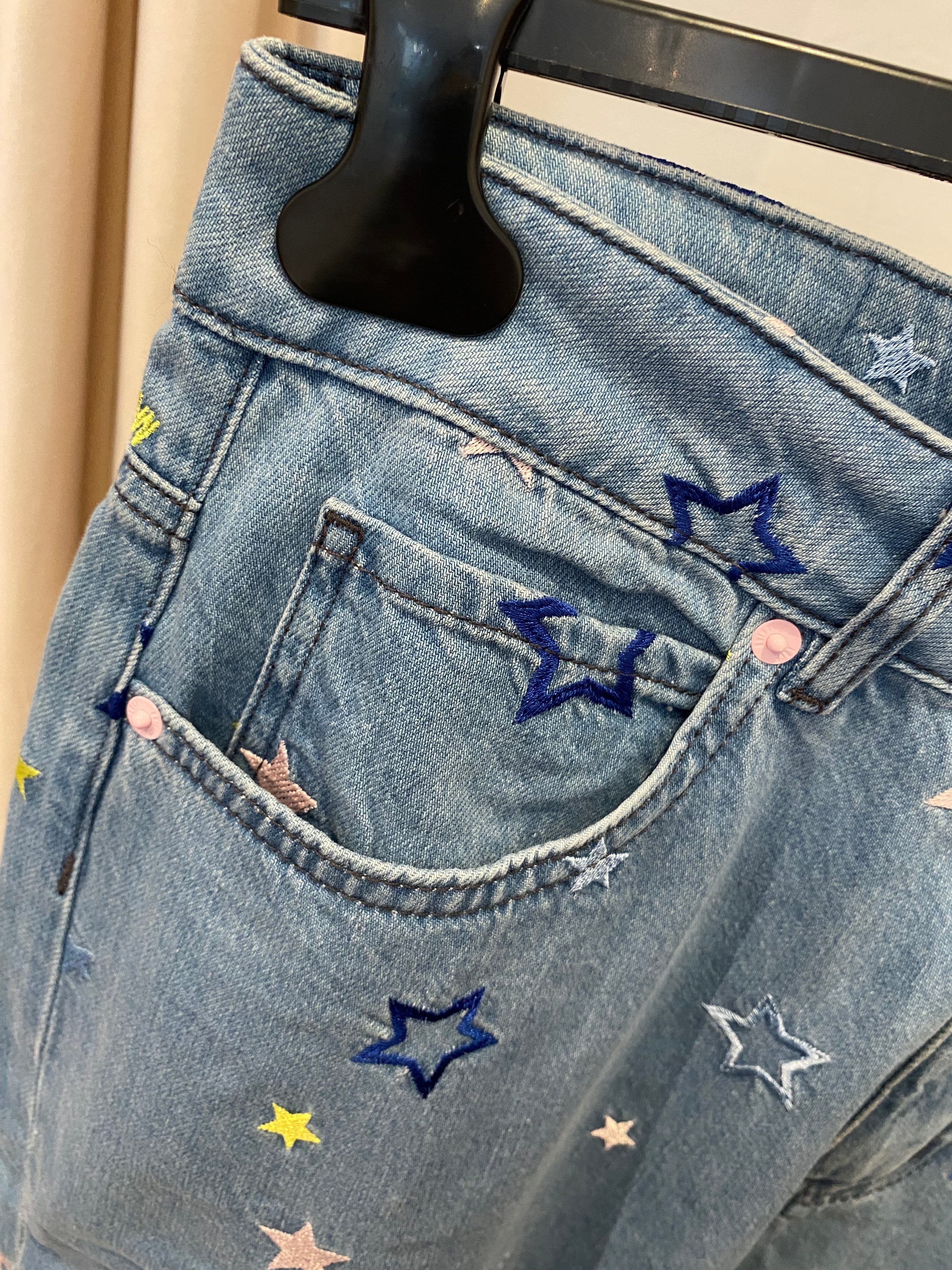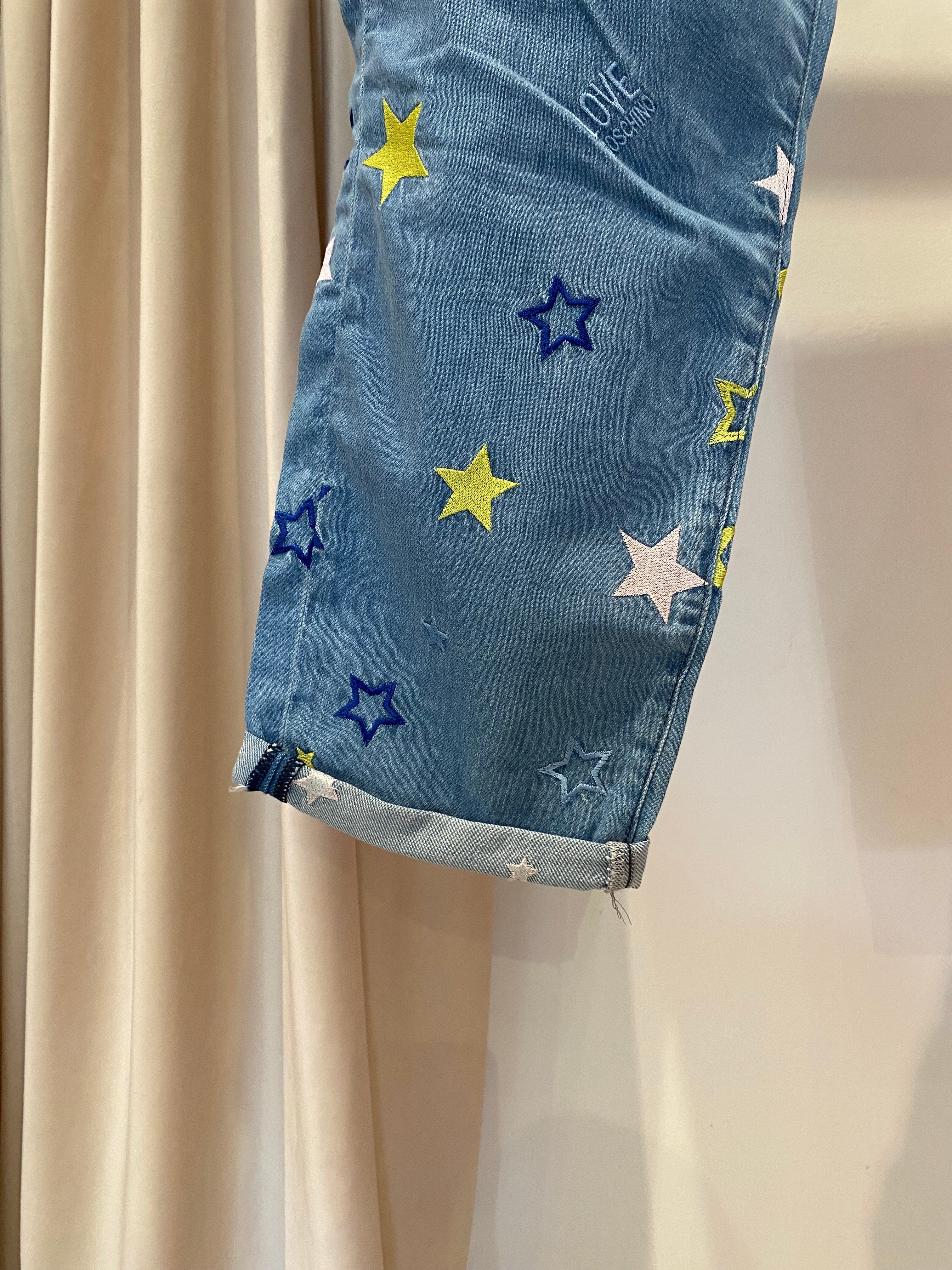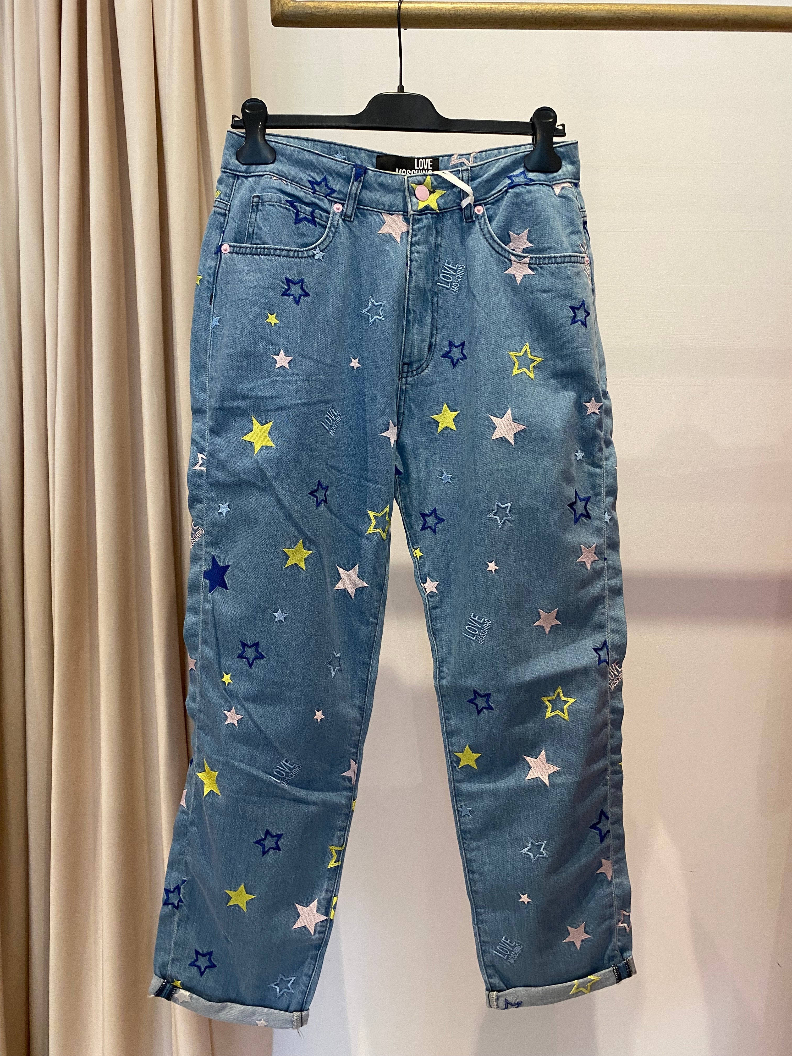 Calças de ganga LOVE MOSCHINO com estrelas e logotipo bordado. Bolsos à frente e atrás.