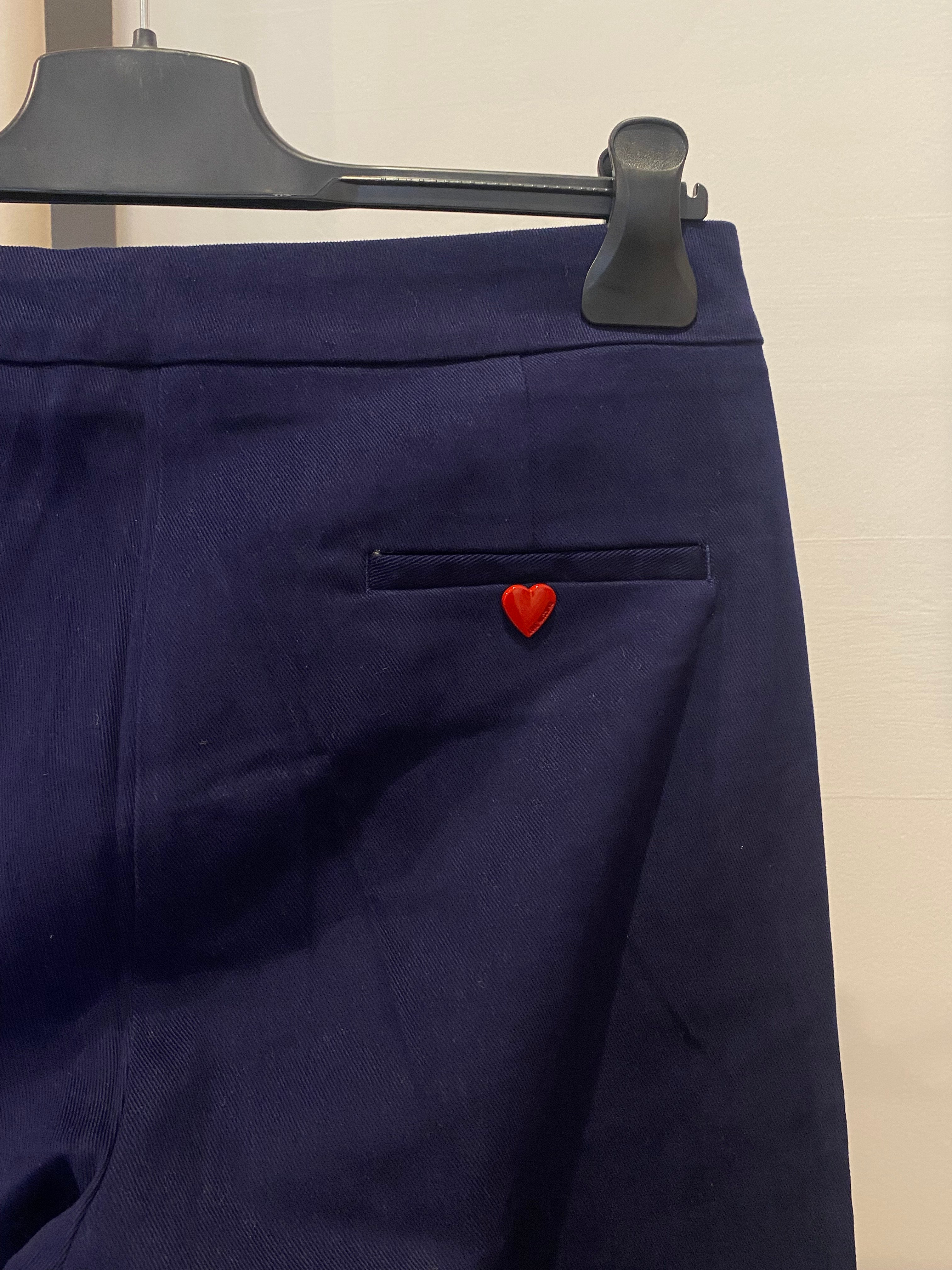 Calças de ganga LOVE MOSCHINO em azul marinho, dois bolsos frontais e um com botão em forma de coração vermelho atrás.