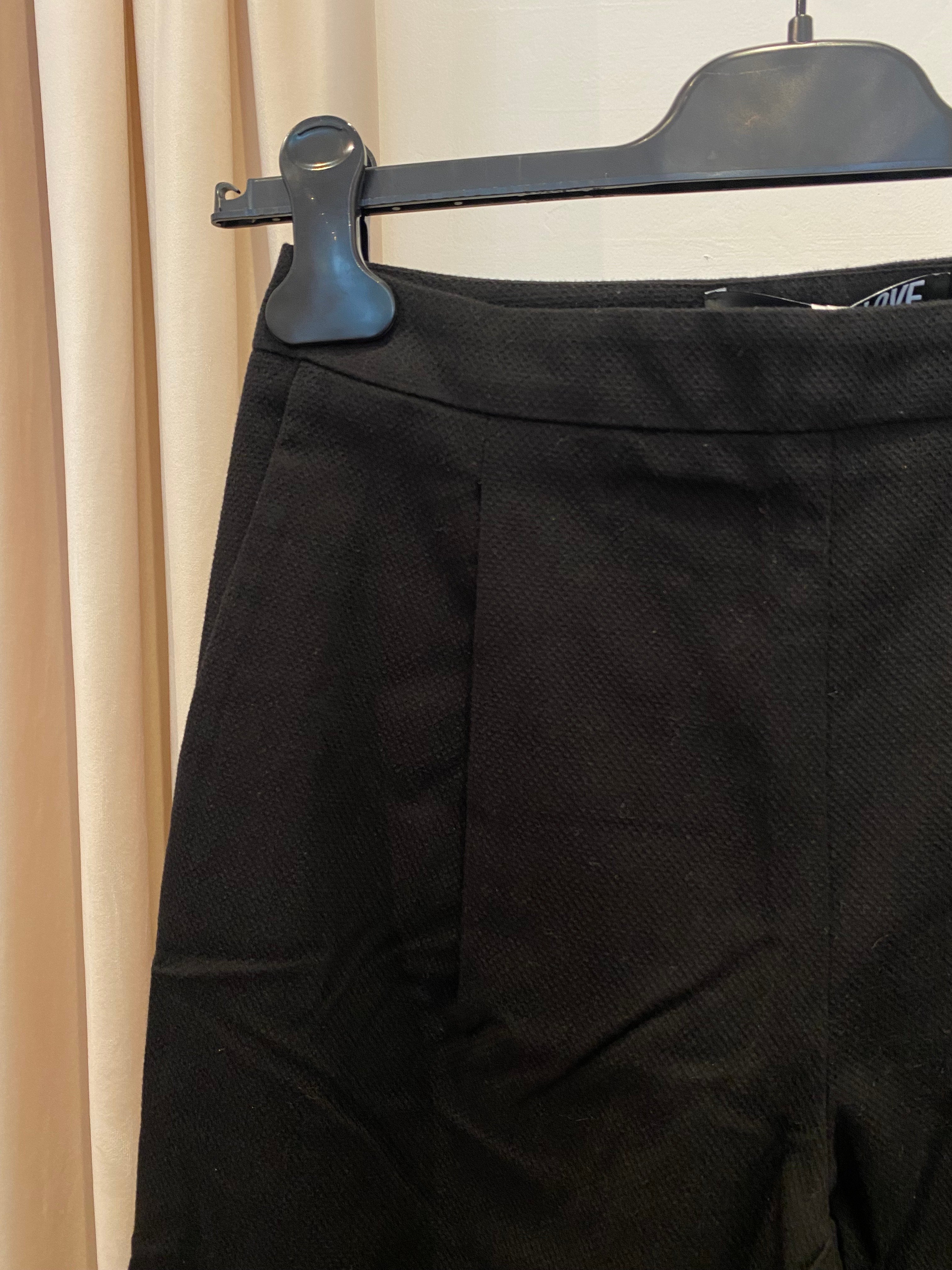Calças LOVE MOSCHINO em preto, bolsos laterais, bolso falso atrás, pregas à frente e atrás.