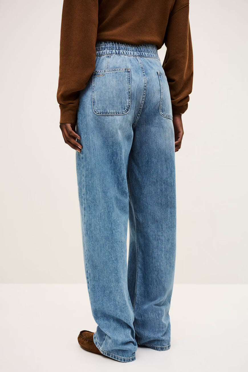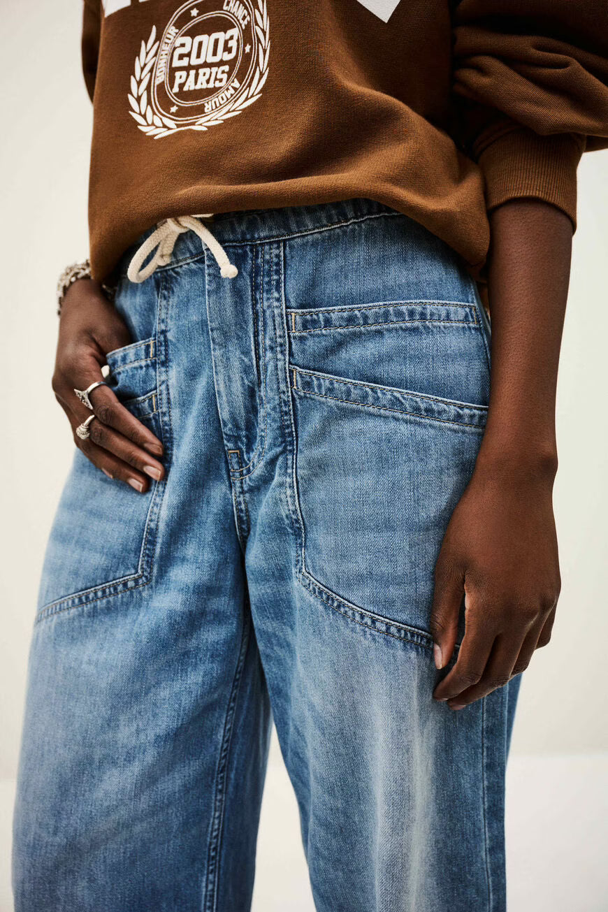As Calças Mima Bluejeans da ba&sh são um clássico contemporâneo que une conforto, estilo casual e atitude parisiense. Confeccionadas em 100% algodão de alta qualidade, estas calças jeans destacam‑se pelo corte amplo (wide) e pela cintura elástica com cordão ajustável, que proporcionam um caimento relaxado e confortável sem perder o charme.