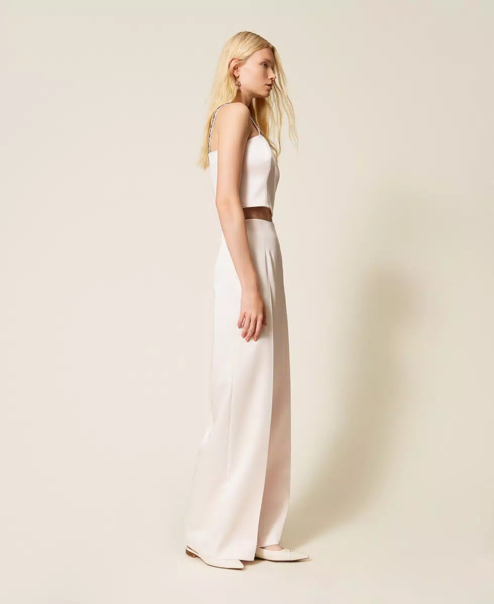 As Duchess Palazzo Trousers da TWINSET são calças femininas sofisticadas com corte palazzo de perna ampla e cintura alta, perfeitas para looks elegantes e contemporâneos. Confeccionadas em tecido duchess com vinco marcado, apresentam fecho lateral com zíper e bolsos laterais, garantindo um caimento fluido e confortável em qualquer ocasião. Ideais para combinações com blusas estruturadas ou tops delicados, estas calças elevam o seu guarda‑roupa com um toque de sofisticação fashion.