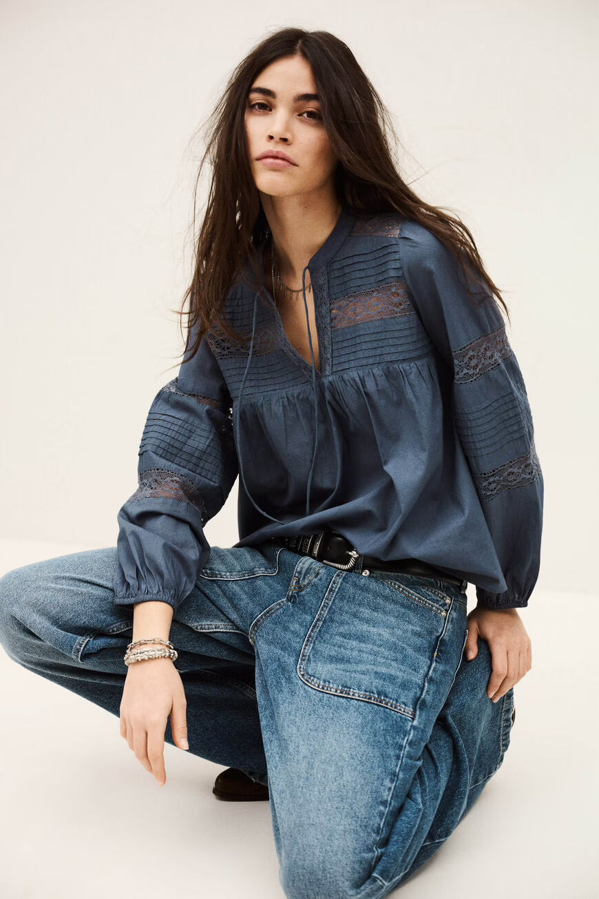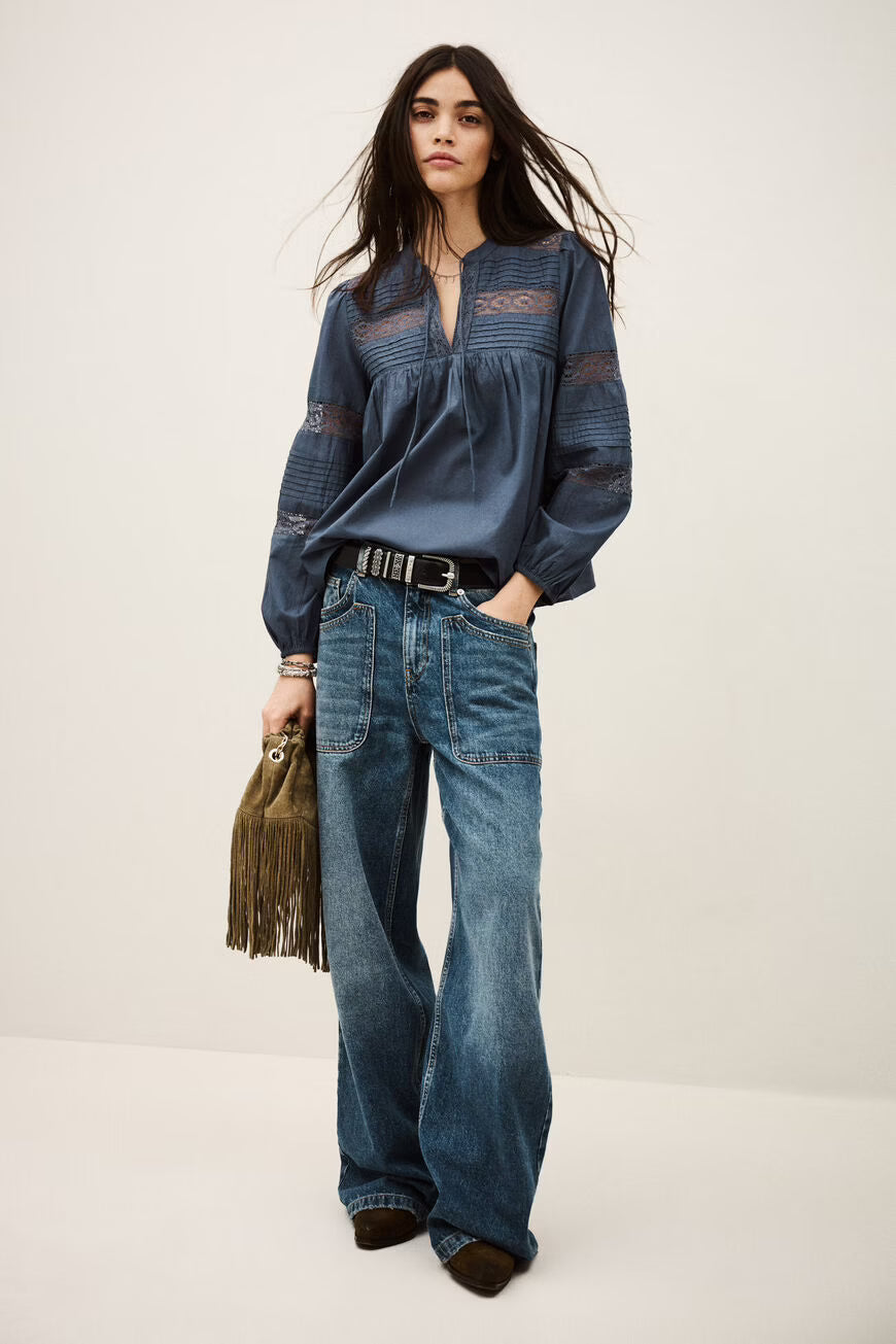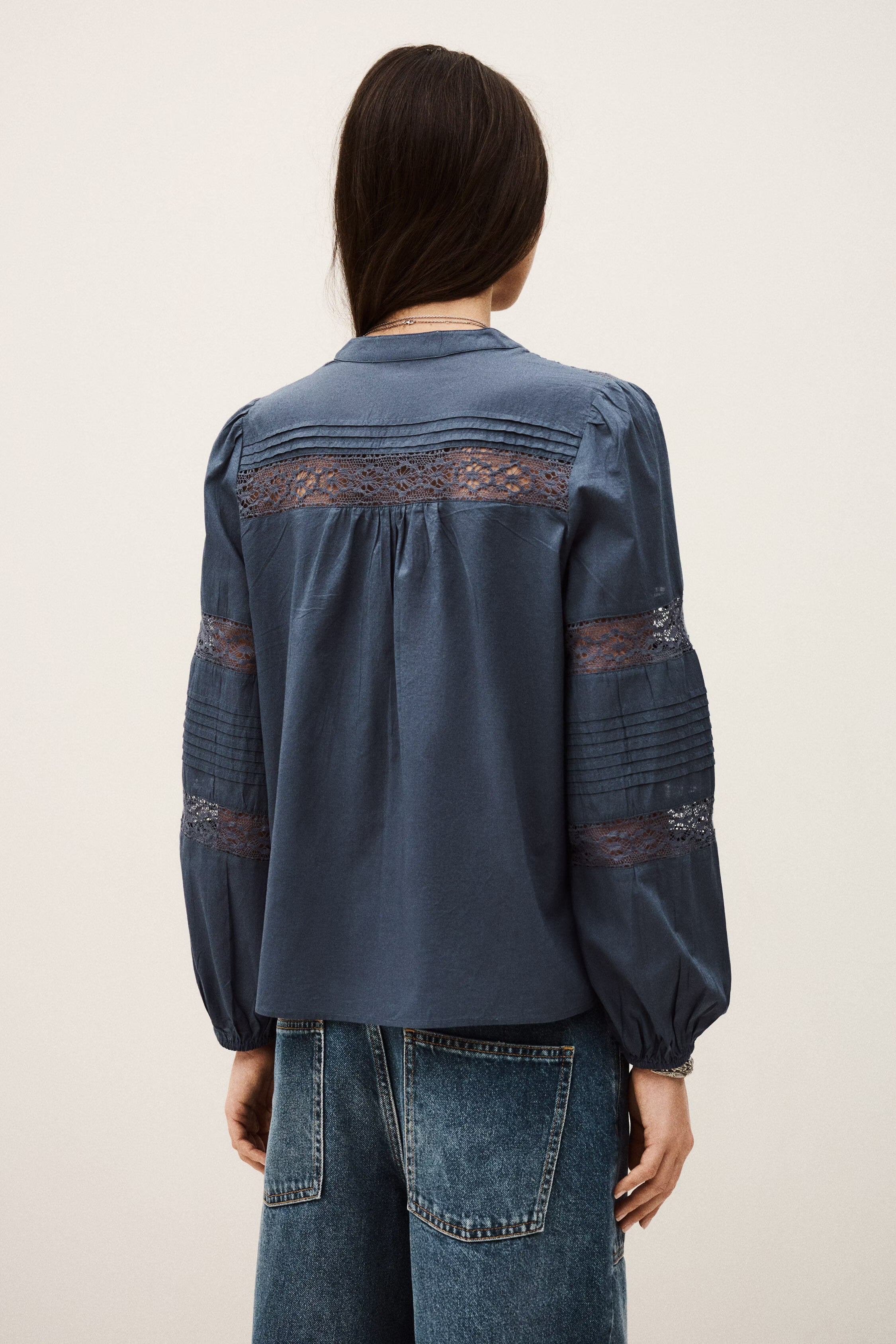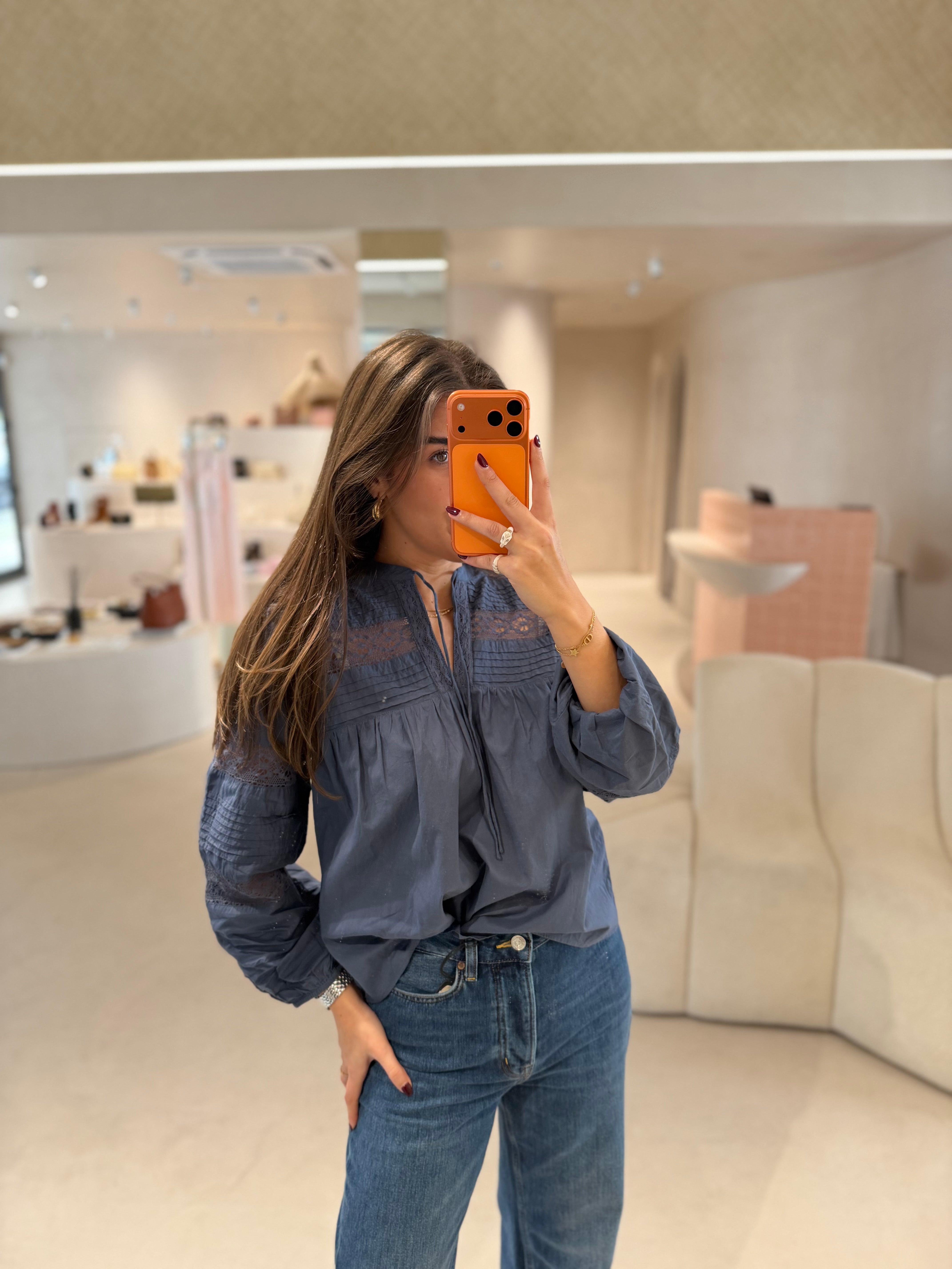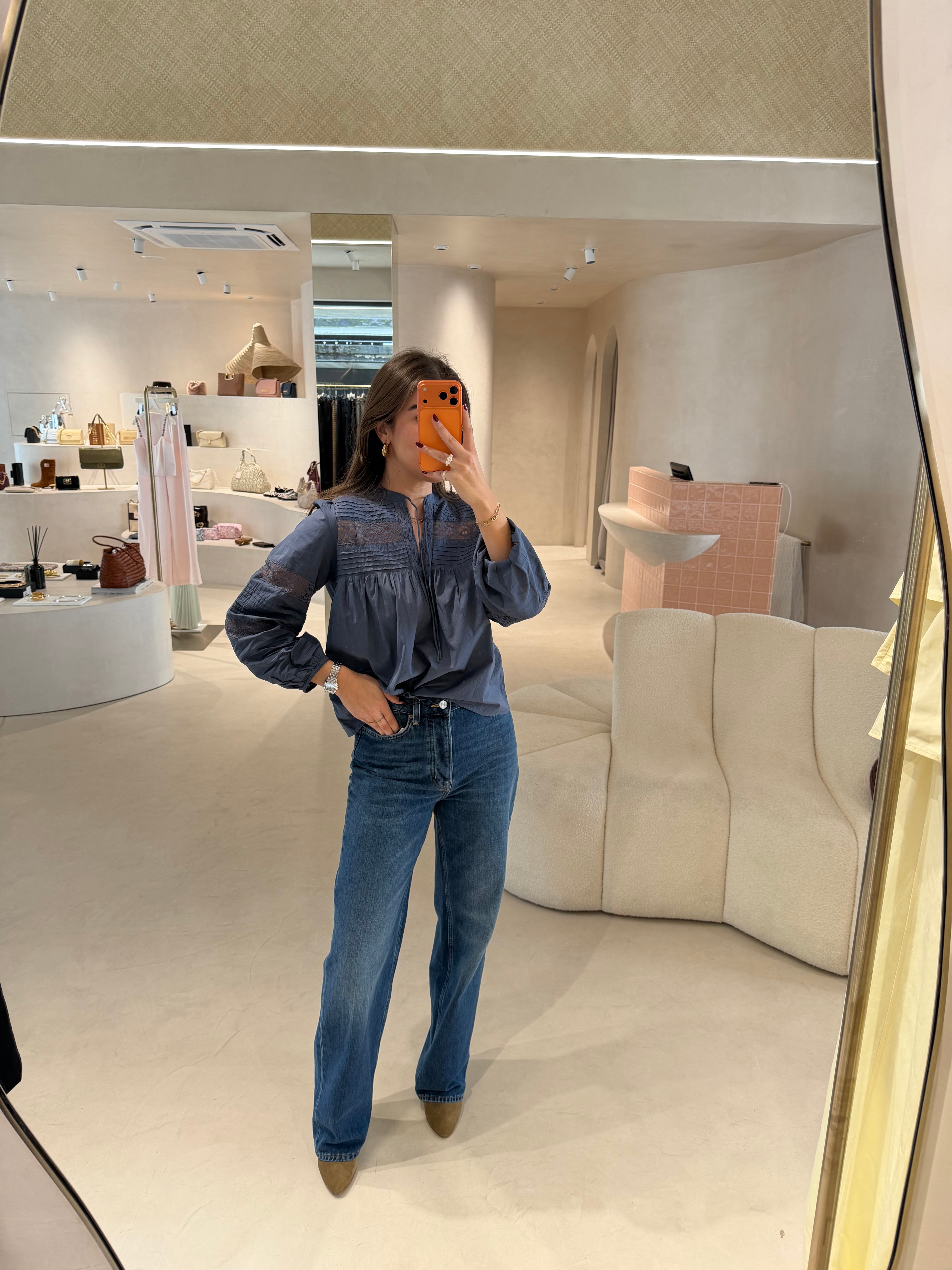 A Blouse Nami Bleu da ba&sh é uma camisa leve em 100% algodão orgânico, ideal para looks femininos com um toque natural e sofisticado. A sua silhueta fluida em azul clássico confere versatilidade para coordenar com jeans, saias ou calças de alfaiataria, criando outfits desde o casual chic até ao smart casual.