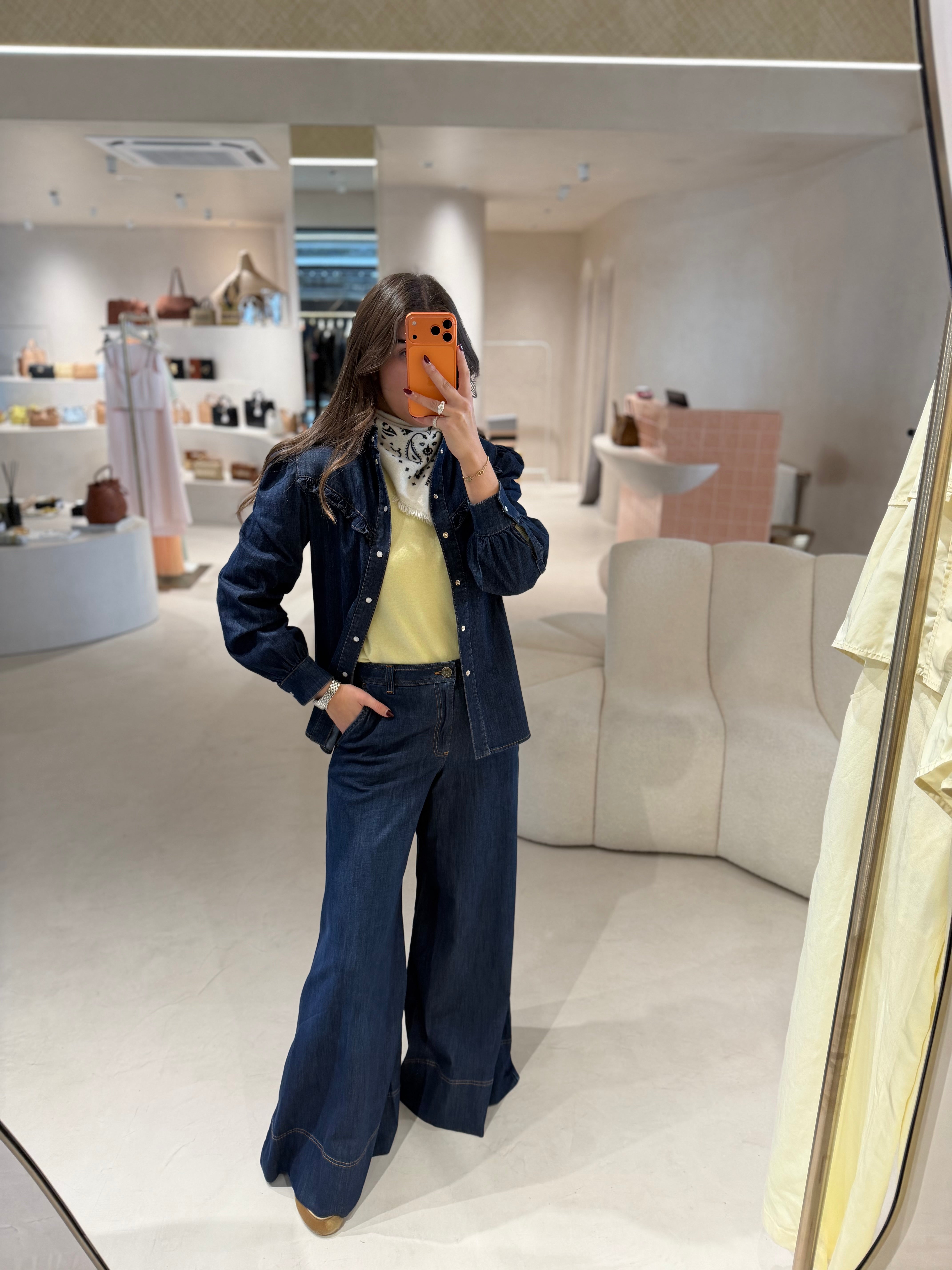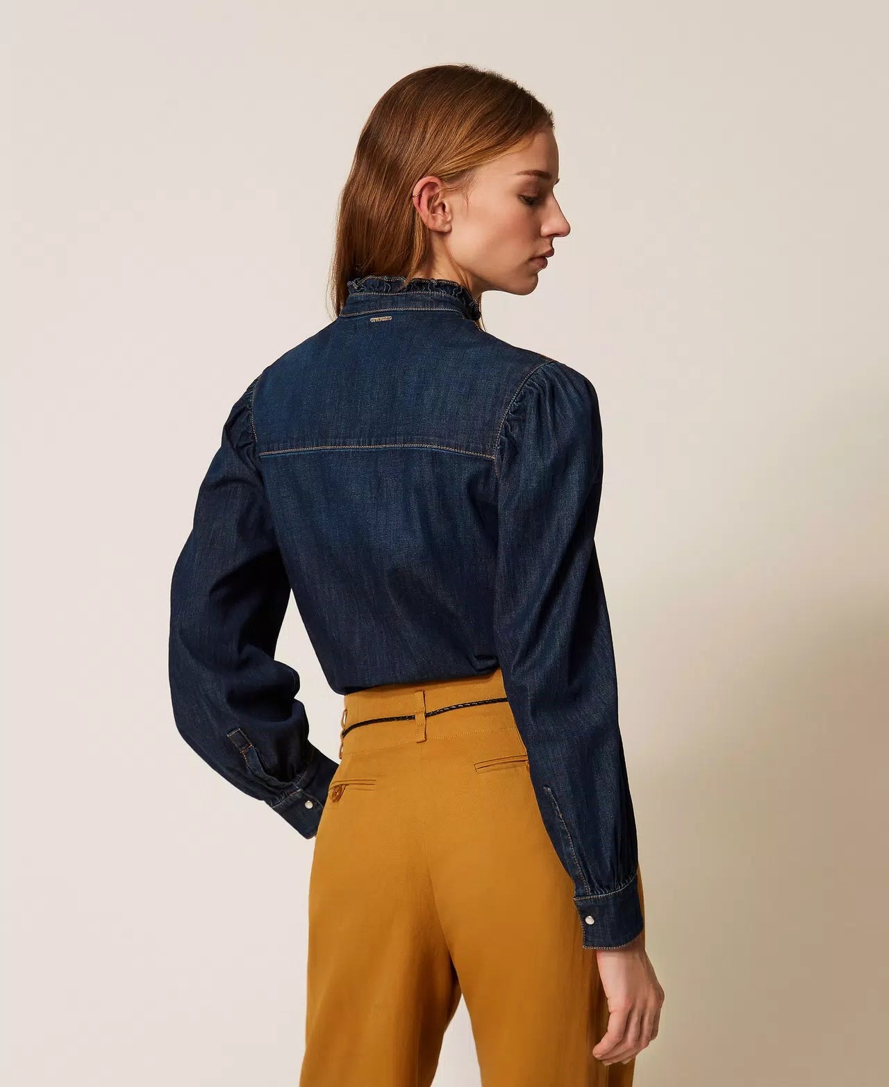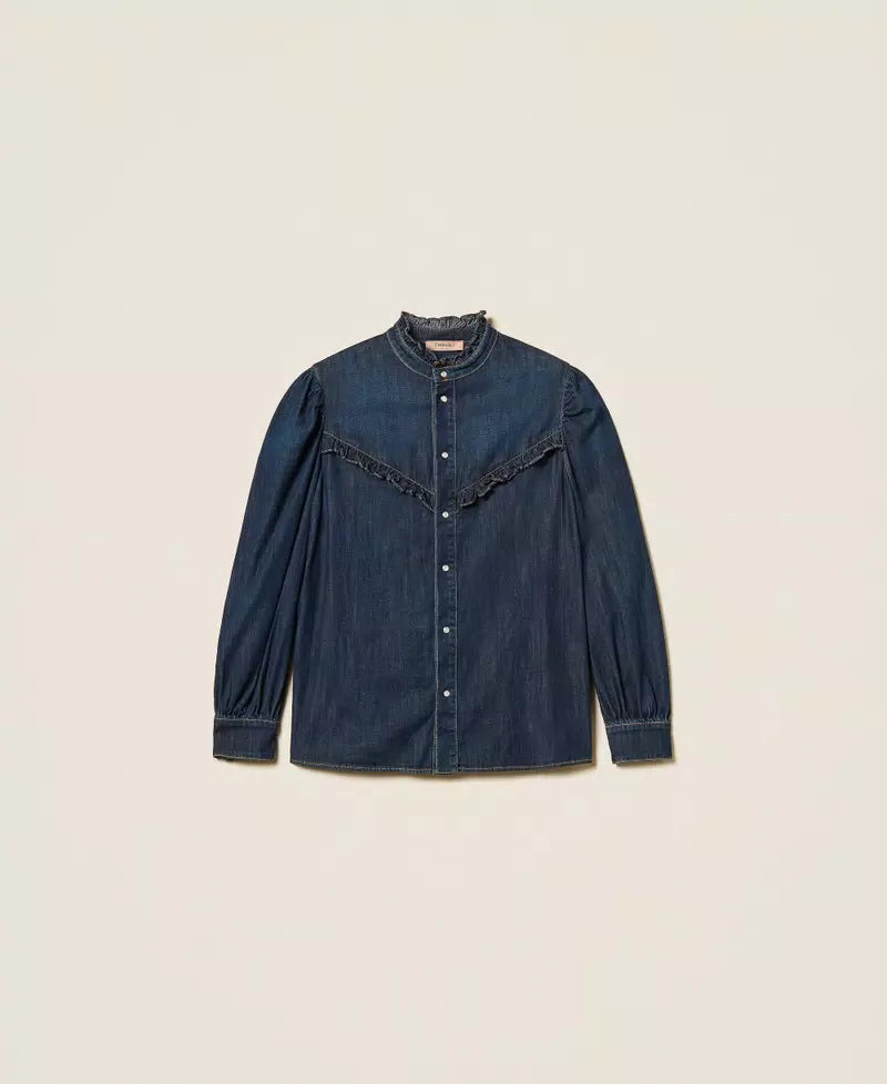 Eleve o seu estilo casual com a Denim Shirt da TWINSET. Confeccionada em denim stretch de alta qualidade, esta camisa feminina apresenta folhos delicados nos ombros e frontal, gola mandarim e fecho com botões de pressão, combinando conforto e elegância. Ideal para looks do dia a dia ou ocasiões informais, pode ser usada com calças, saias ou sobre vestidos.