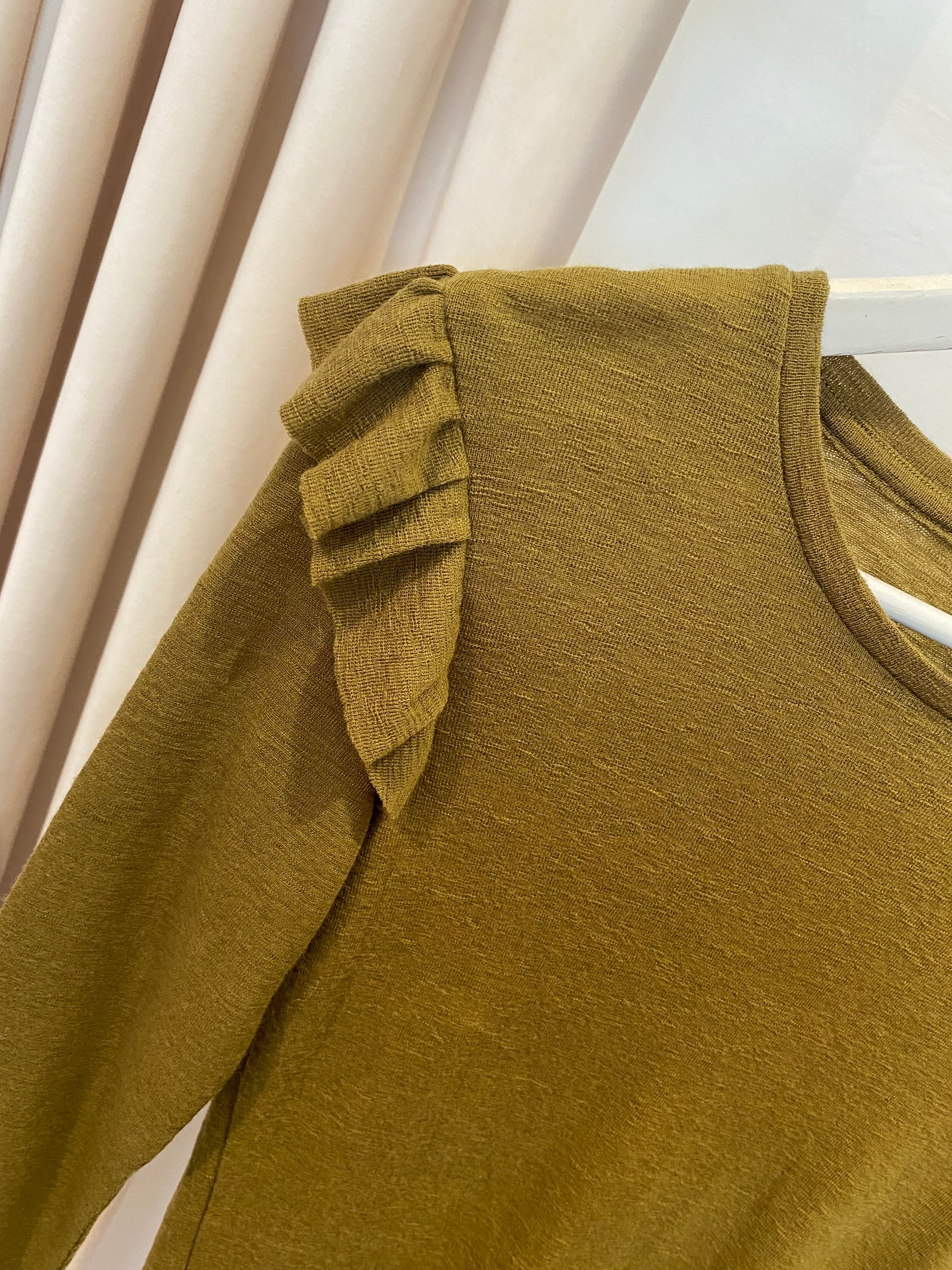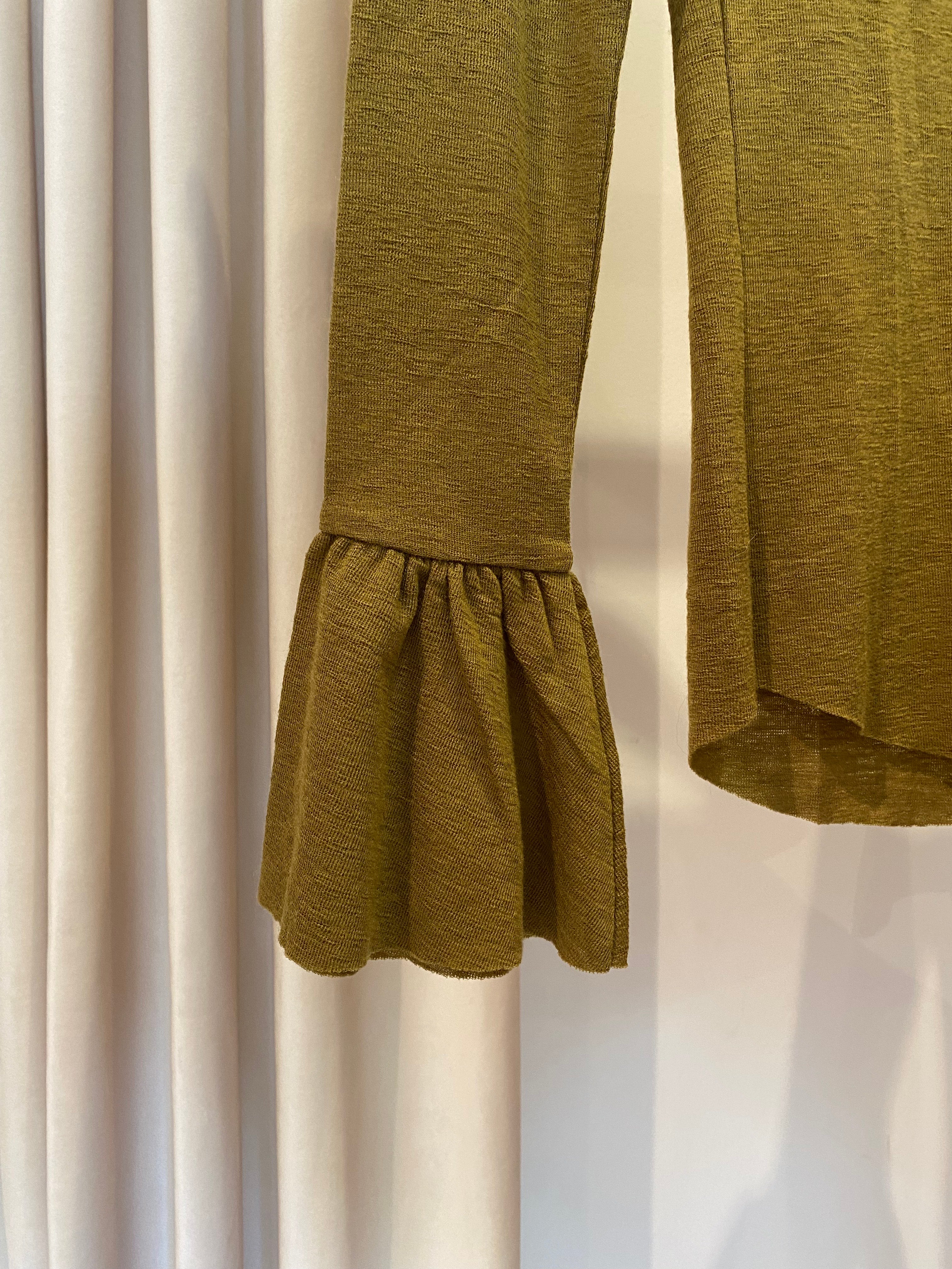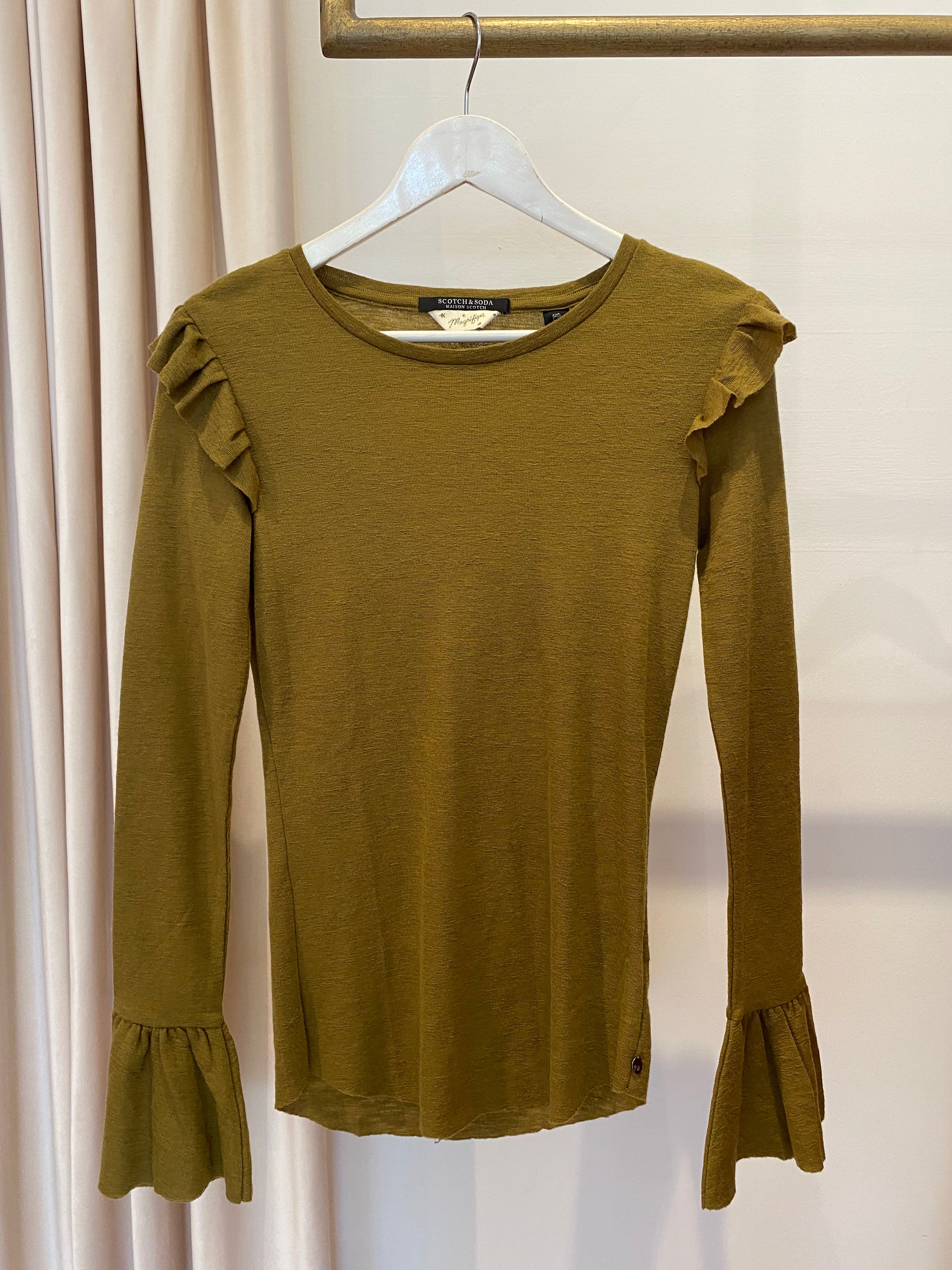 Camisola de lã Scotch&soda verde com folhos nos ombros e nos punhos.