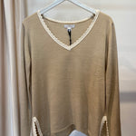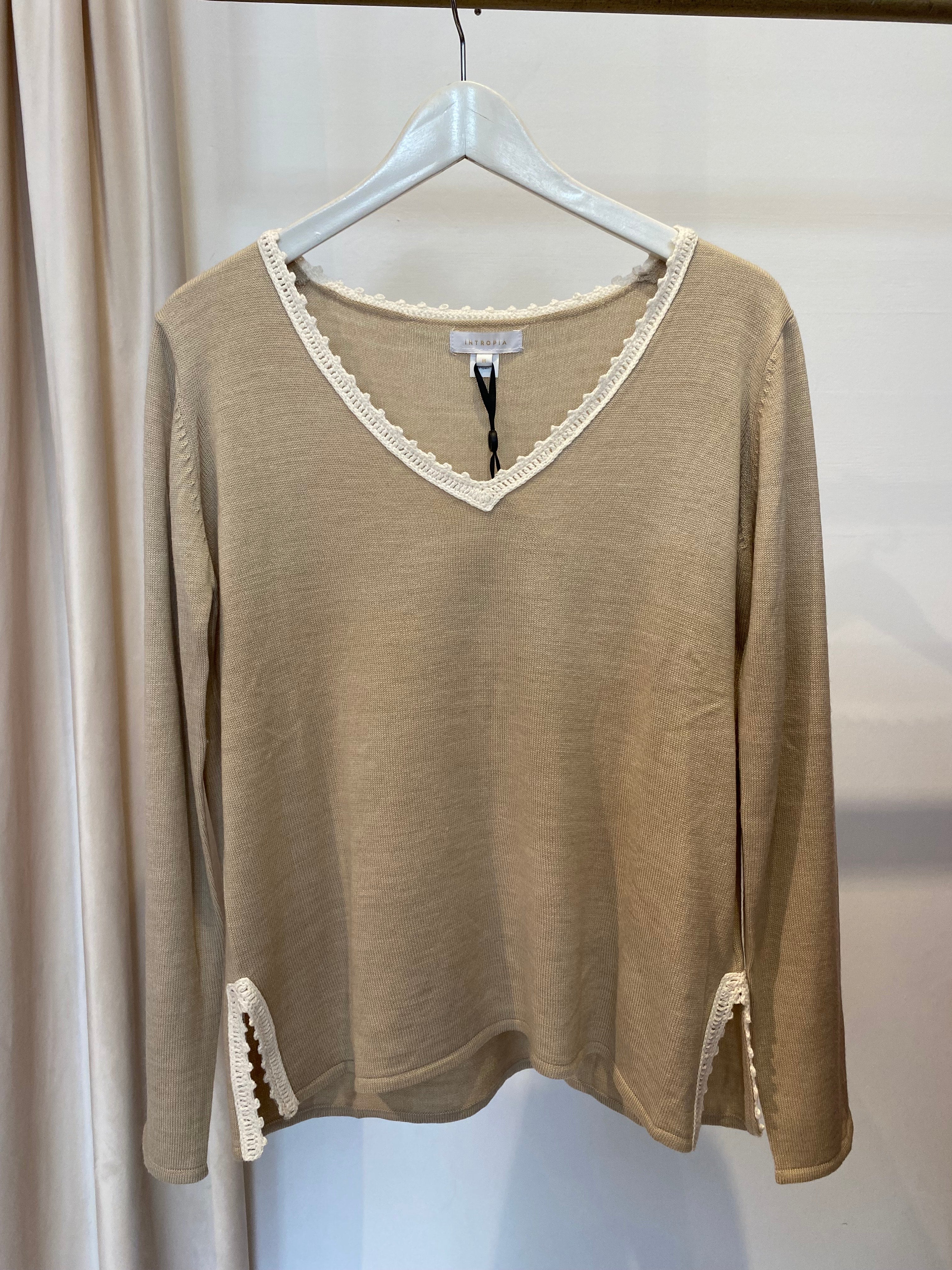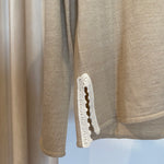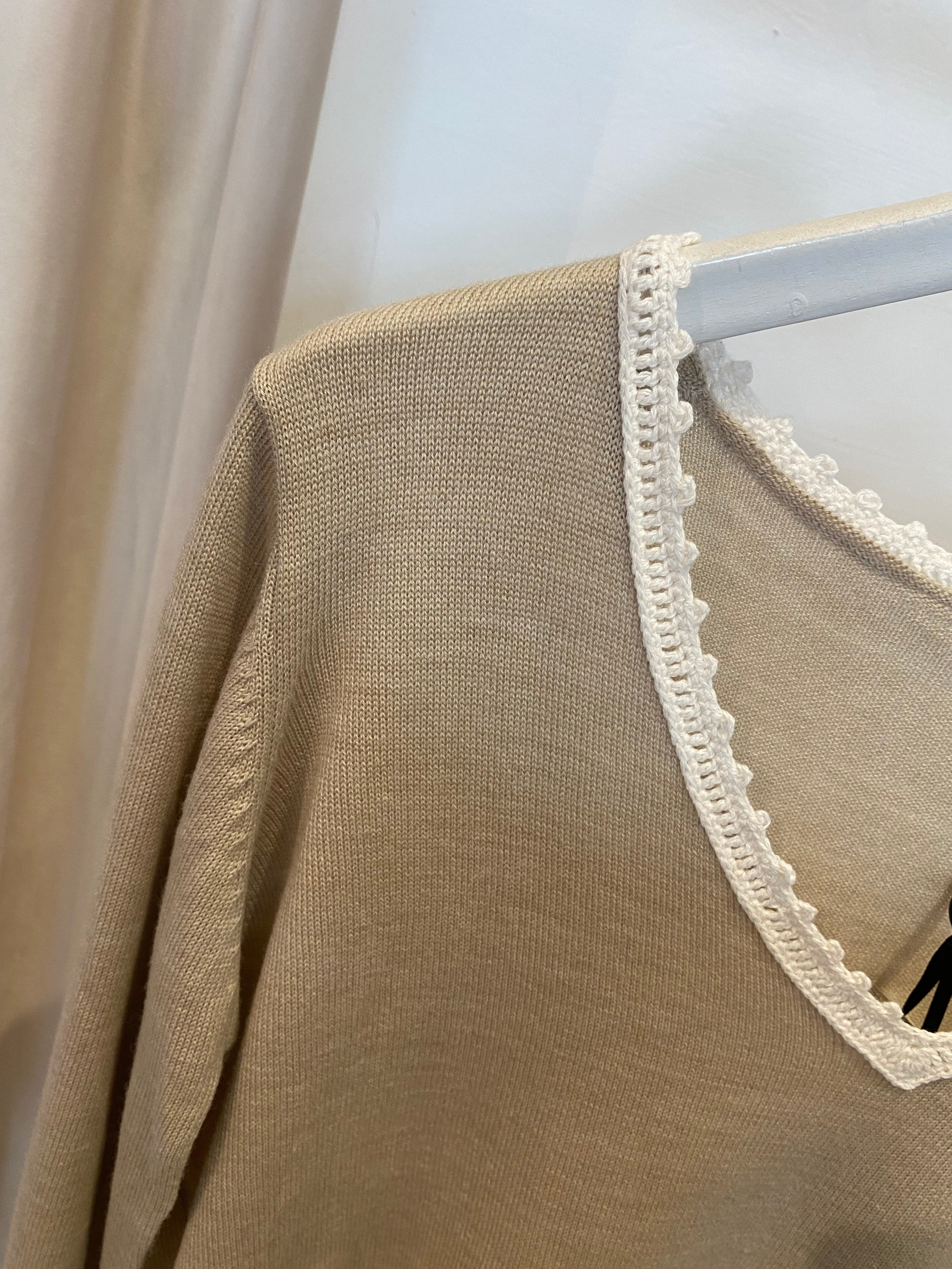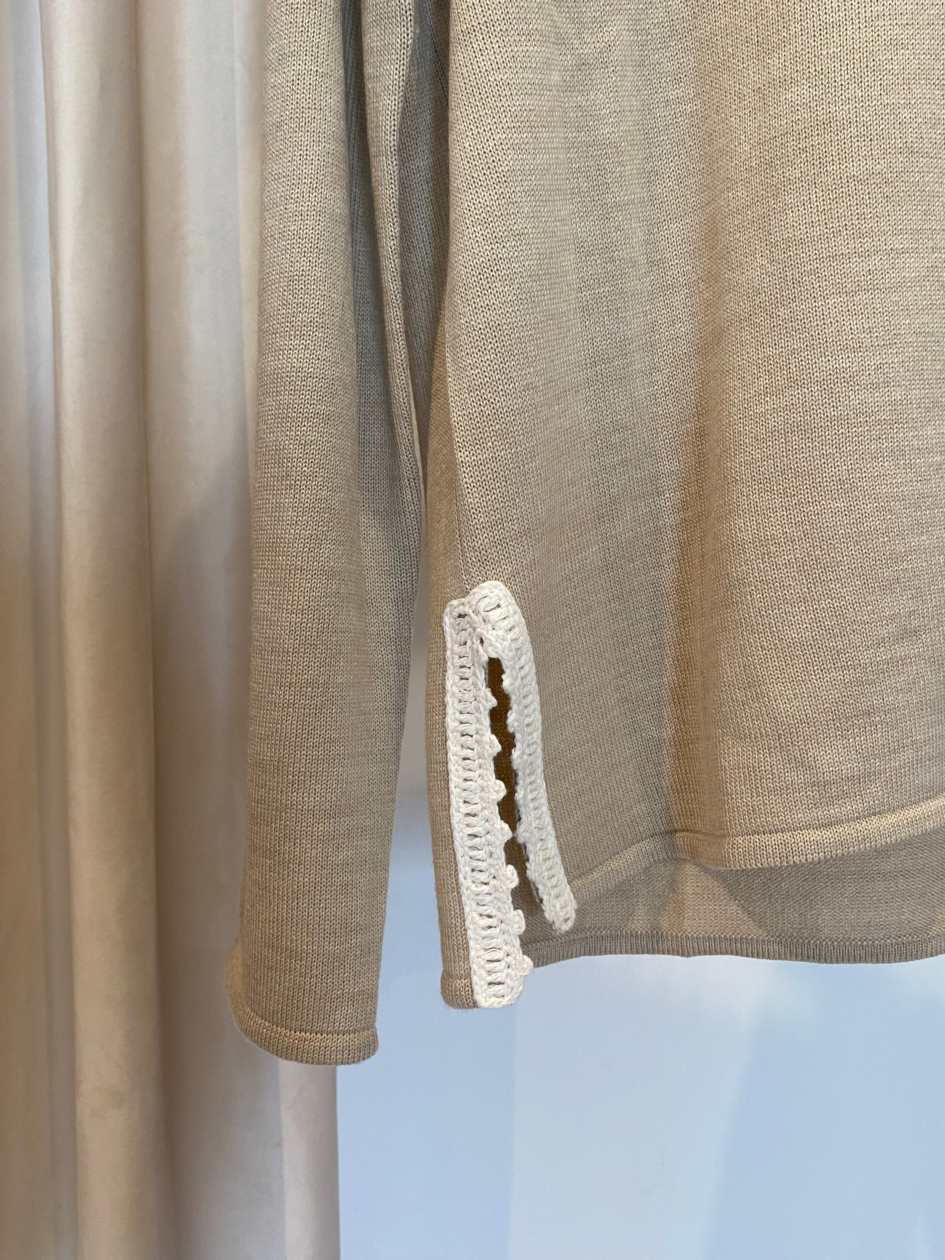 Camisola em lã merino bege, gola em croché e aberturas laterais com detalhe em croché.