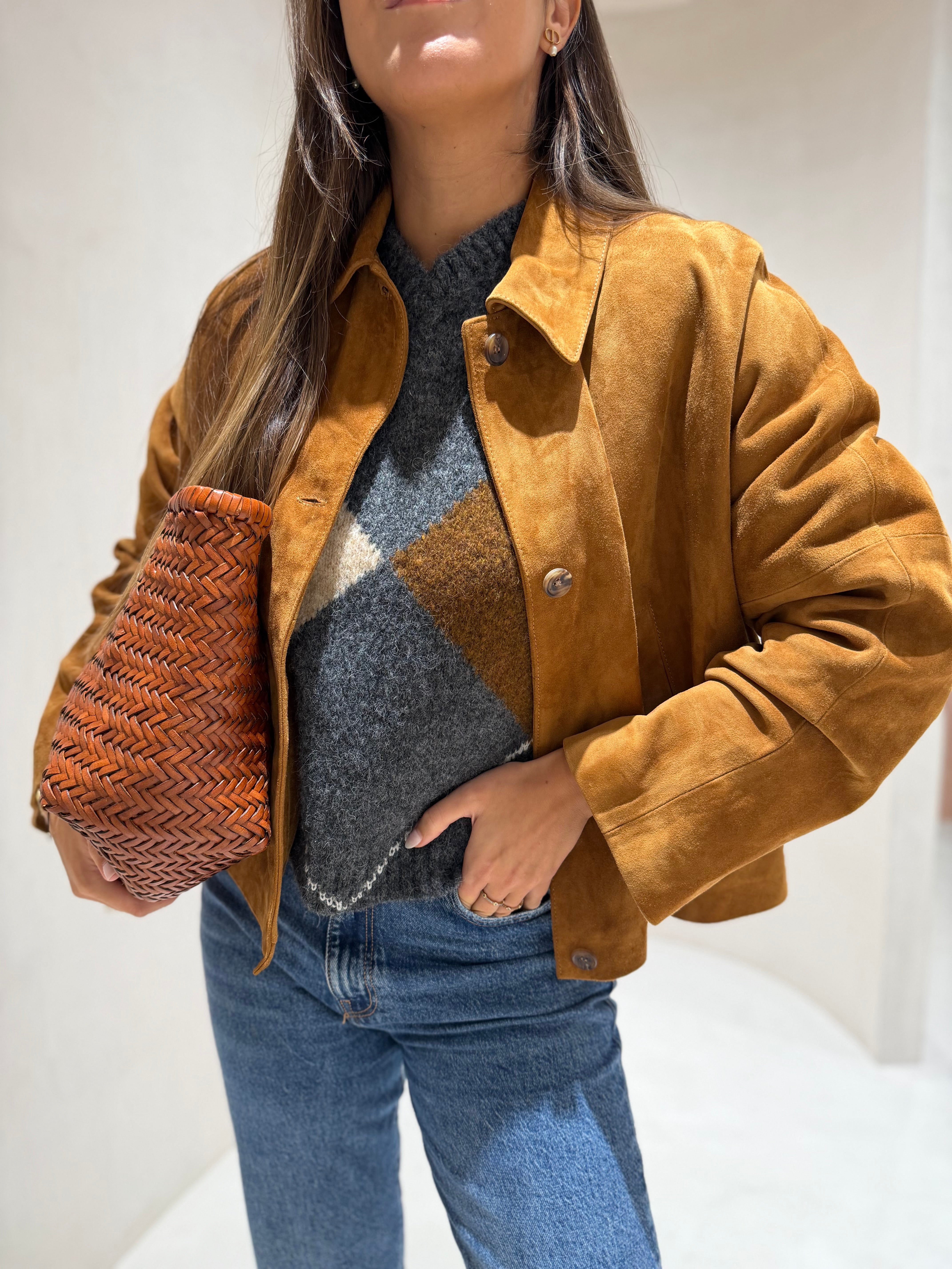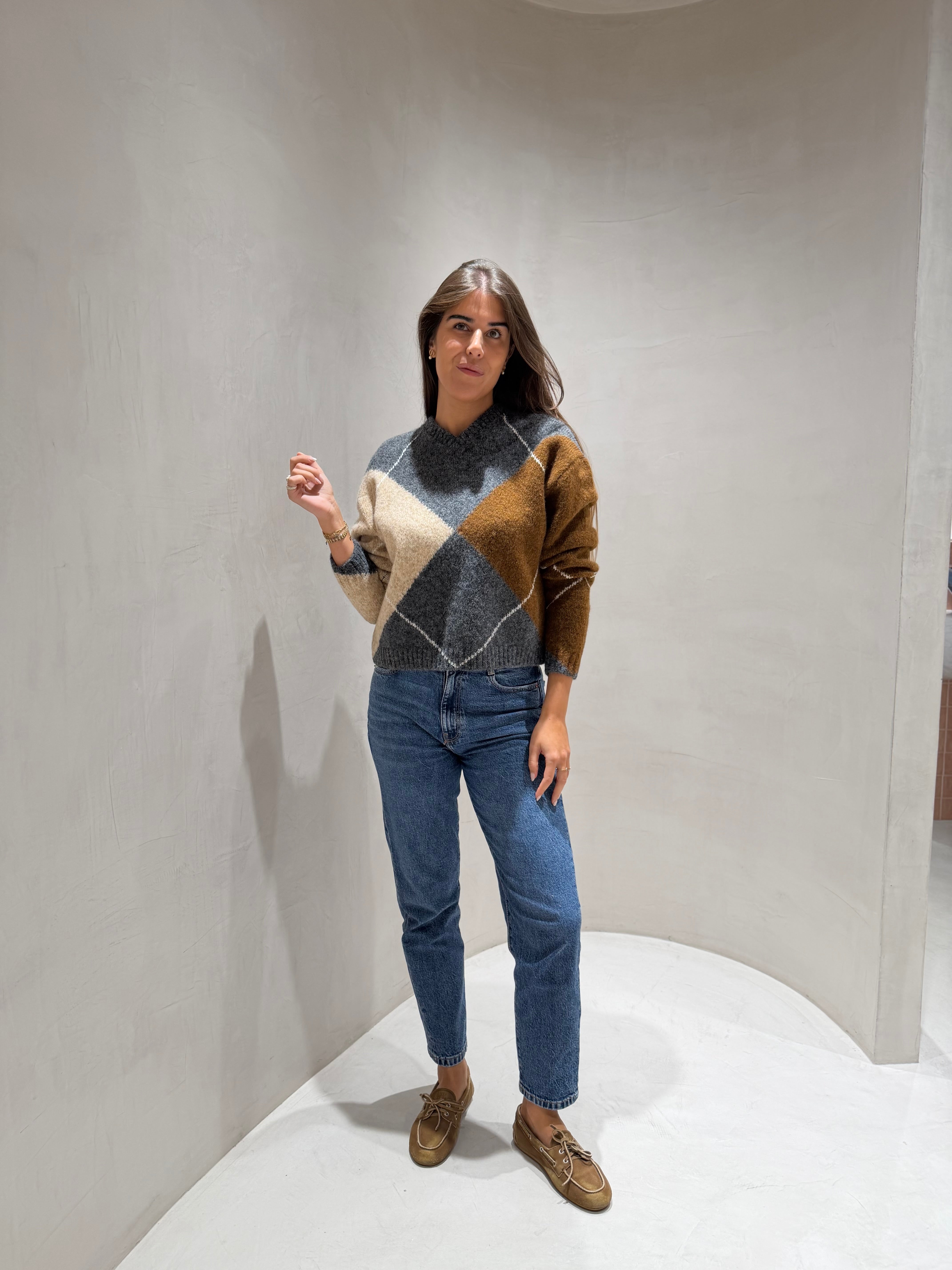 A camisola Gaston da Semicouture é uma peça statement que alia conforto e estilo. Confeccionada numa mistura de alpaca, lã, poliamida e poliéster, apresenta um corte oversized com padrão diamante, decote em V e mangas longas. O comprimento à anca e a fluidez do tecido conferem-lhe um ar sofisticado e moderno, tornando-a ideal para looks casuais ou coordenados mais sofisticados. Fabricada em Itália, é uma escolha elegante e versátil para o dia a dia.