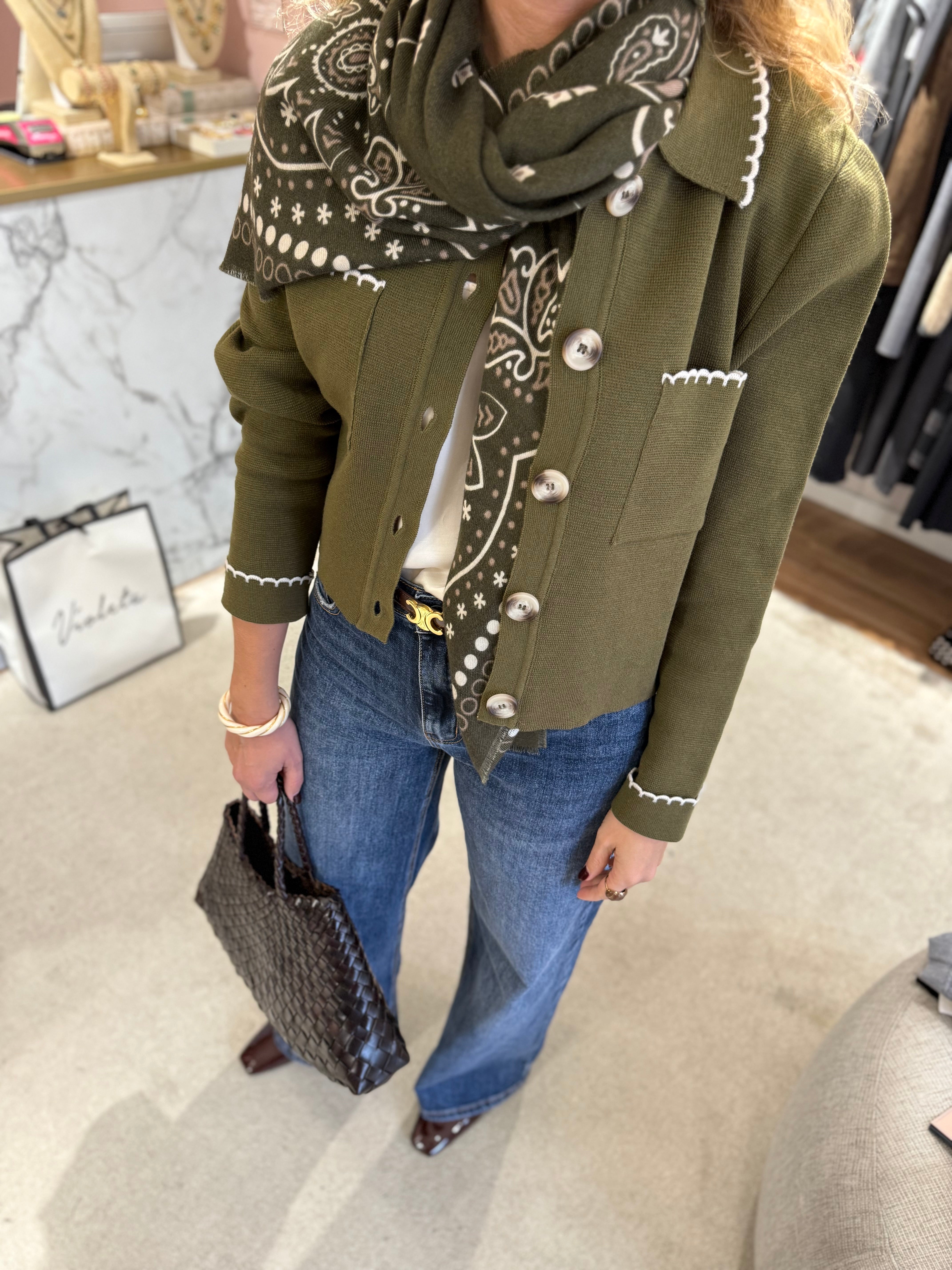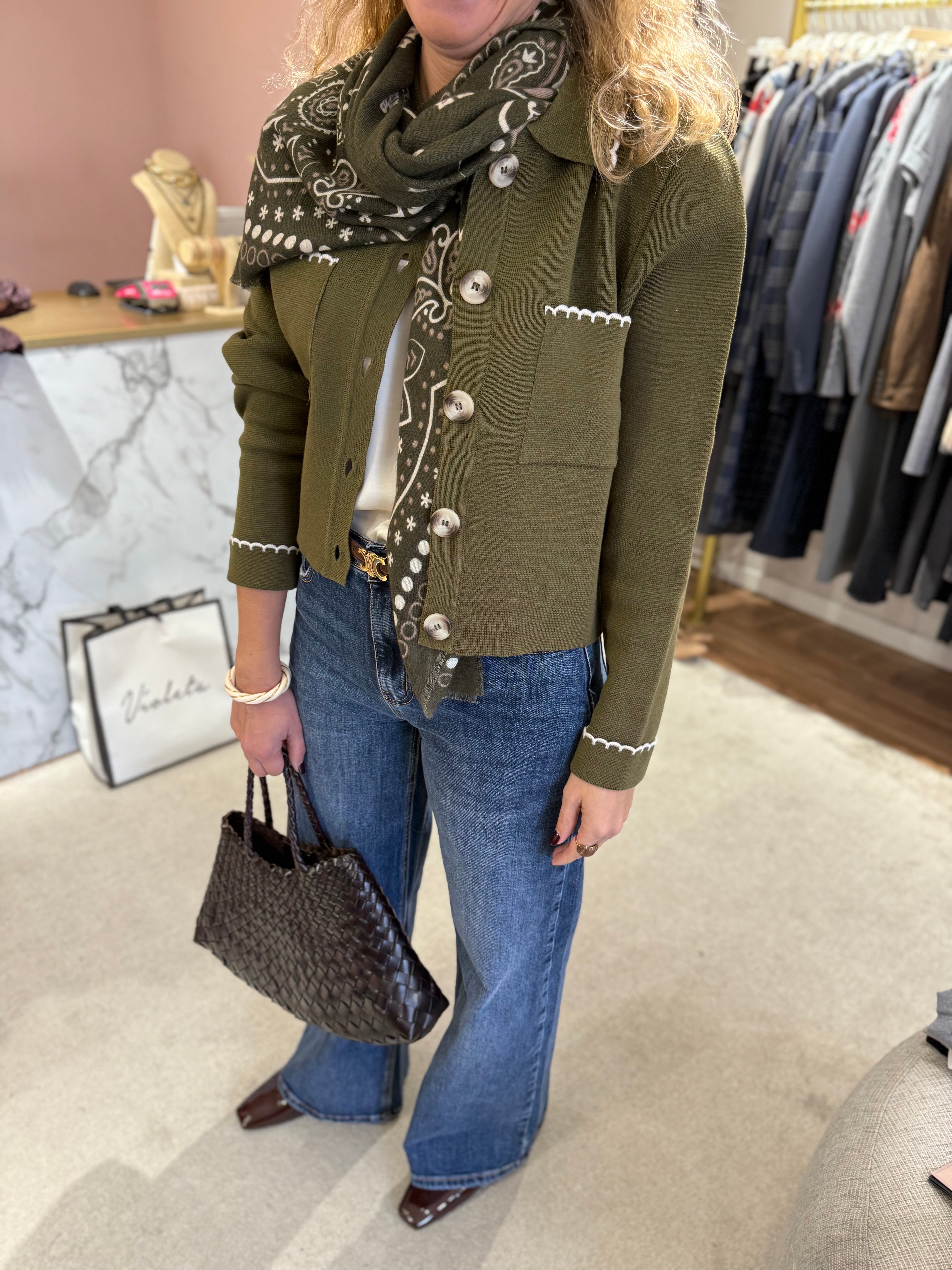 Cardigan em malha fina de corte ajustado, o casaco Valina aposta num tom verde militar moderno e fácil de coordenar. Com botões, gola em V e acabamento refinado, é perfeito para sobrepor ou usar como top.