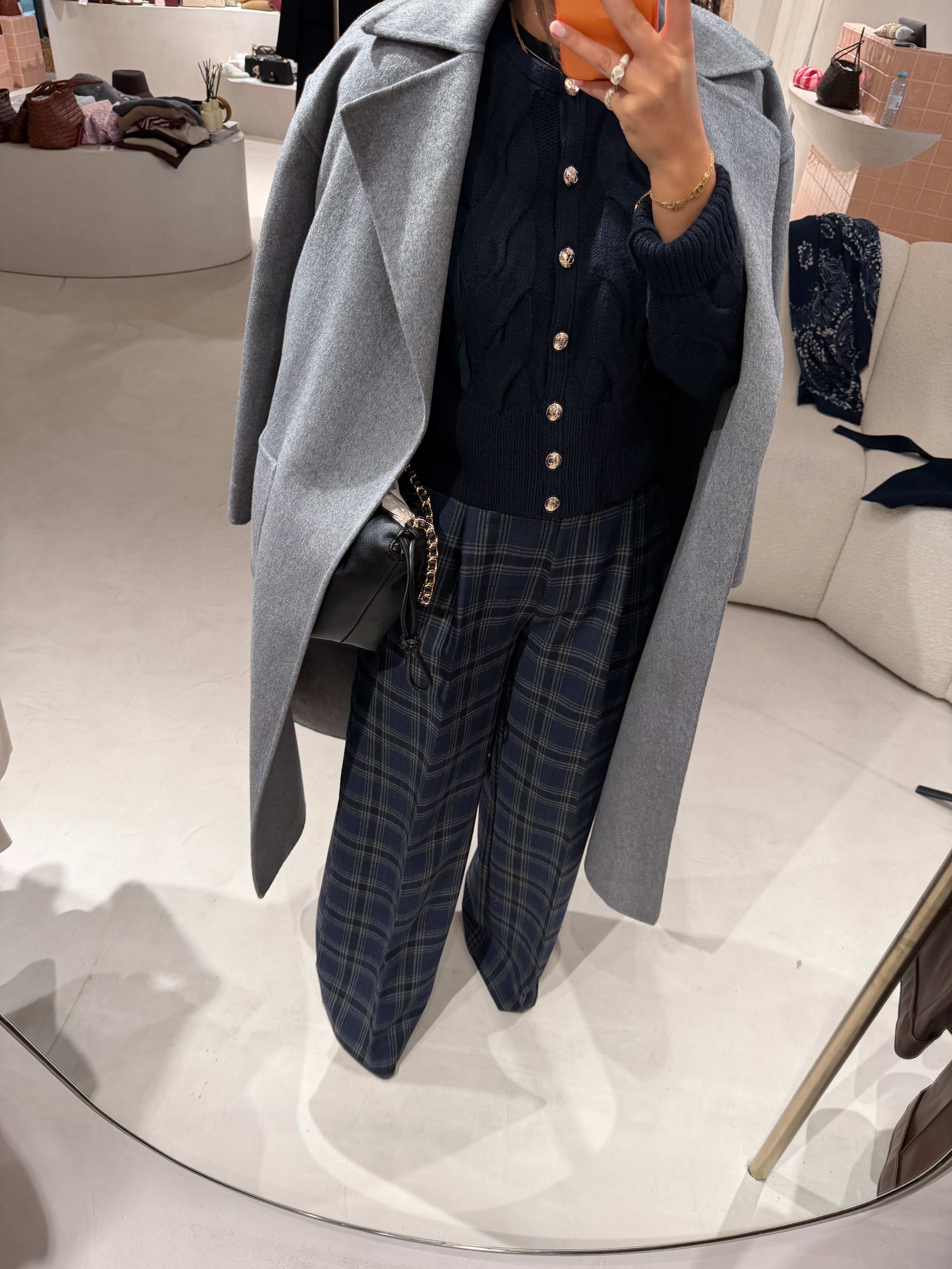 Cardigan azul “sea blue” em mistura, com padrão trançado (cable stitch), decote redondo, mangas compridas e acabamento canelado. Fecho frontal com botões dourados de logo, que adicionam elegância ao design.