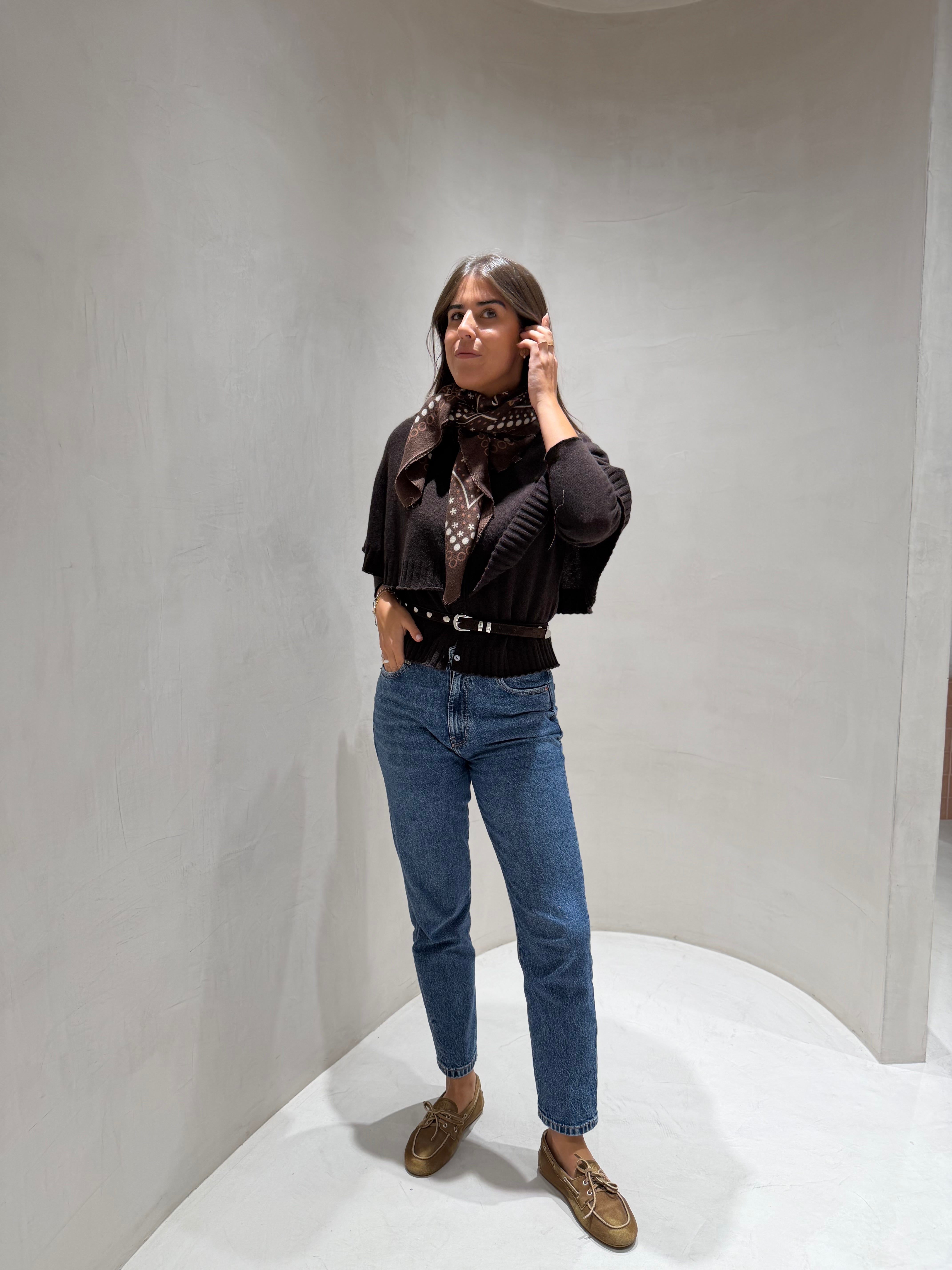O cardigan SVEVA eleva o guarda-roupa com uma elegância discreta e um design conceptual. Em tom “Pumice” (um cinza claro luminoso), esta peça incorpora uma sobrecamada em formato de capa sobre a parte superior, mangas longas com design em camadas e acabamentos em canelado nos punhos e bainha — detalhes que garantem movimento e presença. Afeita ao rigor artesanal, é confeccionada em 70% lã fleece + 30% caxemira, e fabricada na Itália, conferindo-lhe qualidade premium.