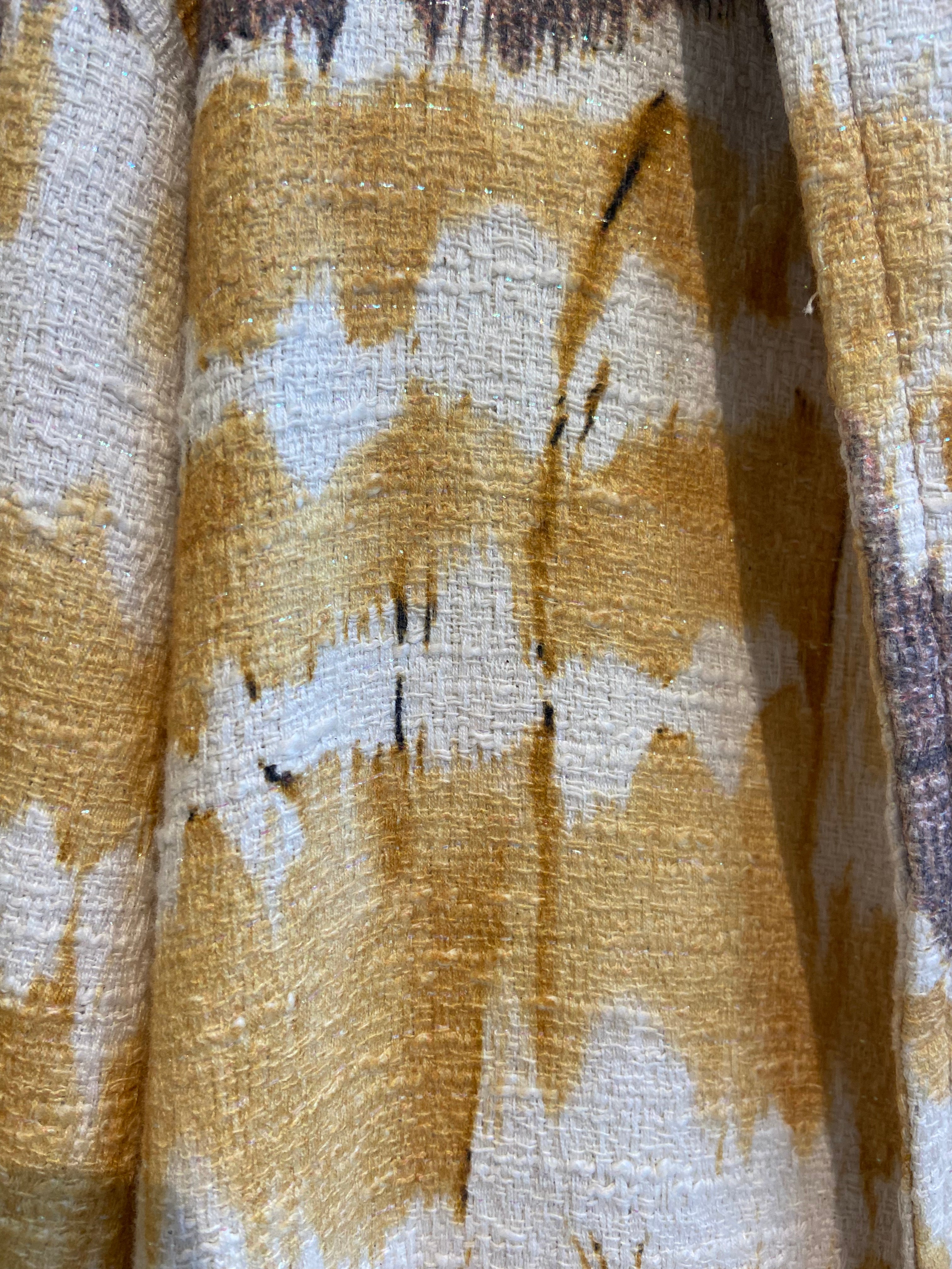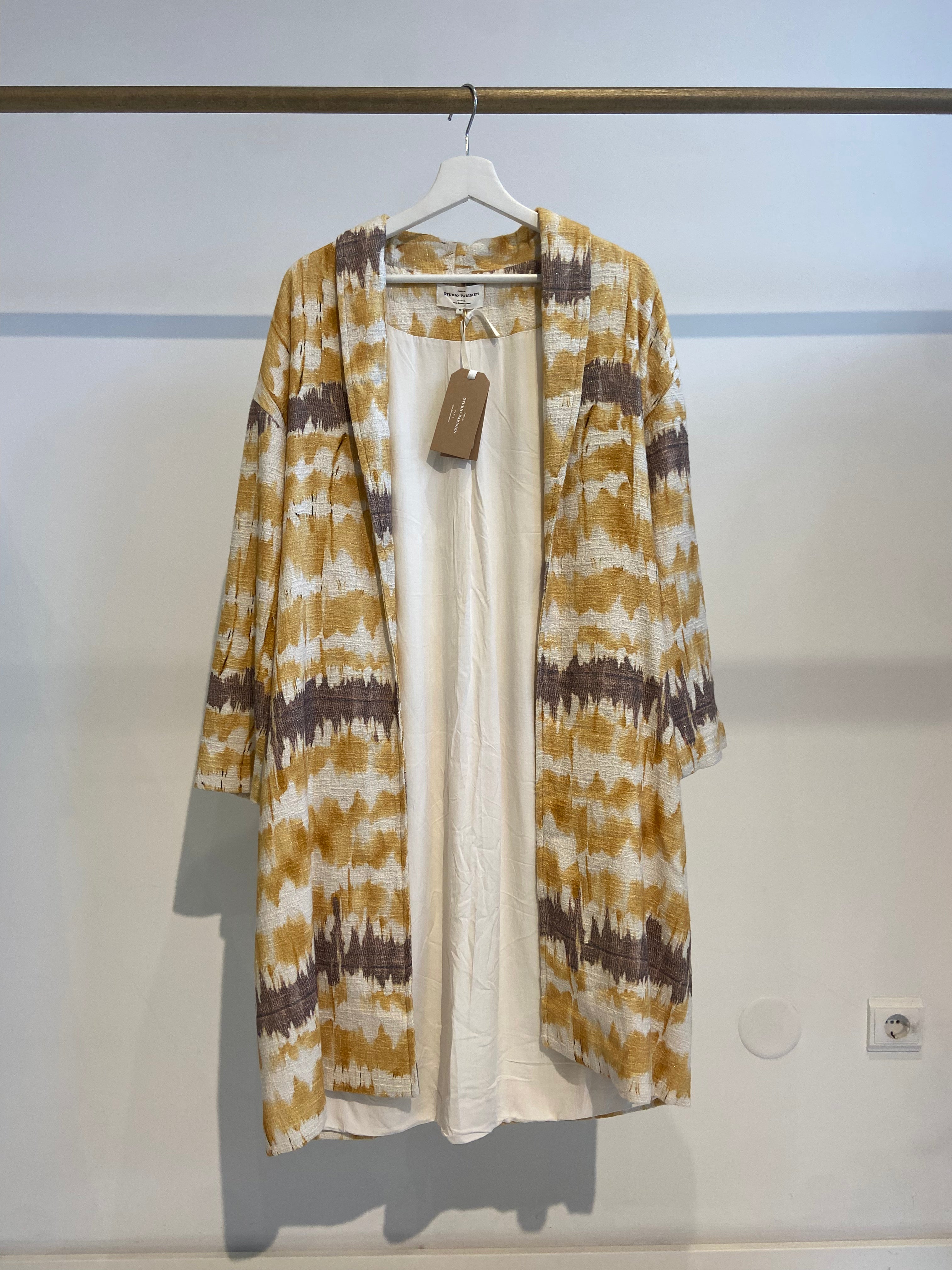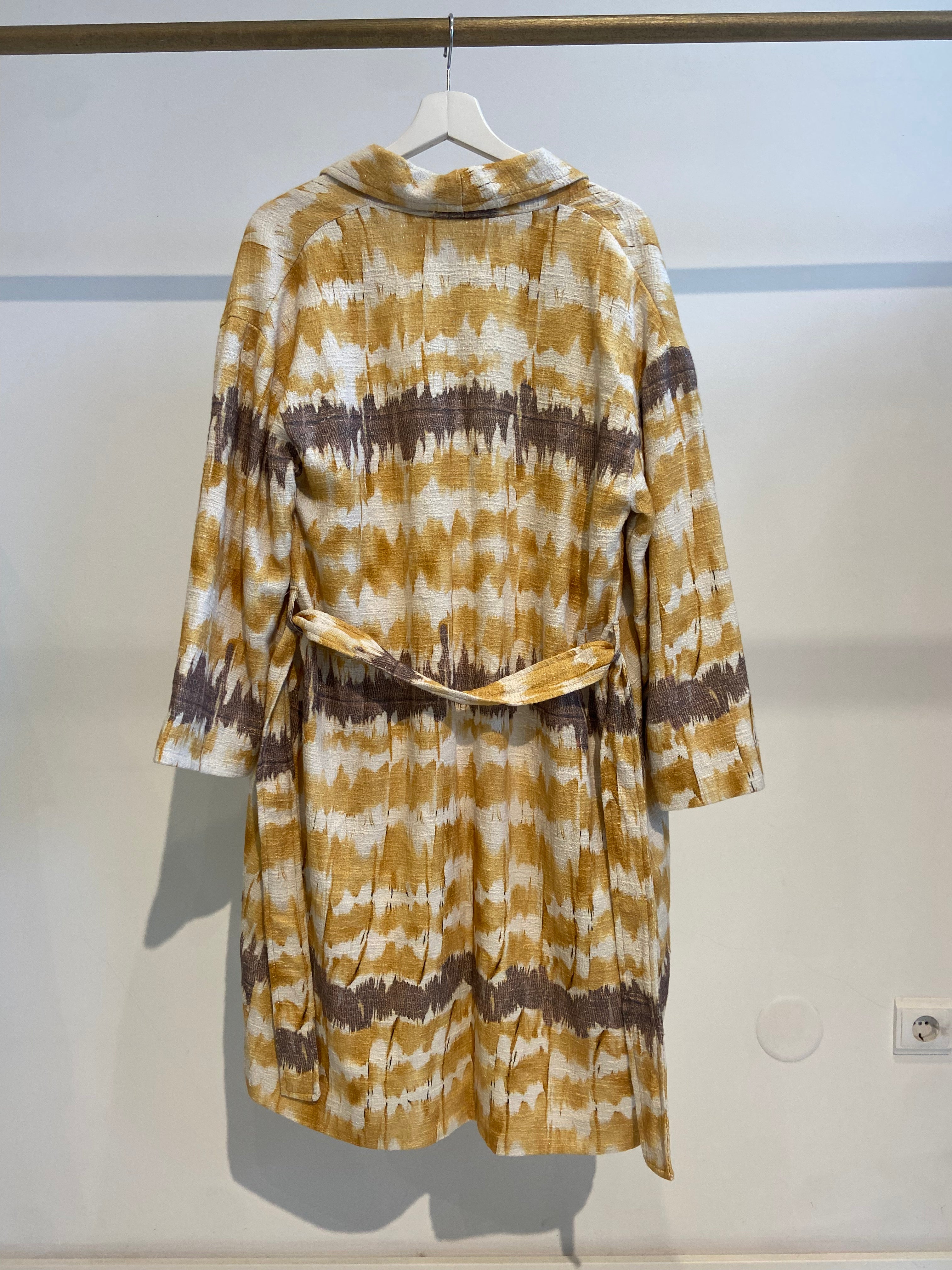 Casaco comprido com padrão, com cinto amovível e presilhas para cinto.