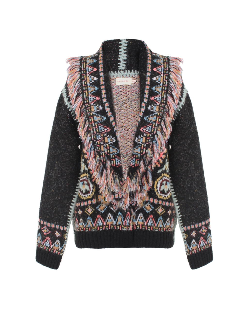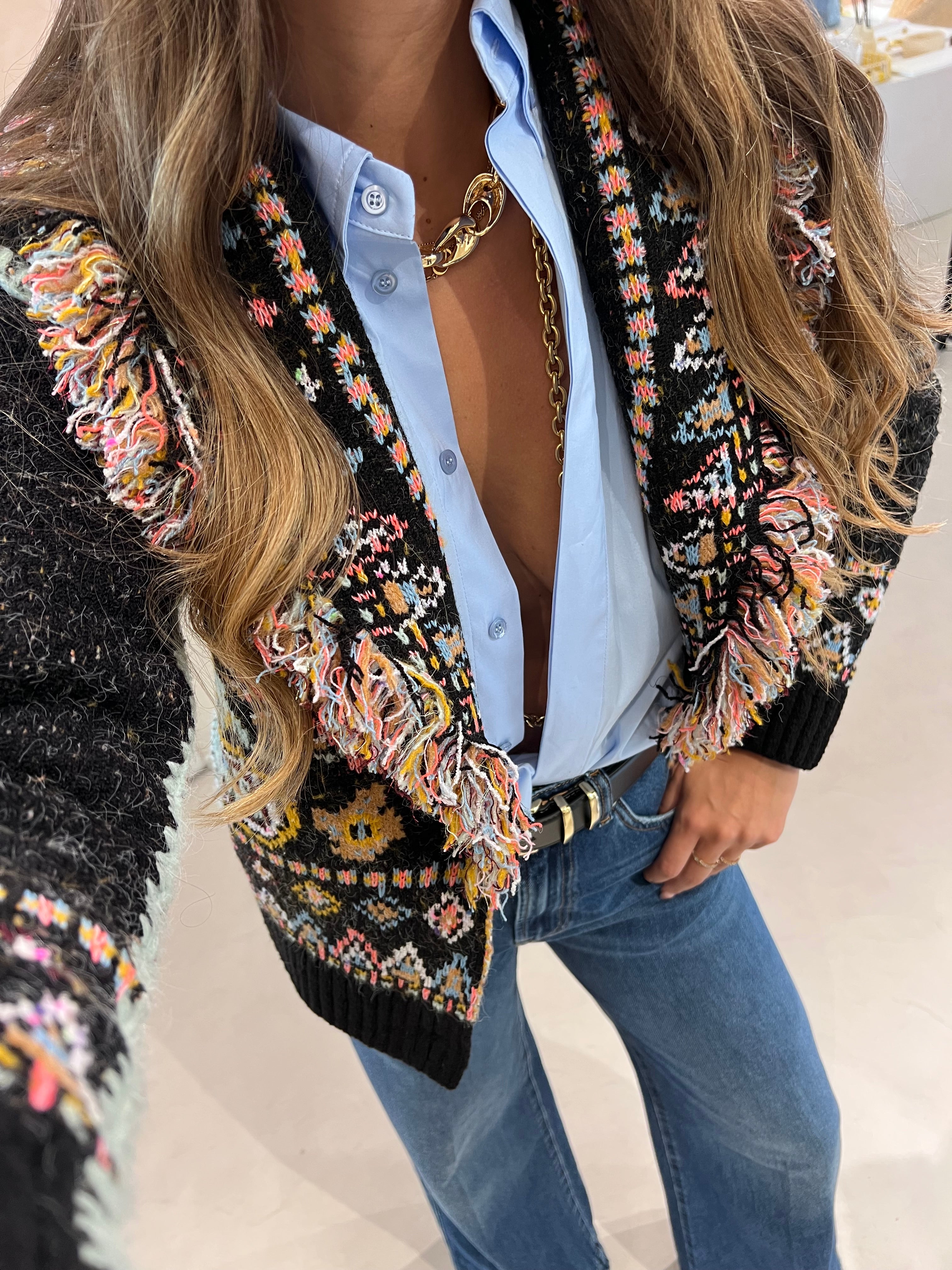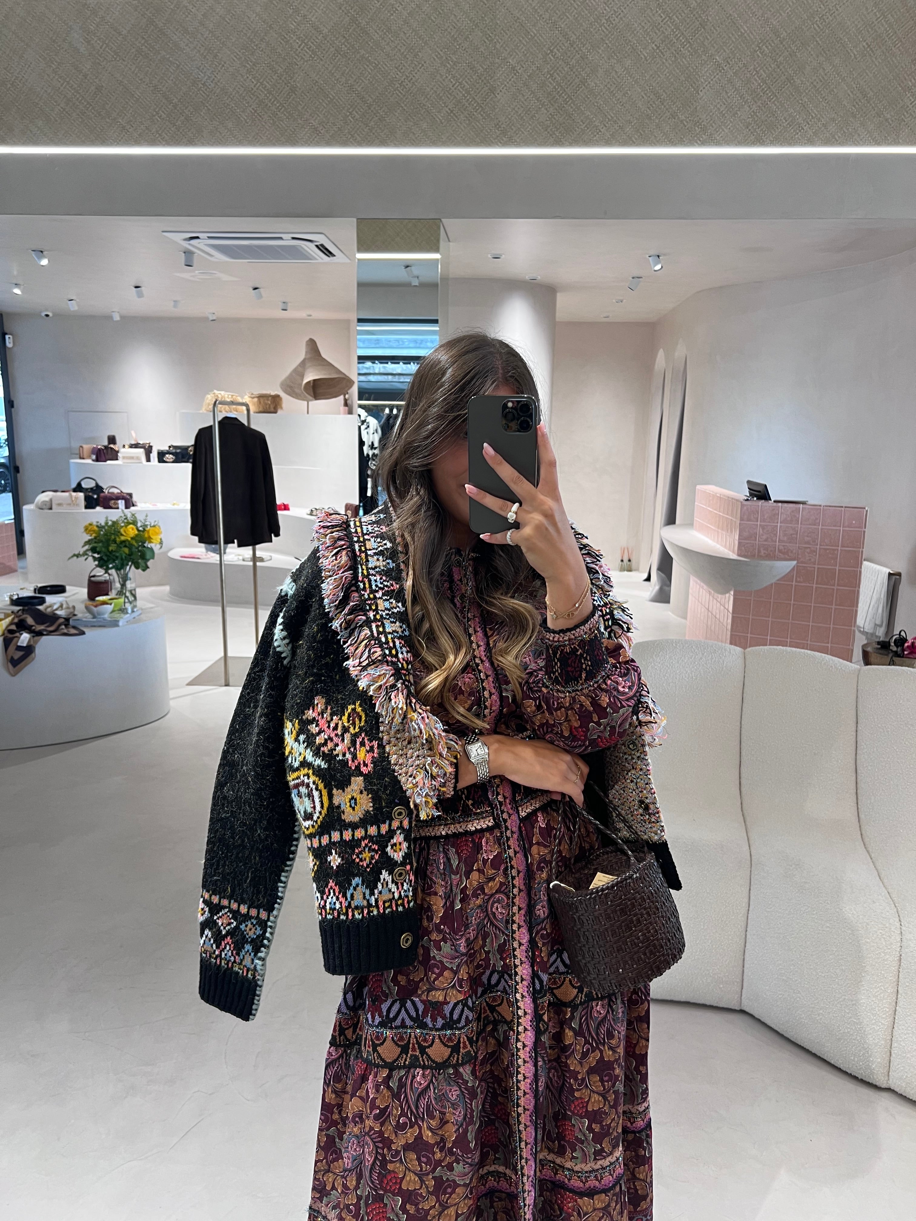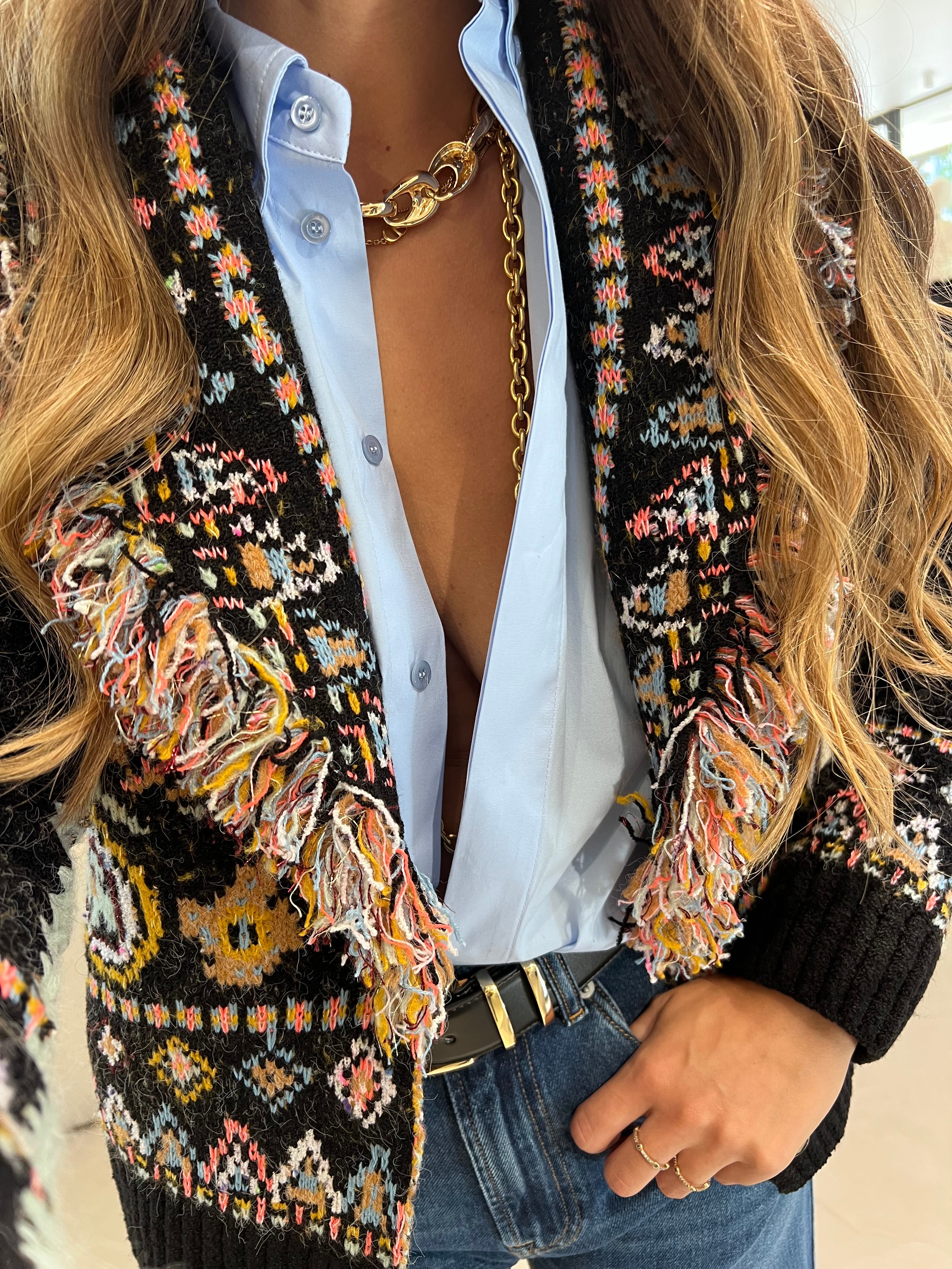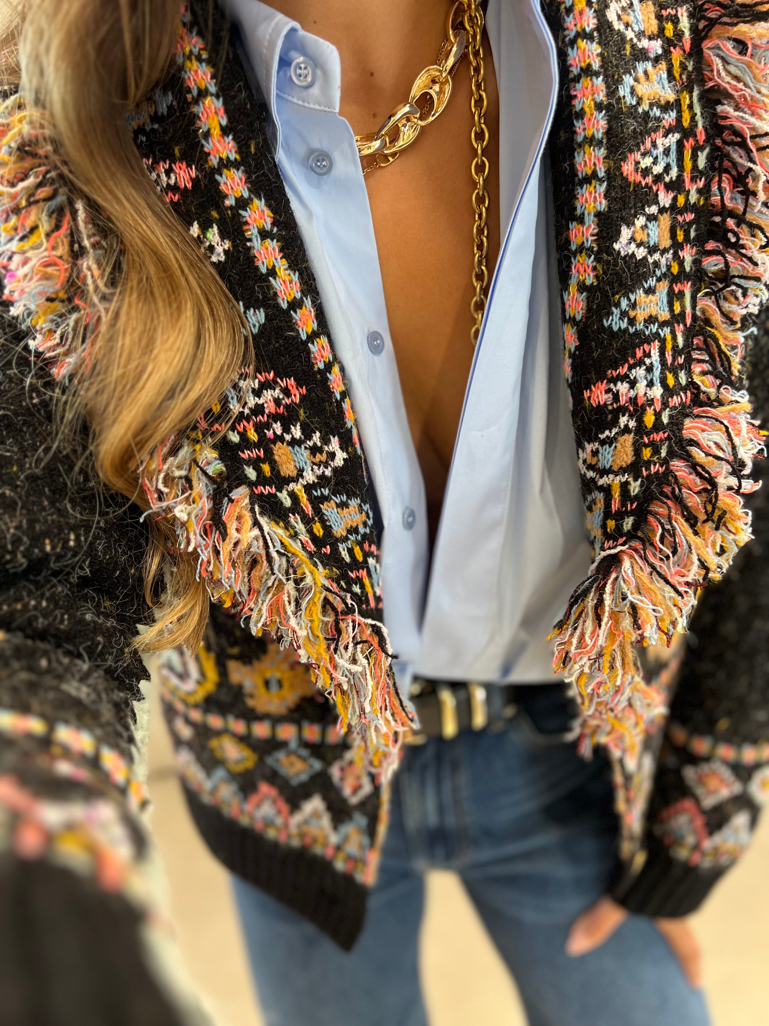 Descobre o requinte do Casaco Isadora da Cecília Prado — uma peça que equilibra sofisticação com conforto contemporâneo. Confeccionado numa combinação única de fios, este casaco distingue-se pela estampa exclusiva e pelos pespontos feitos à mão, que lhe conferem uma qualidade artesanal inconfundível. A gola ampla decorada com franjas adiciona um toque de charme irresistível, tornando-o perfeito para os dias mais frescos — ideal para looks de meia-estação cheios de estilo.