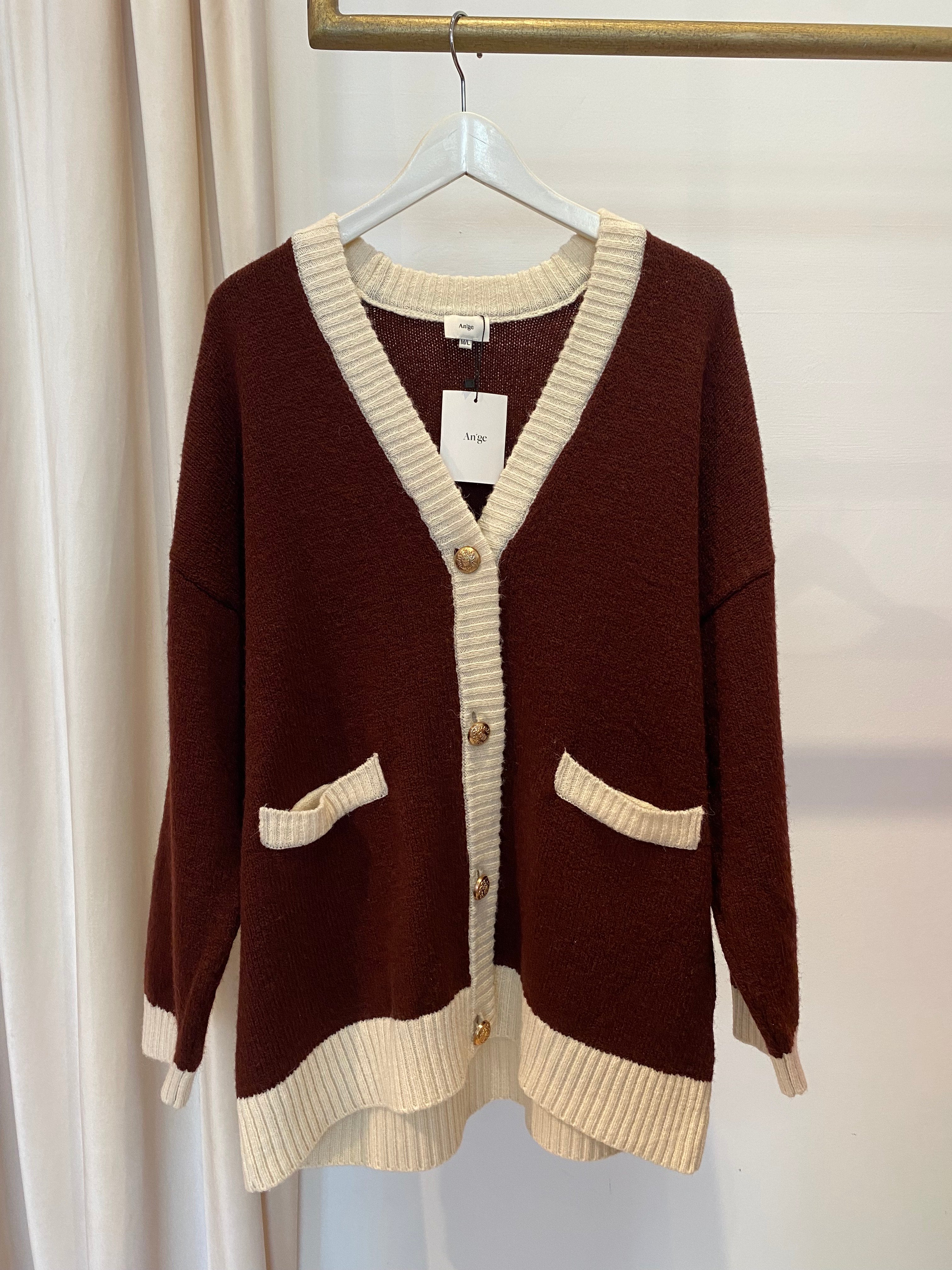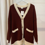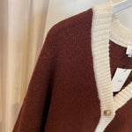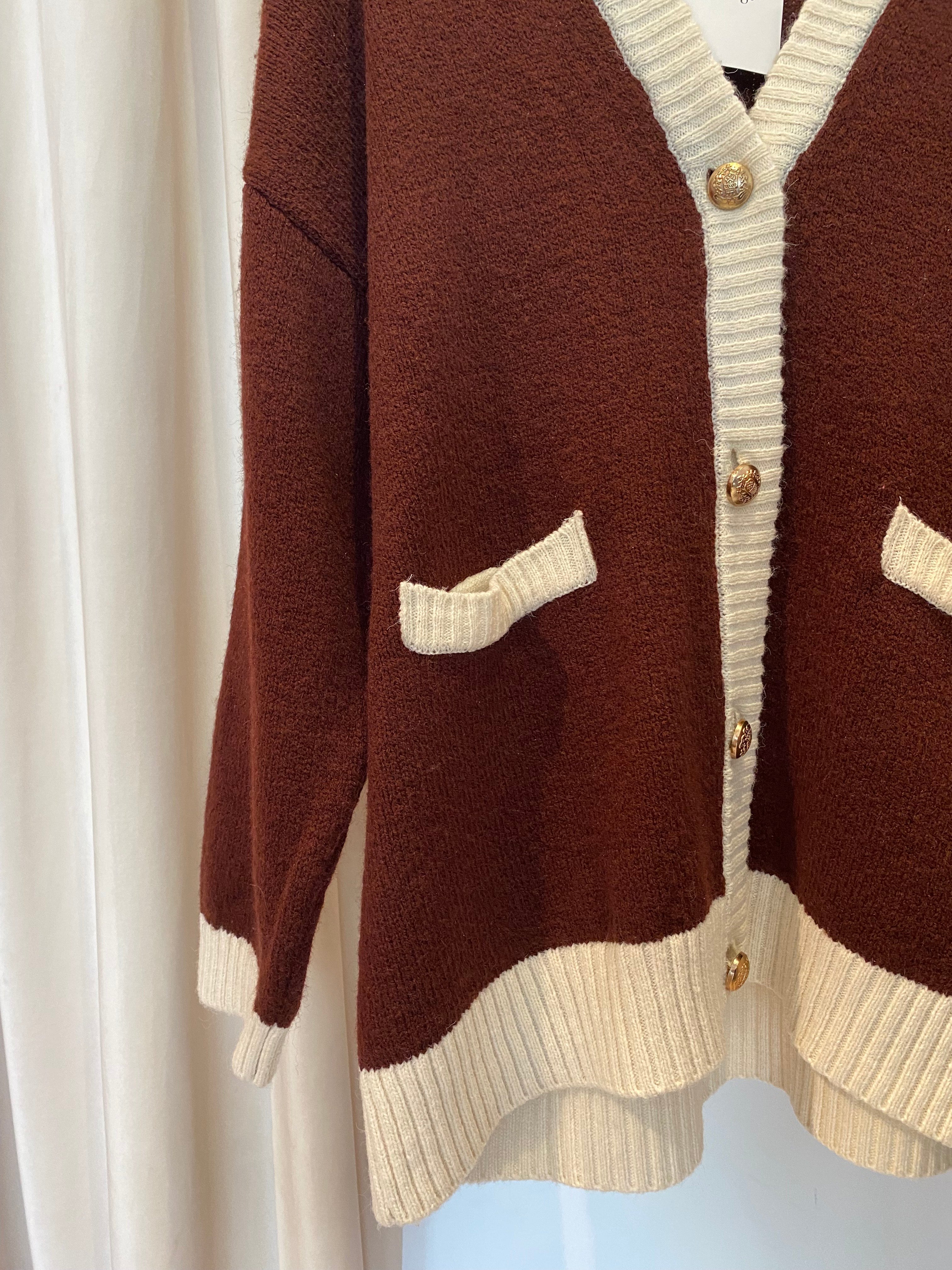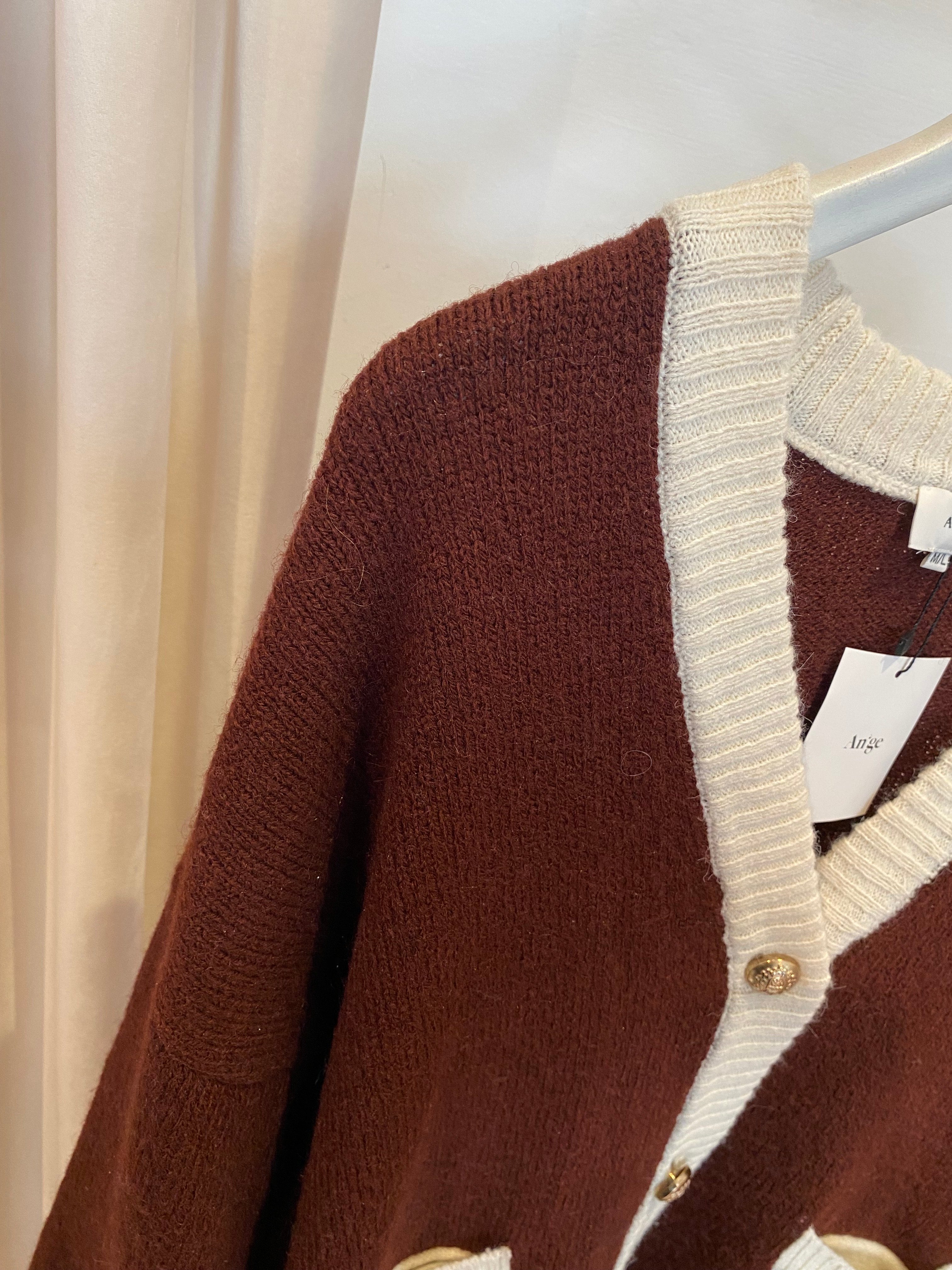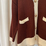 Casaco de malha castanho e bege. Bolsos à frente e botões.