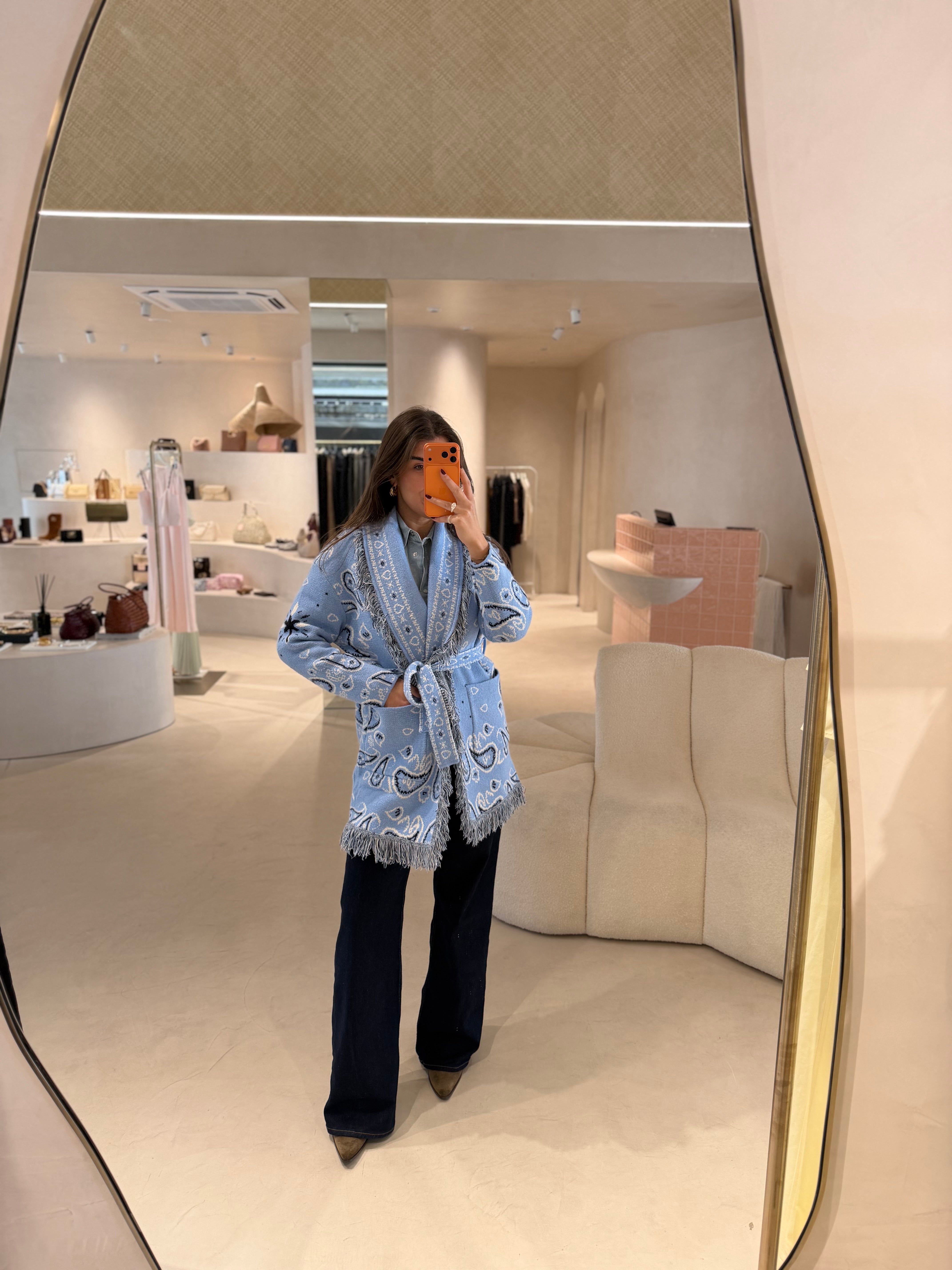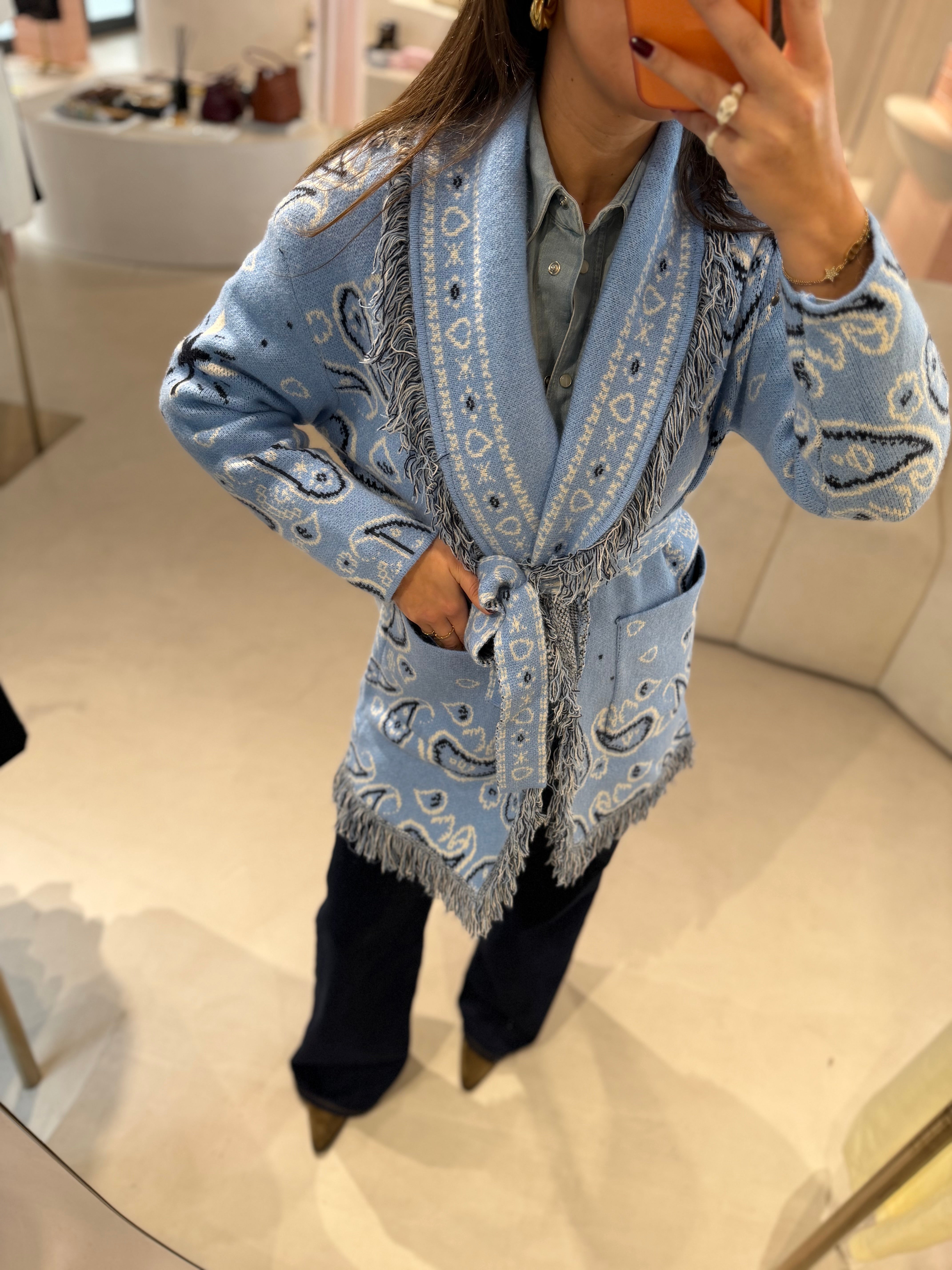 Casaco de Malha com Franjas Print Bandana Azul Claro | VIOLETA