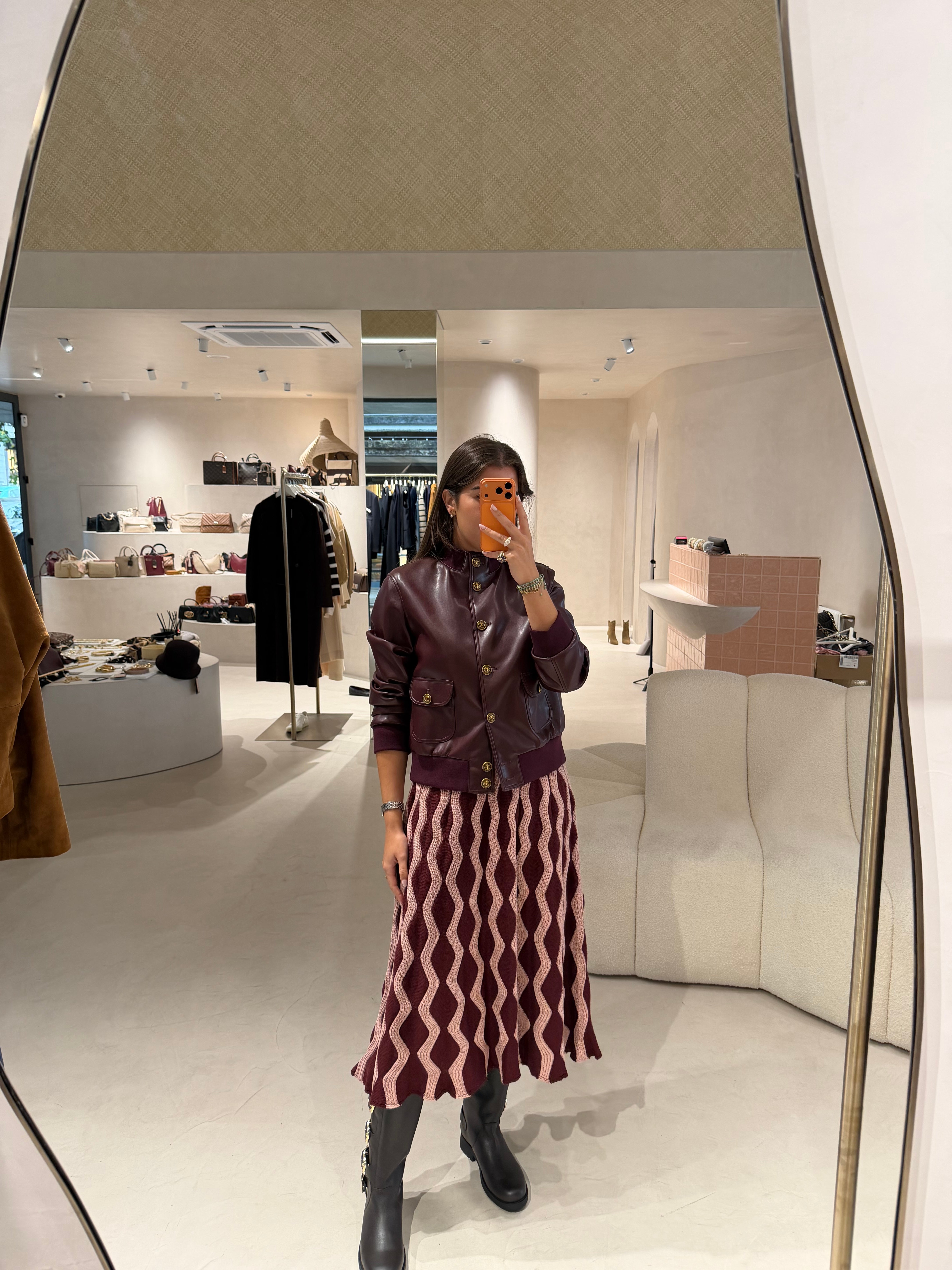 Esta jaqueta Twinset em pele sintética exibe um corte reto que se adapta a qualquer look. Destacam-se os botões de pressão com logótipo Oval T, os acabamentos em rib canalé nos punhos e barra, e os bolsos aplicados com pala, que combinam praticidade com design cuidado. Leve e elegante, é ideal para transitar entre estações com estilo italiano.