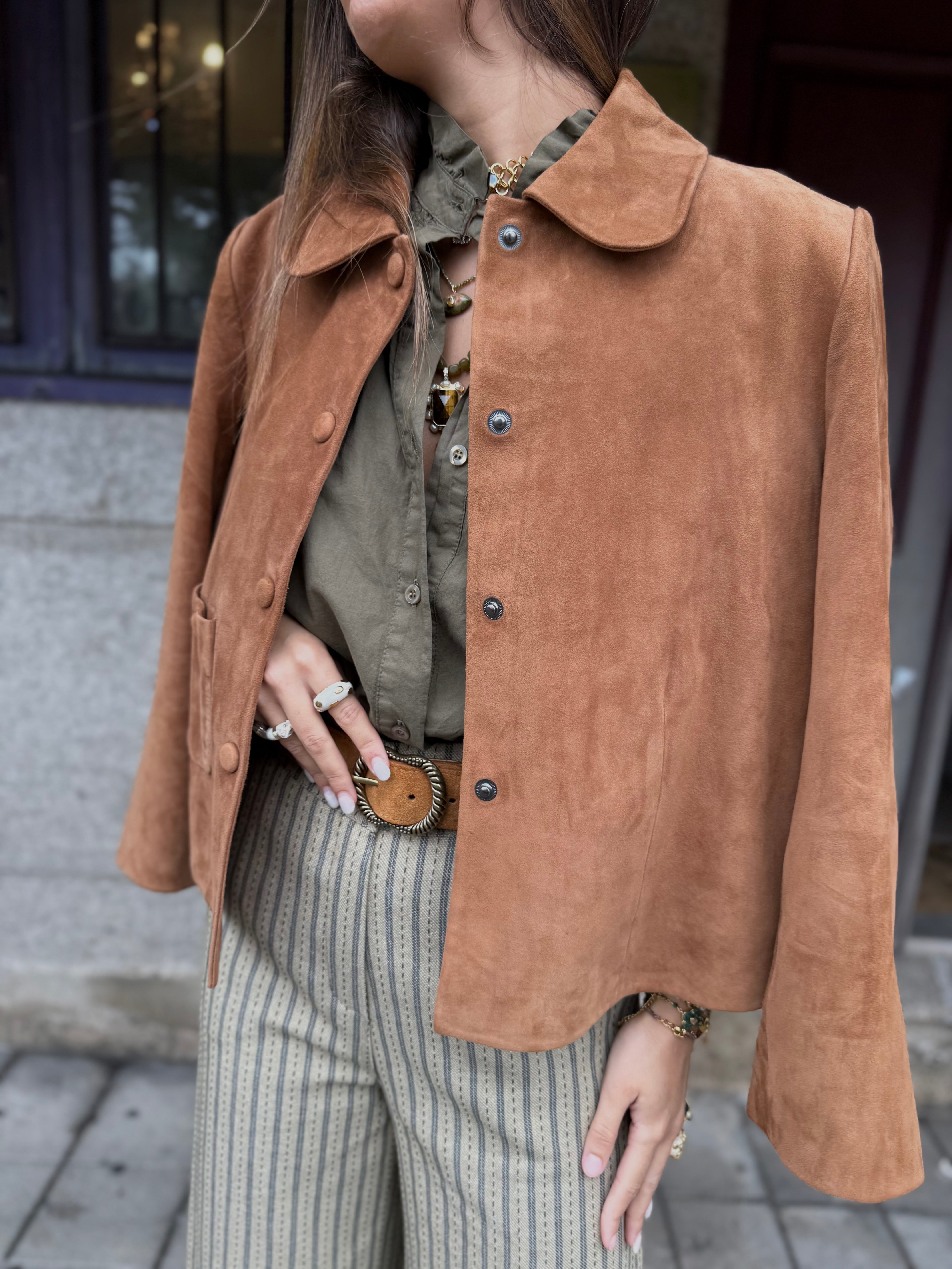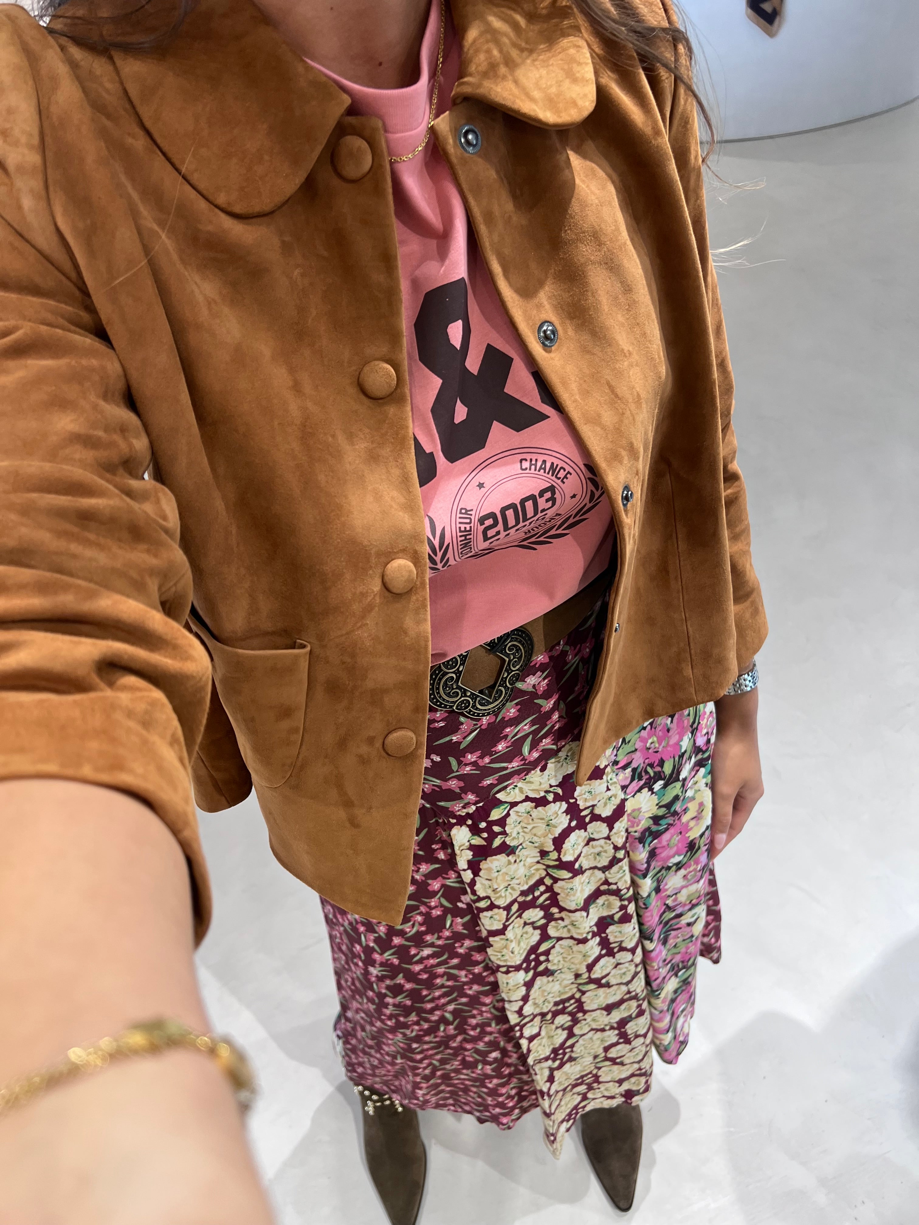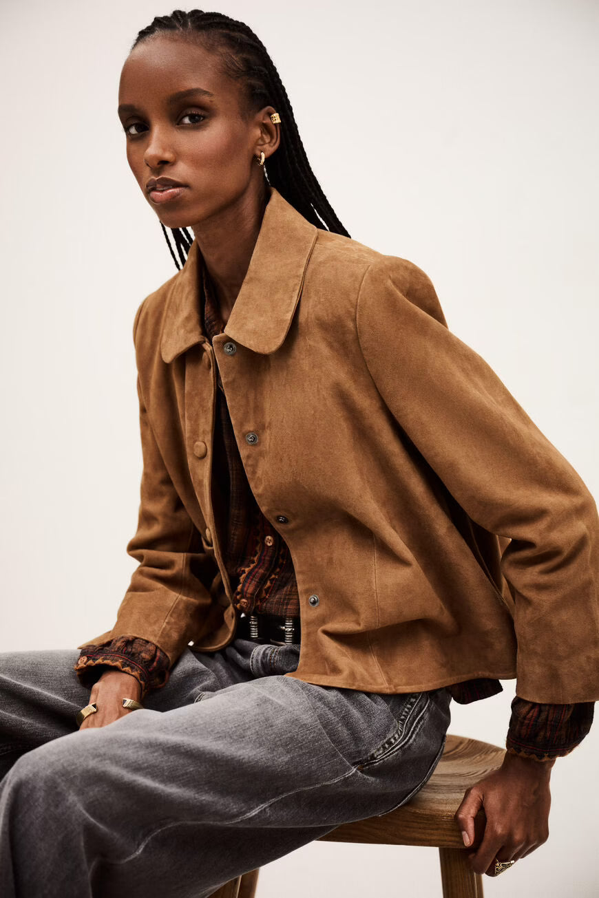 O casaco Milas em pele camel da ba&sh é uma peça essencial para quem procura aliar estilo e conforto. Com um corte direito e gola arredondada, apresenta um design simples e versátil que combina facilmente com várias roupas. O franzido nas costas adiciona um toque de volume, conferindo um caimento moderno e fluído.