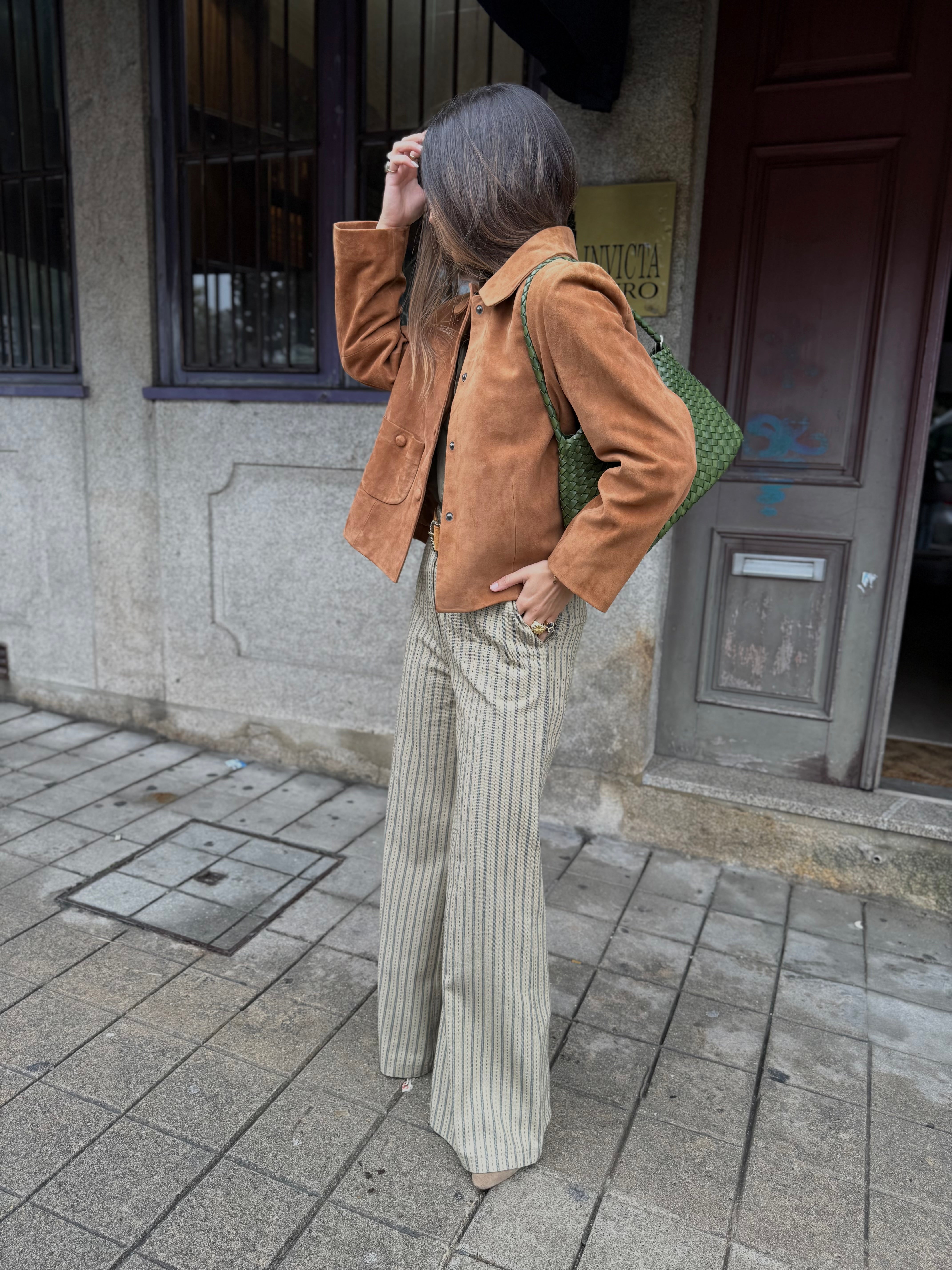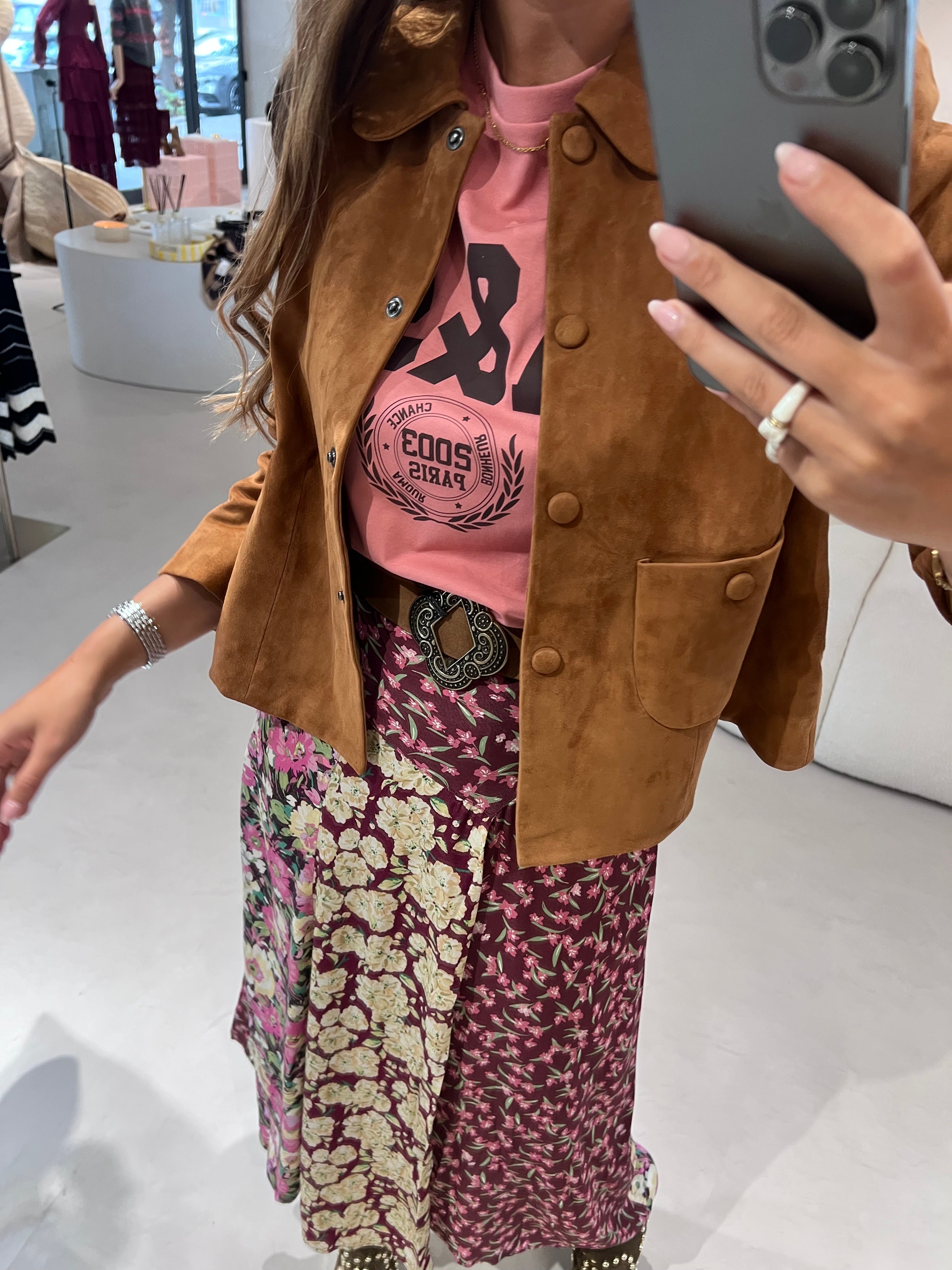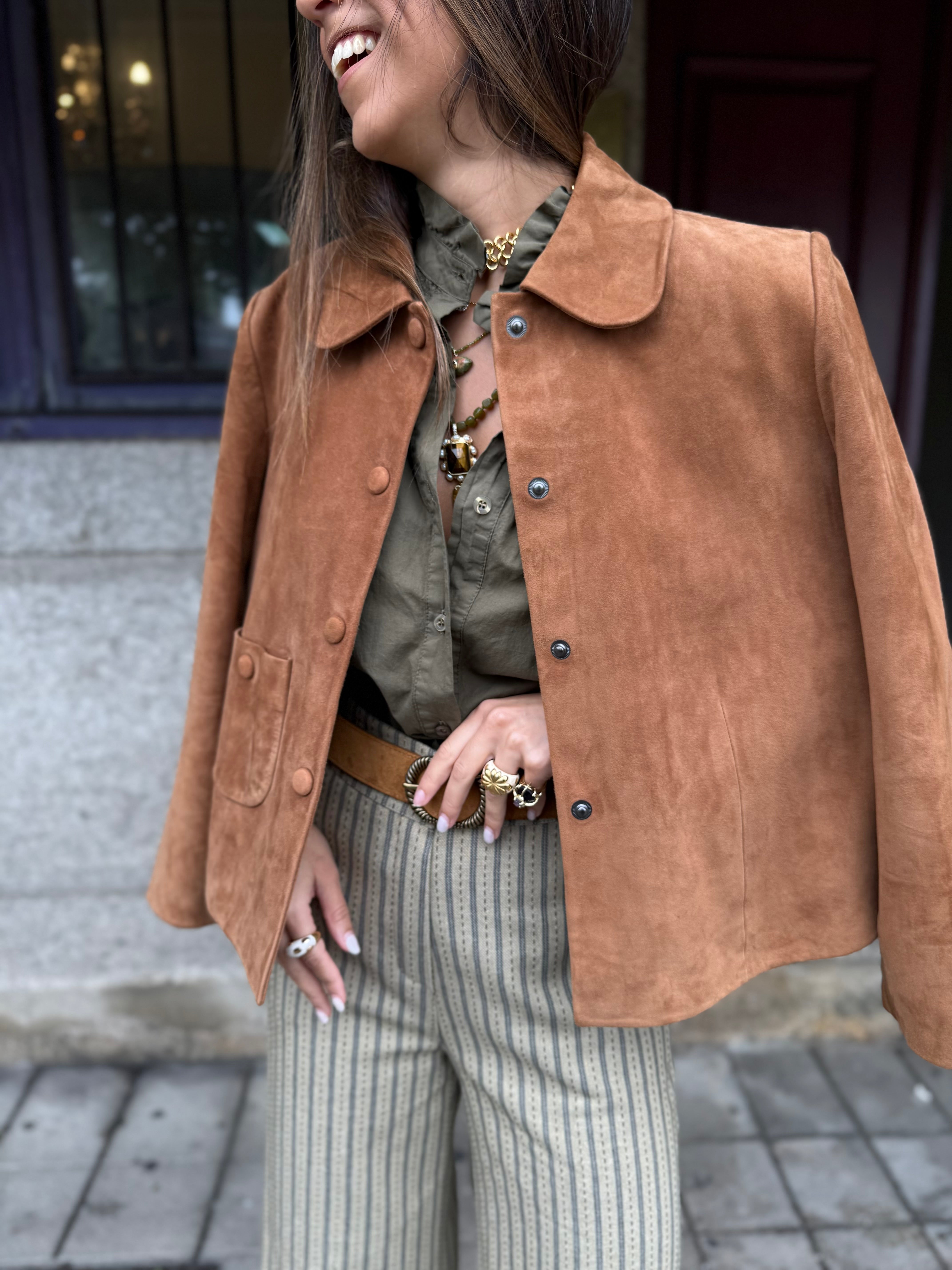 O casaco Milas em pele camel da ba&sh é uma peça essencial para quem procura aliar estilo e conforto. Com um corte direito e gola arredondada, apresenta um design simples e versátil que combina facilmente com várias roupas. O franzido nas costas adiciona um toque de volume, conferindo um caimento moderno e fluído.