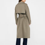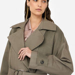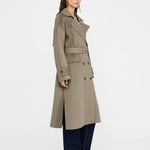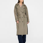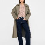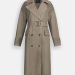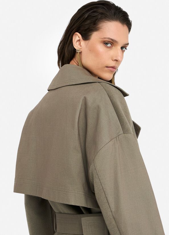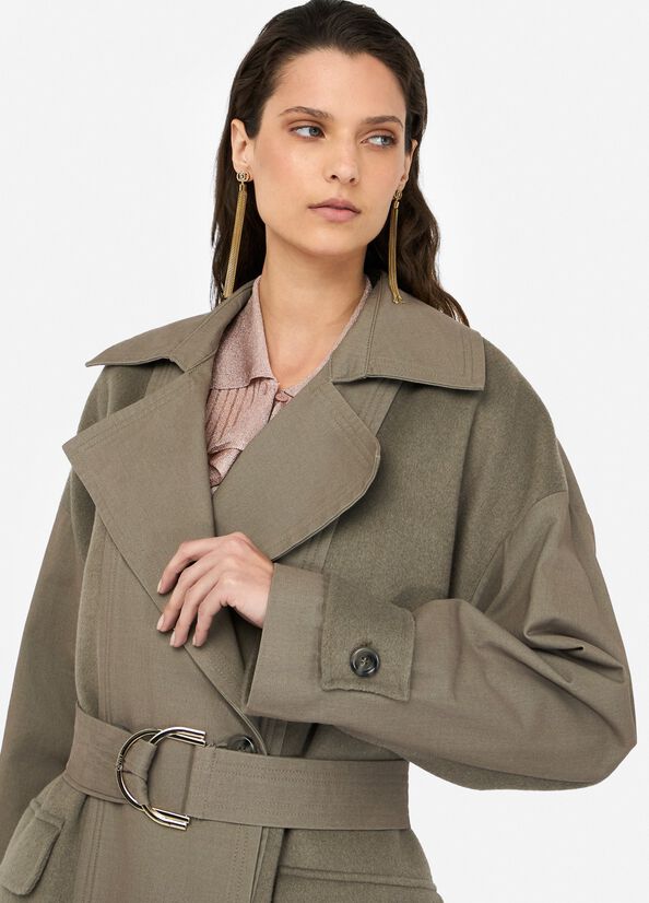 Casaco tipo trench de inspiração clássica, com corte duplo e tecido em mistura de lã e poliéster.